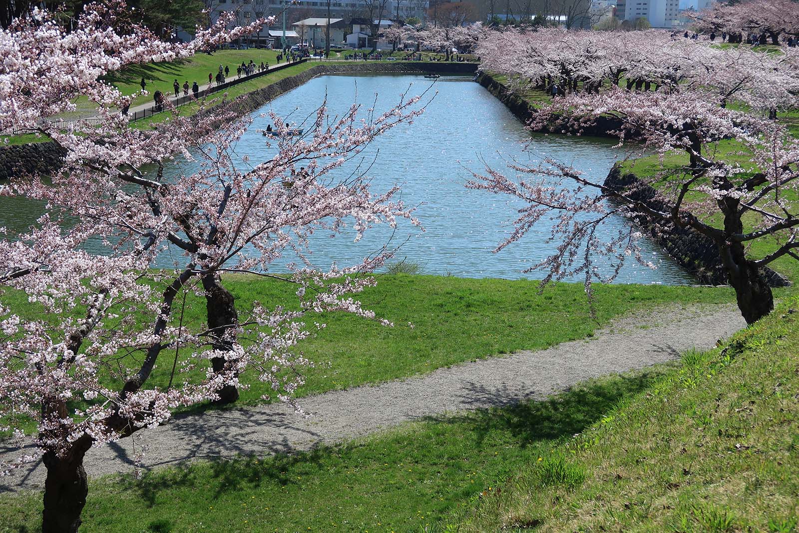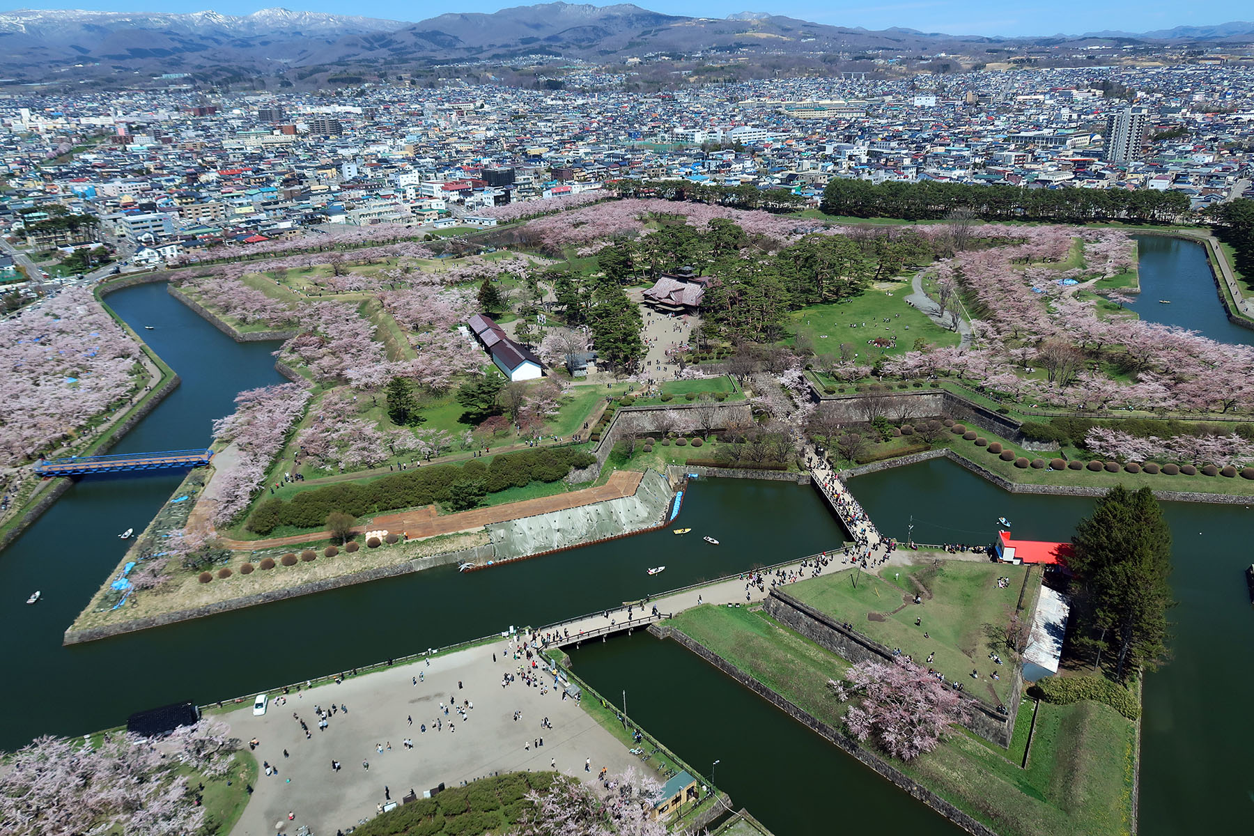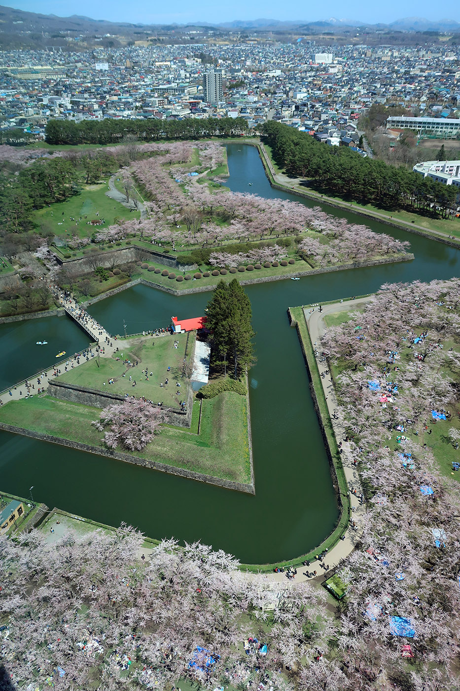 五稜郭タワーから見た桜が満開となっている五稜郭