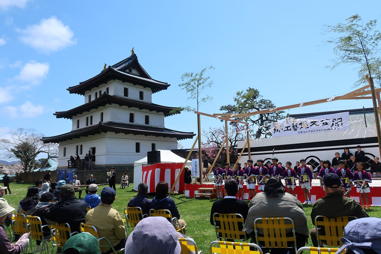 松前城の前で松前郷土芸能が公開されていた
