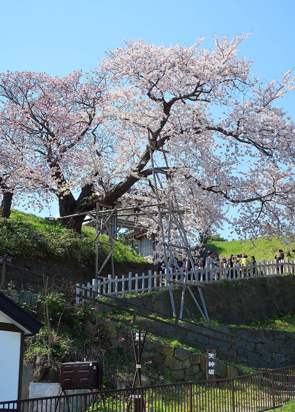 夫婦桜は天神坂門にある一本桜。ソメイヨシノとナデン(マツマエハヤサキ)が1本の根から育つ桜の木である。