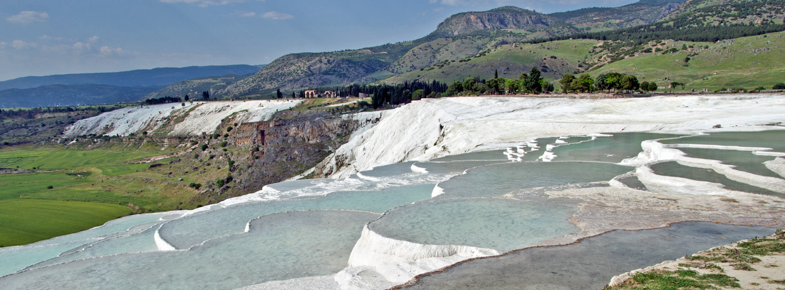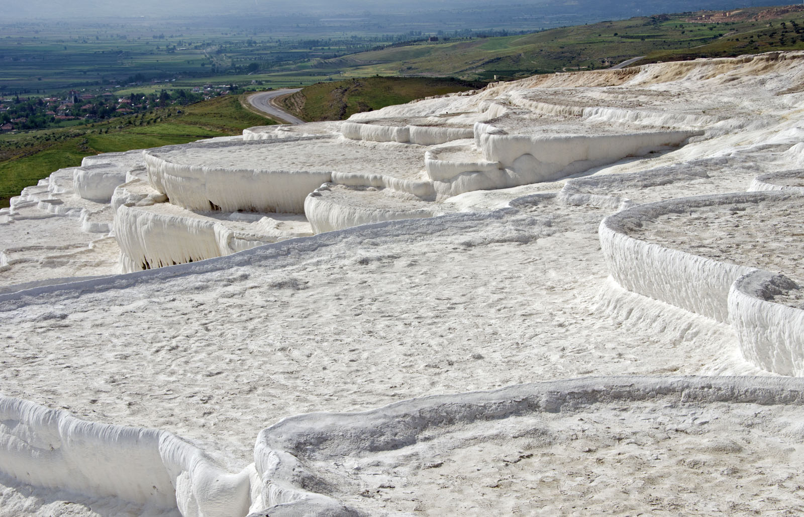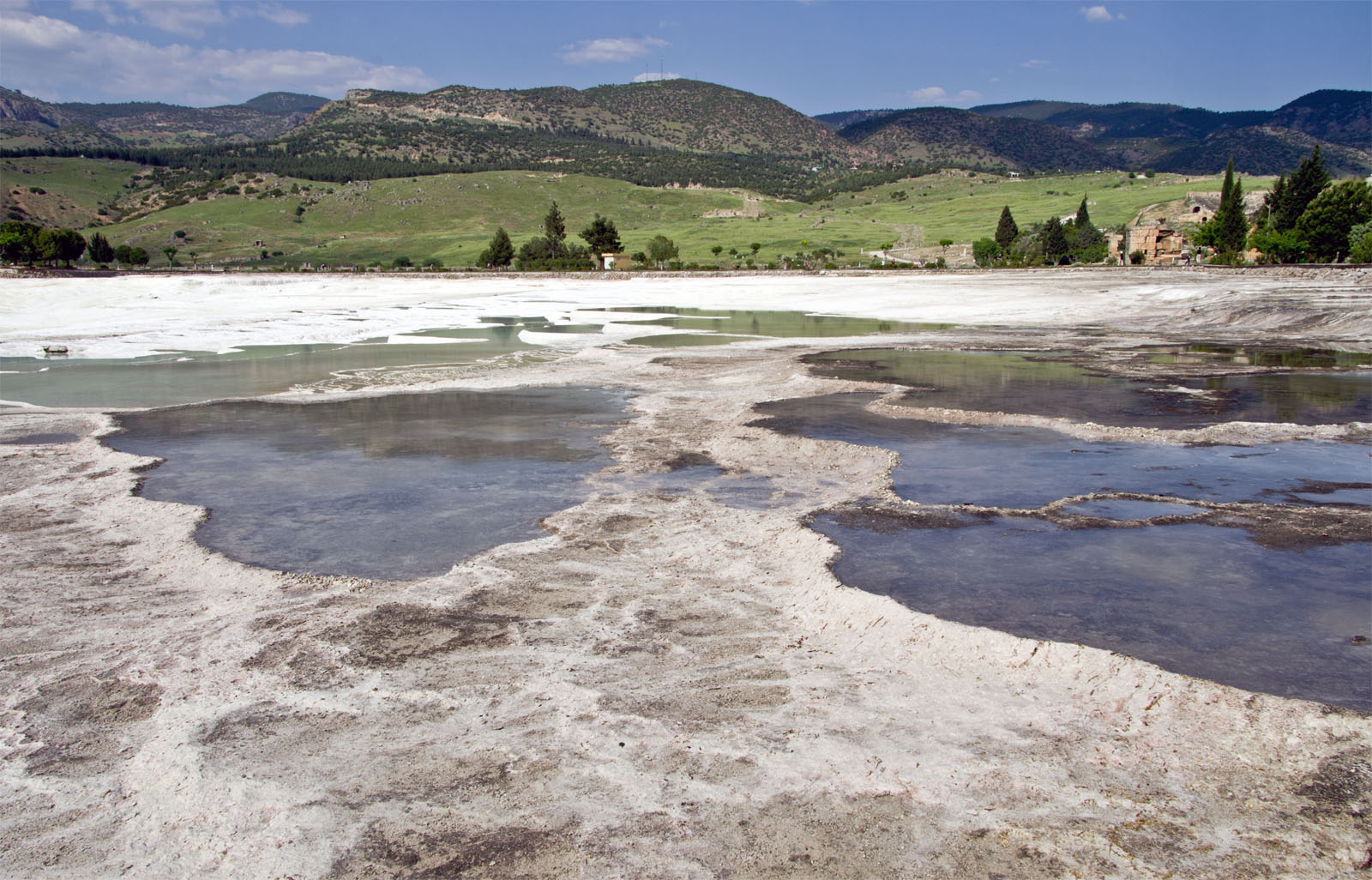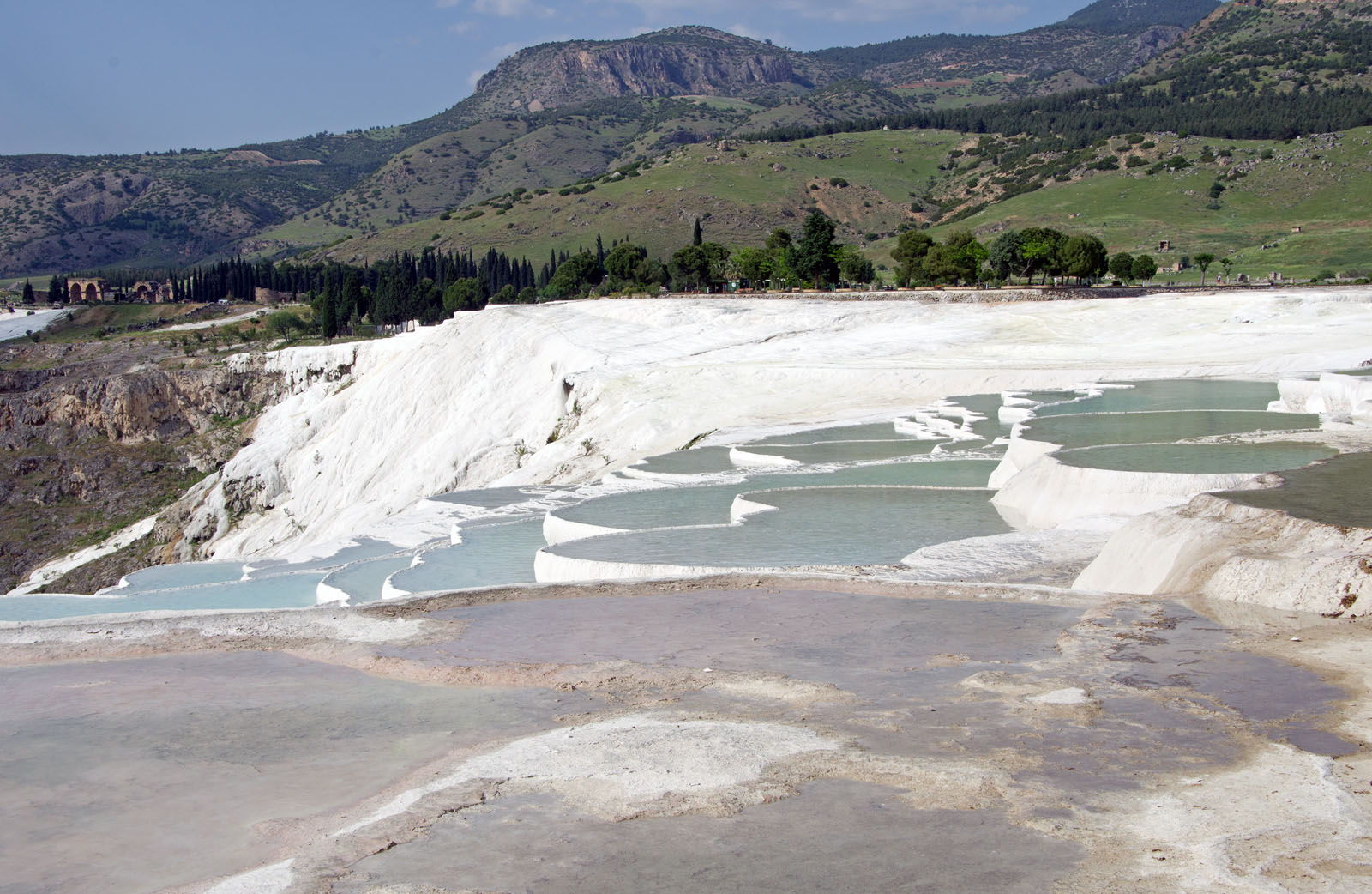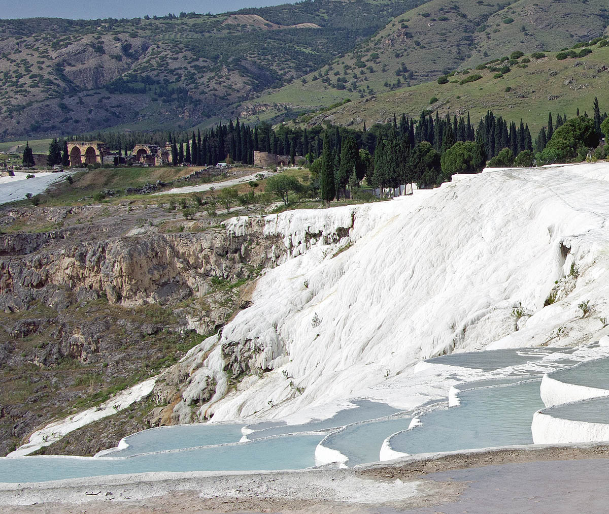 ヒエラポリス-パムッカレ トルコ西部・デニズリ県にあるユネスコの複合世界遺産 パムッカレは石灰華段丘からなる丘陵地の名前であり、2世紀頃にヒエラポリスというローマ帝国の都市があり、現在は遺跡が残る。