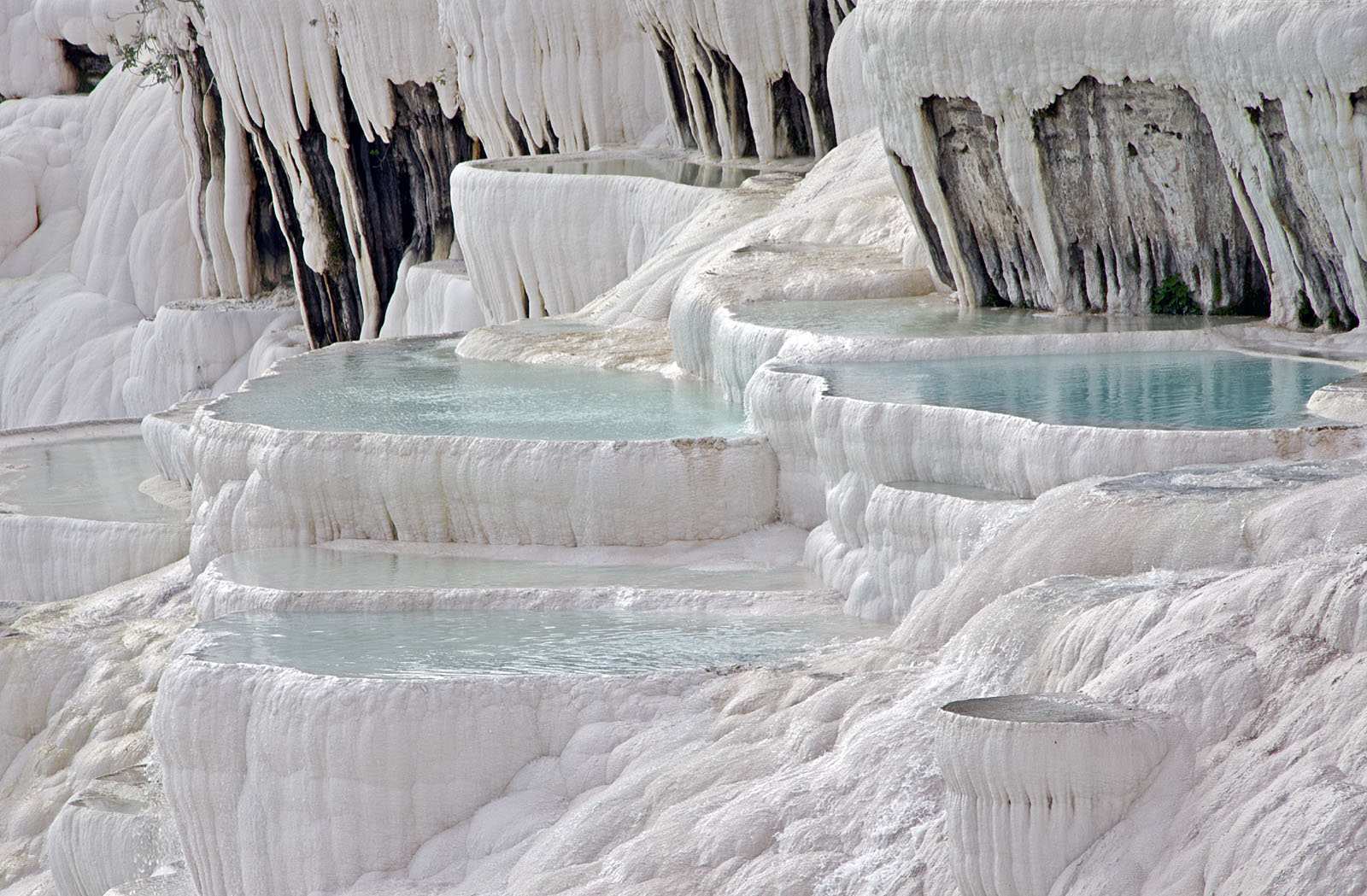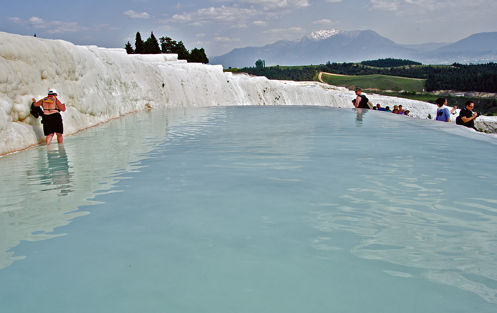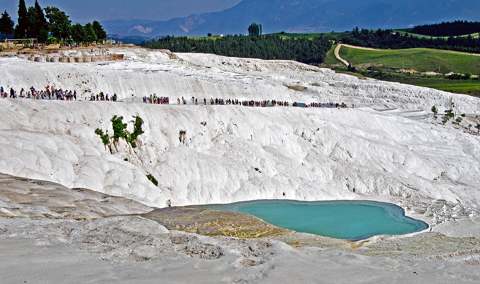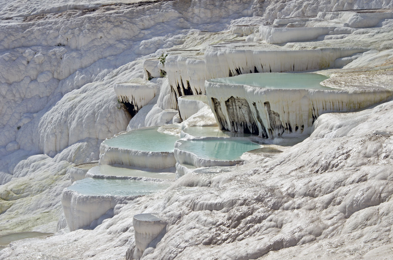 ヒエラポリス-パムッカレ トルコ西部・デニズリ県にあるユネスコの複合世界遺産 パムッカレは石灰華段丘からなる丘陵地の名前であり、2世紀頃にヒエラポリスというローマ帝国の都市があり、現在は遺跡が残る。