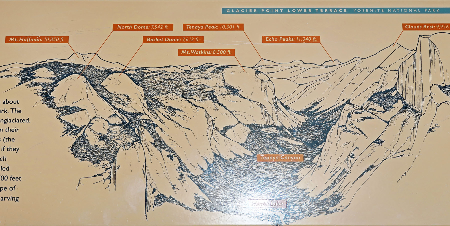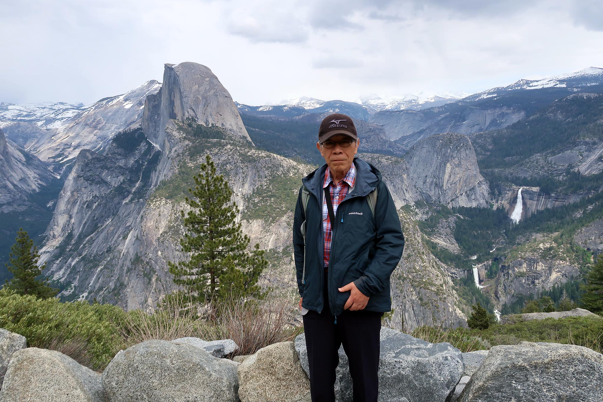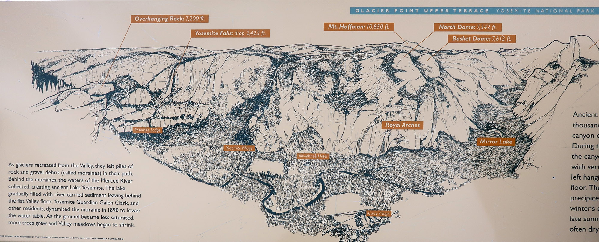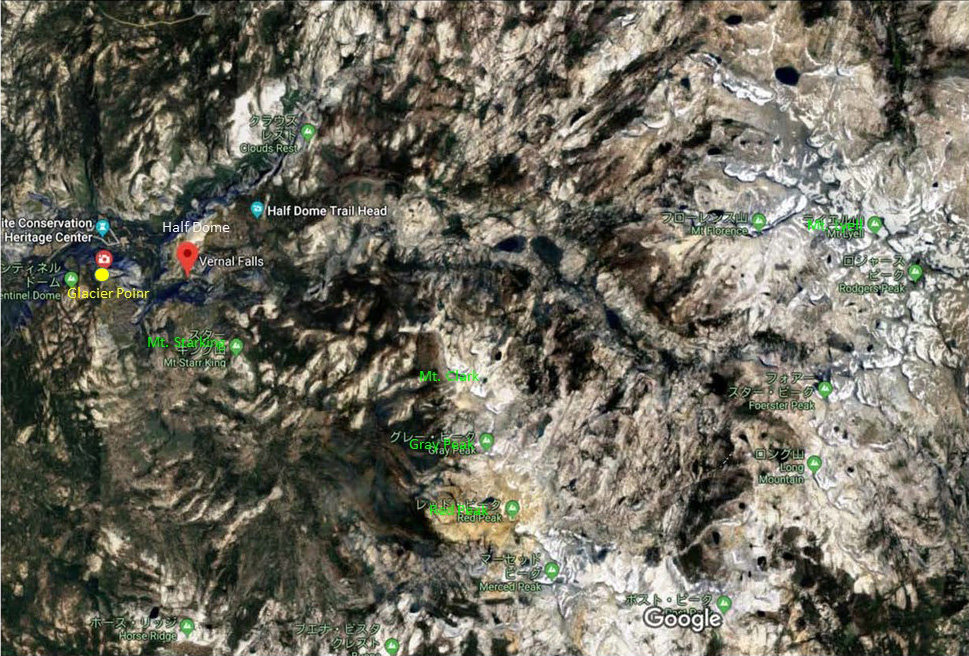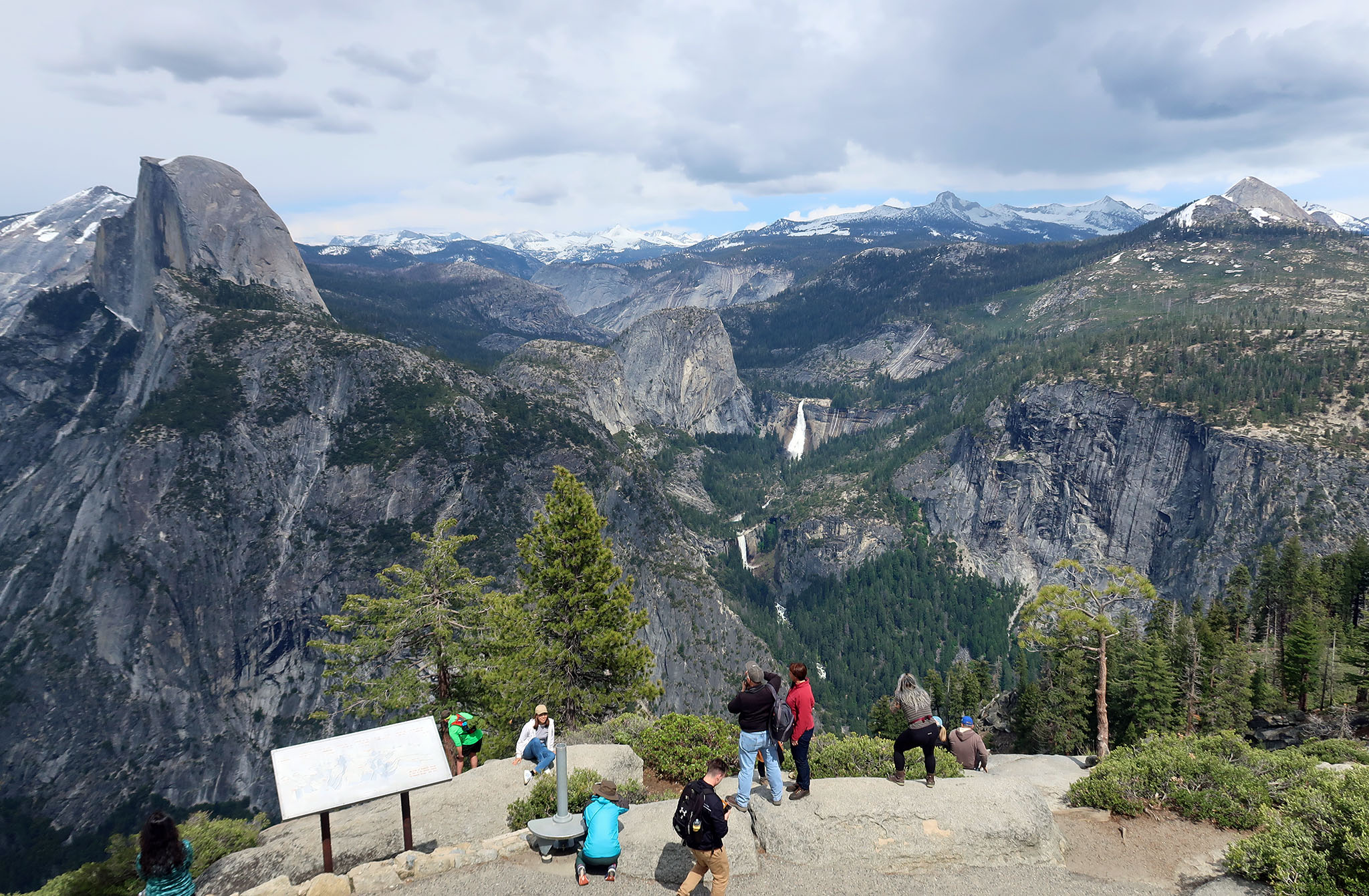 グレイシャーポイントは花崗岩でできた標高2,199mの断崖で、ヨセミテバレーを望むパノラマ展望台です。ここからは、ハーフドーム、クラウズレスト、リバティキャップ、バーナル滝、ネバダ滝、ヨセミテ滝などと周囲のハイシエラネバダ山脈の峰峰も見えます。ここはヨセミテで随一写真スポットです。ヨセミテバレーからシャトルバスで1時間ほど。バスのドライバーが説明してくれるが、もちろん早口の英語。 |