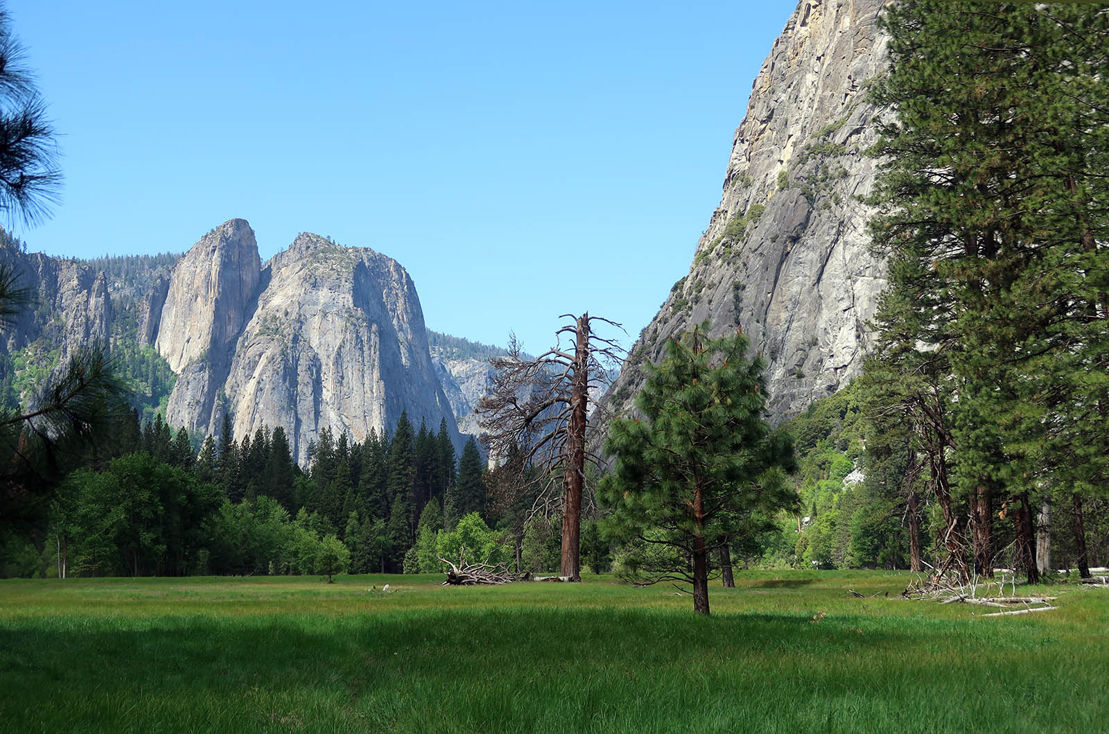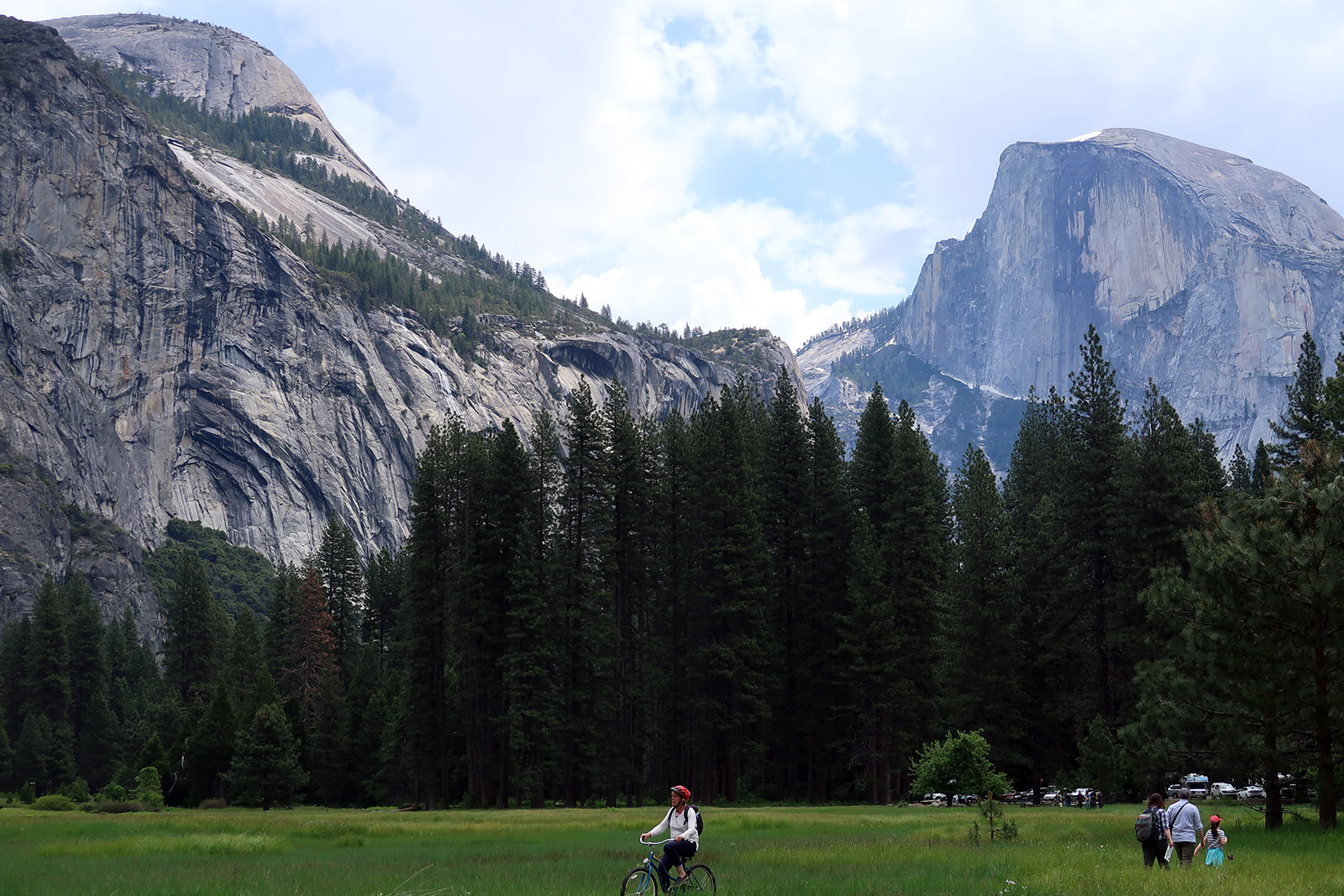 氷河に削られた巨大な谷「ヨセミテバレー」の絶景 左:エル・キャピタン, 奥:ハーフドーム, 右:センチネルロック, 右手前:カセドラルロック, ブライダルベール滝