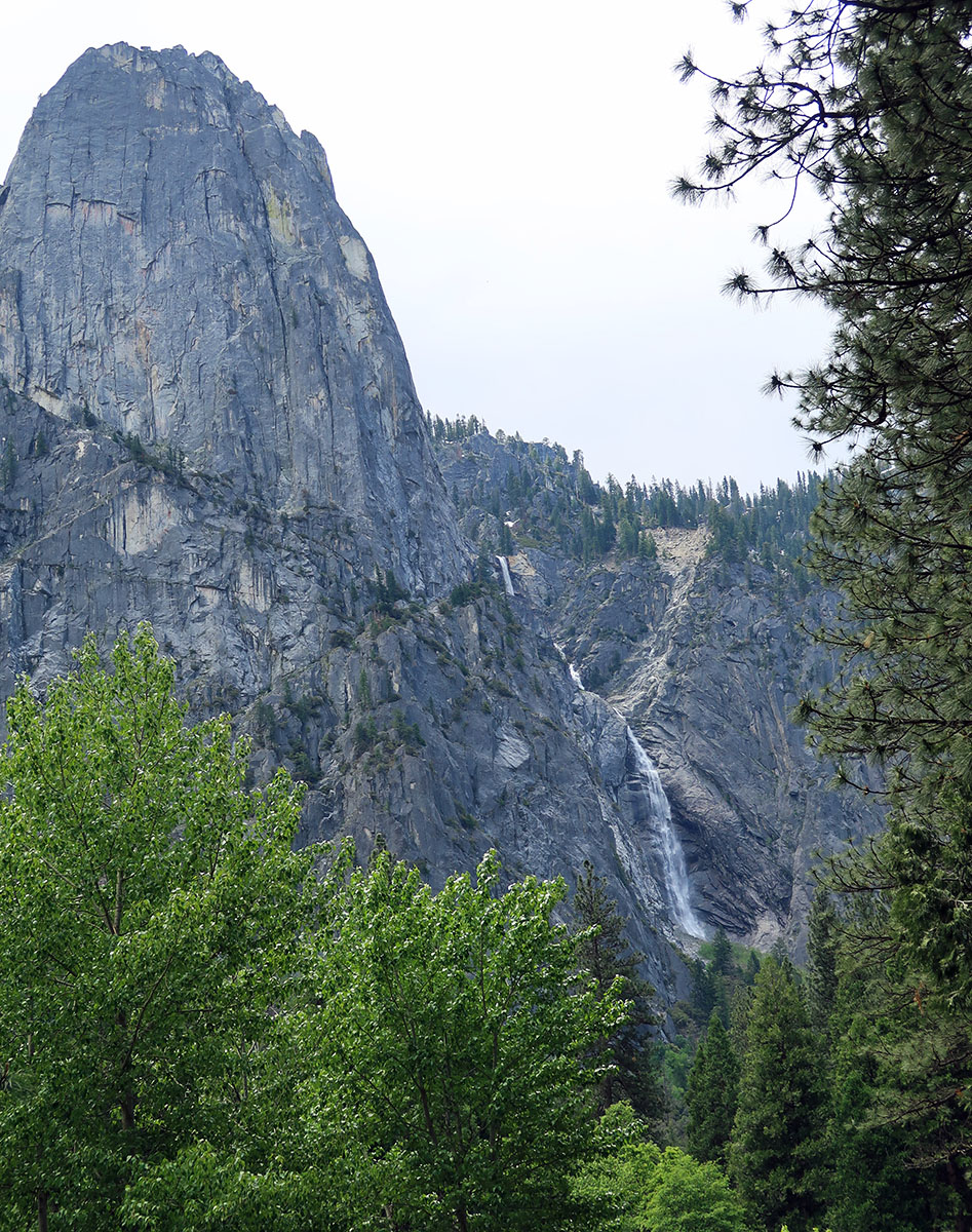 シエラネバダの峰峰 中央奥に最高峰ライエル山(3997m), ヴァーナル滝の上の丸い頂上がクラーク山 その右にグレーピーク, レッドピーク, 右手前がスターキング山
