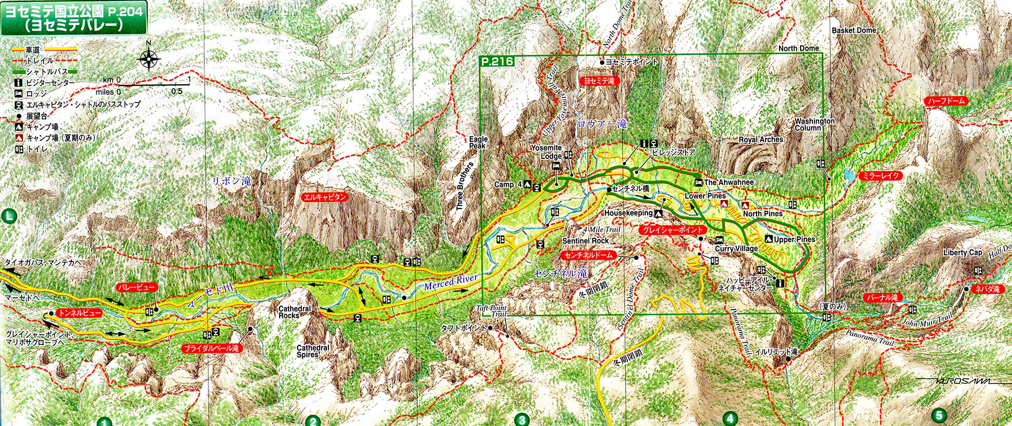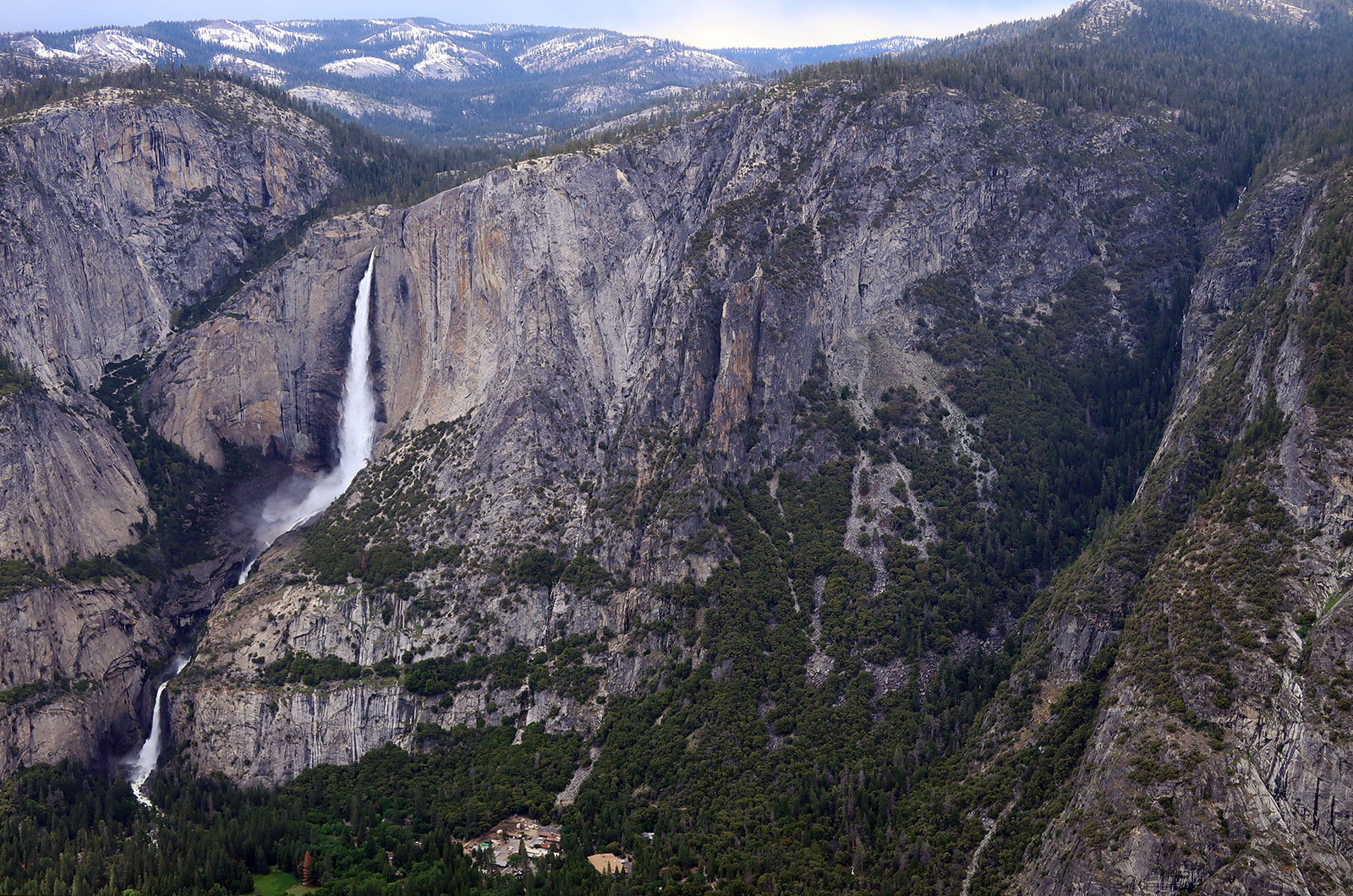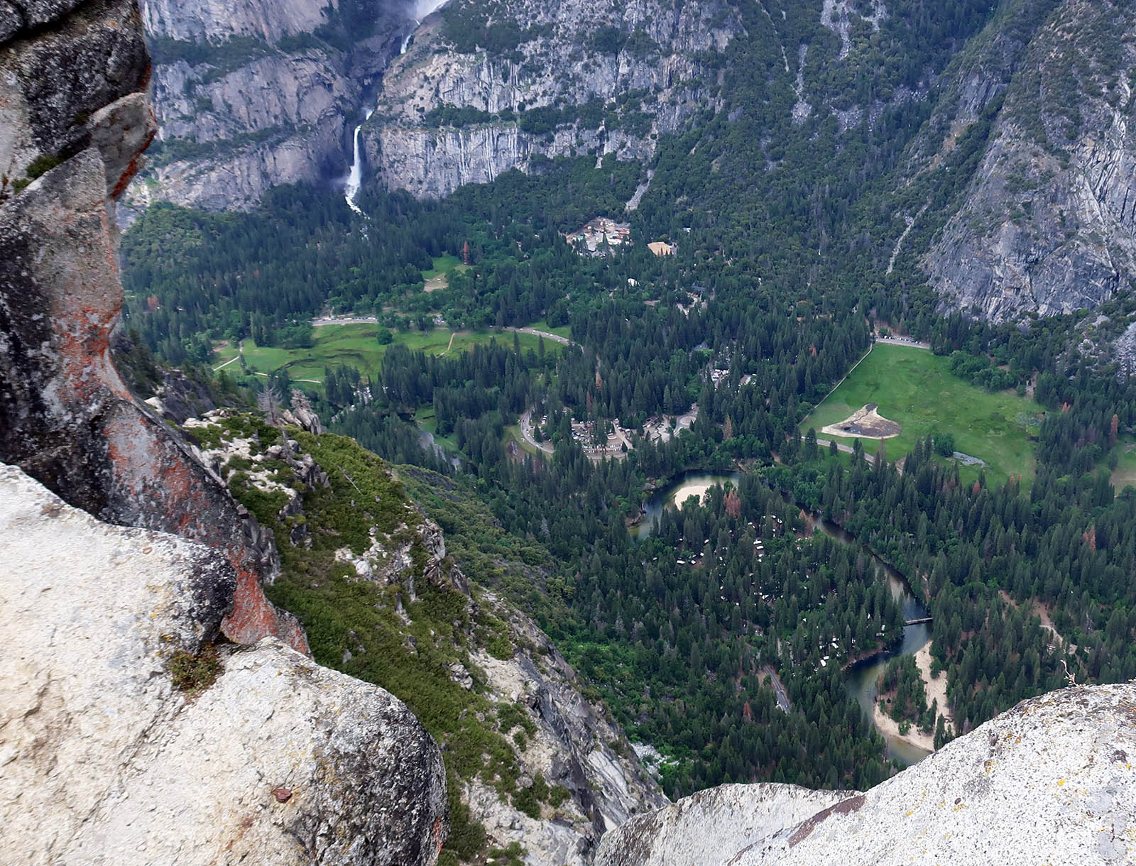 ヨセミテビレッジを見下ろす マーセド川や午前に歩いた草原や河原が見える
