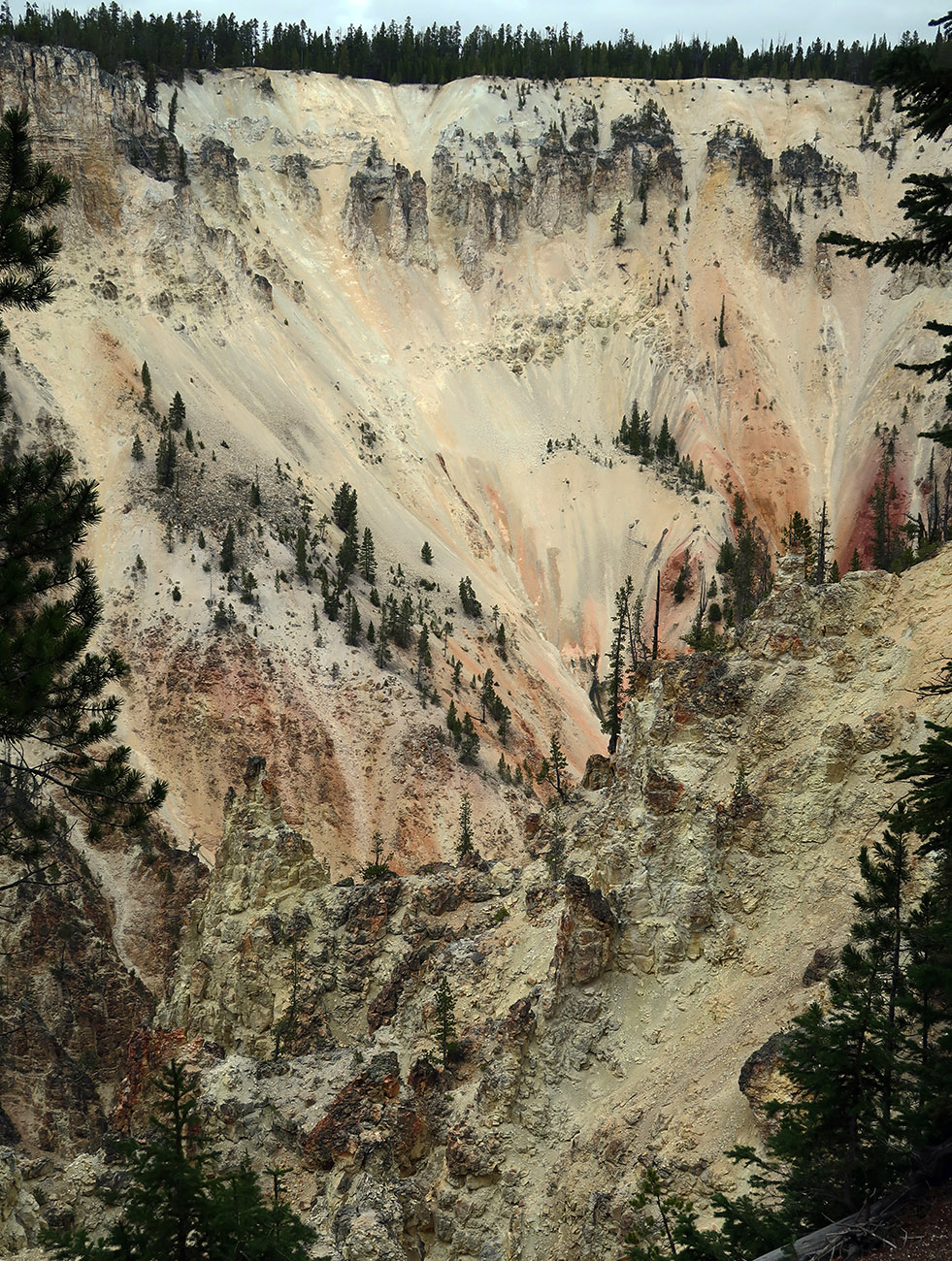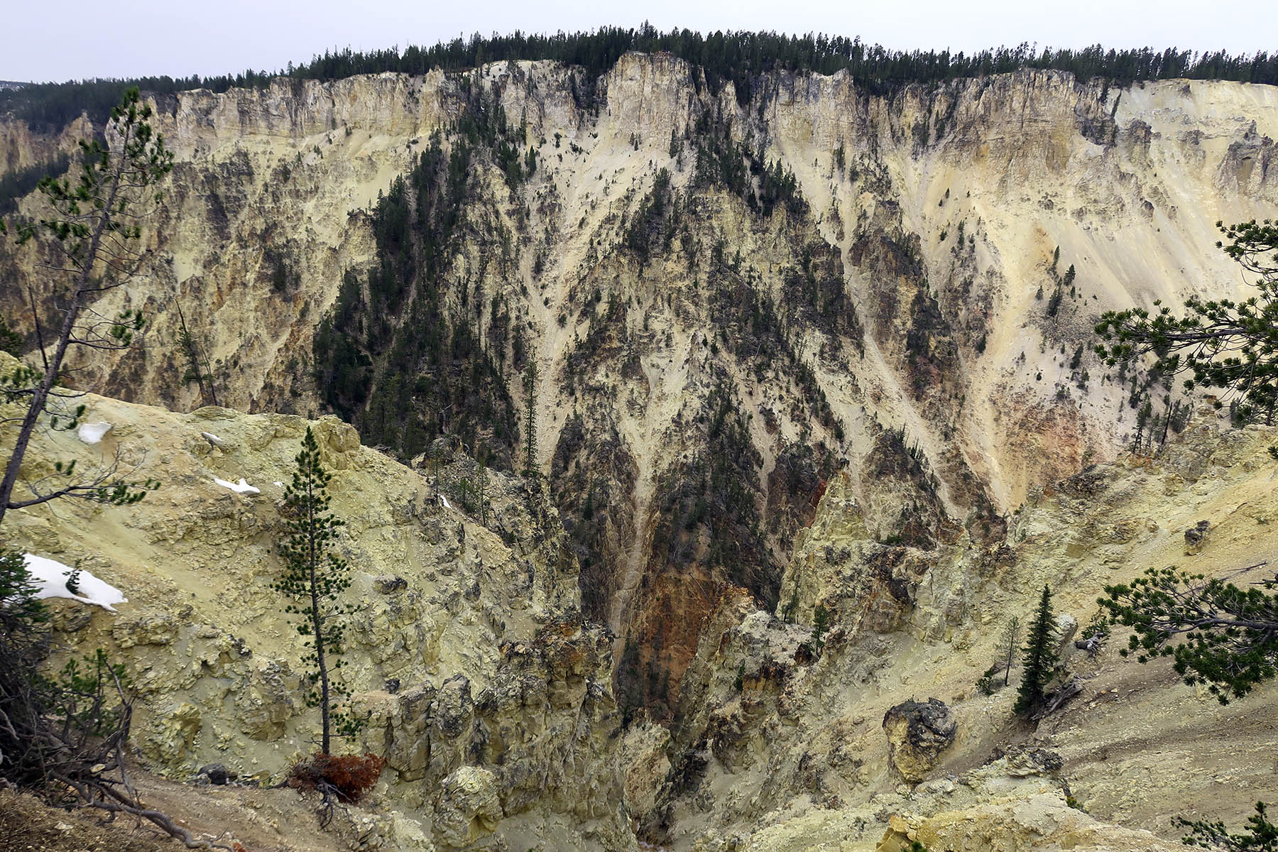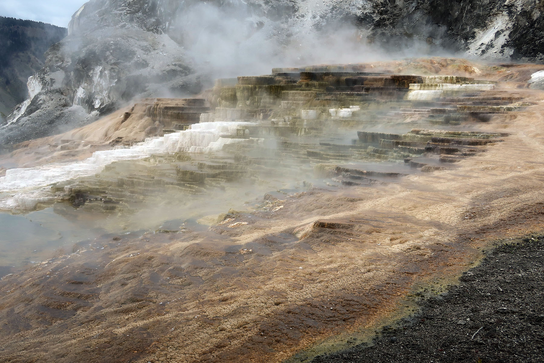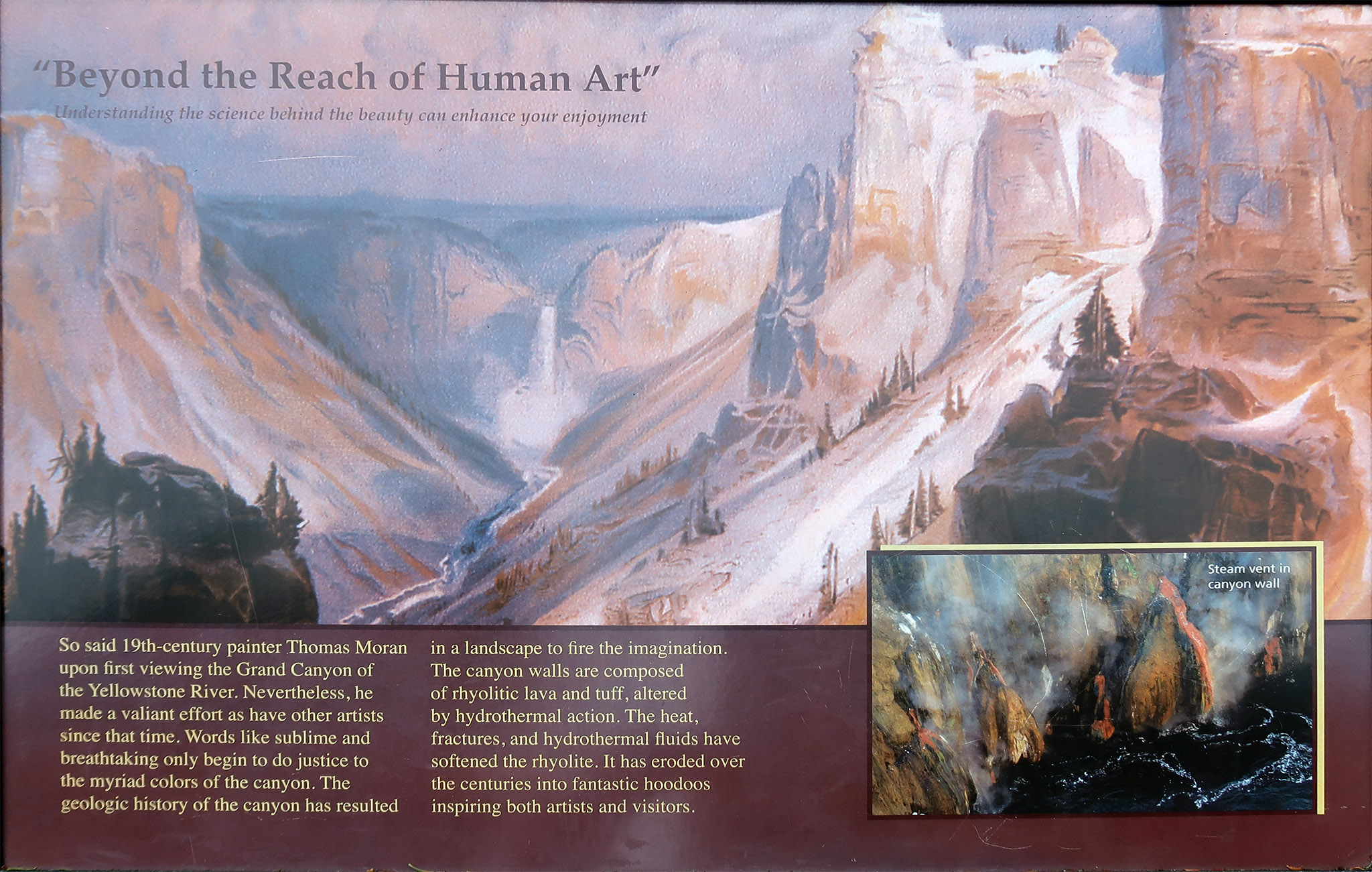 約59万年前に 流紋岩の溶岩が東方から流れてきて現在の渓谷を覆ったが、 それで地下から噴出す水蒸気やガスを閉じ込められず、流紋岩を脆弱化させ黄色く変色させとなった。溶岩が流れをせき止め湖を形成したが湖は氾濫し、流紋岩を侵食しイエローストーン渓谷を形成していった。その後氷河の形成と融解が繰り返され、1万4千年前に現在の景観となった。 |