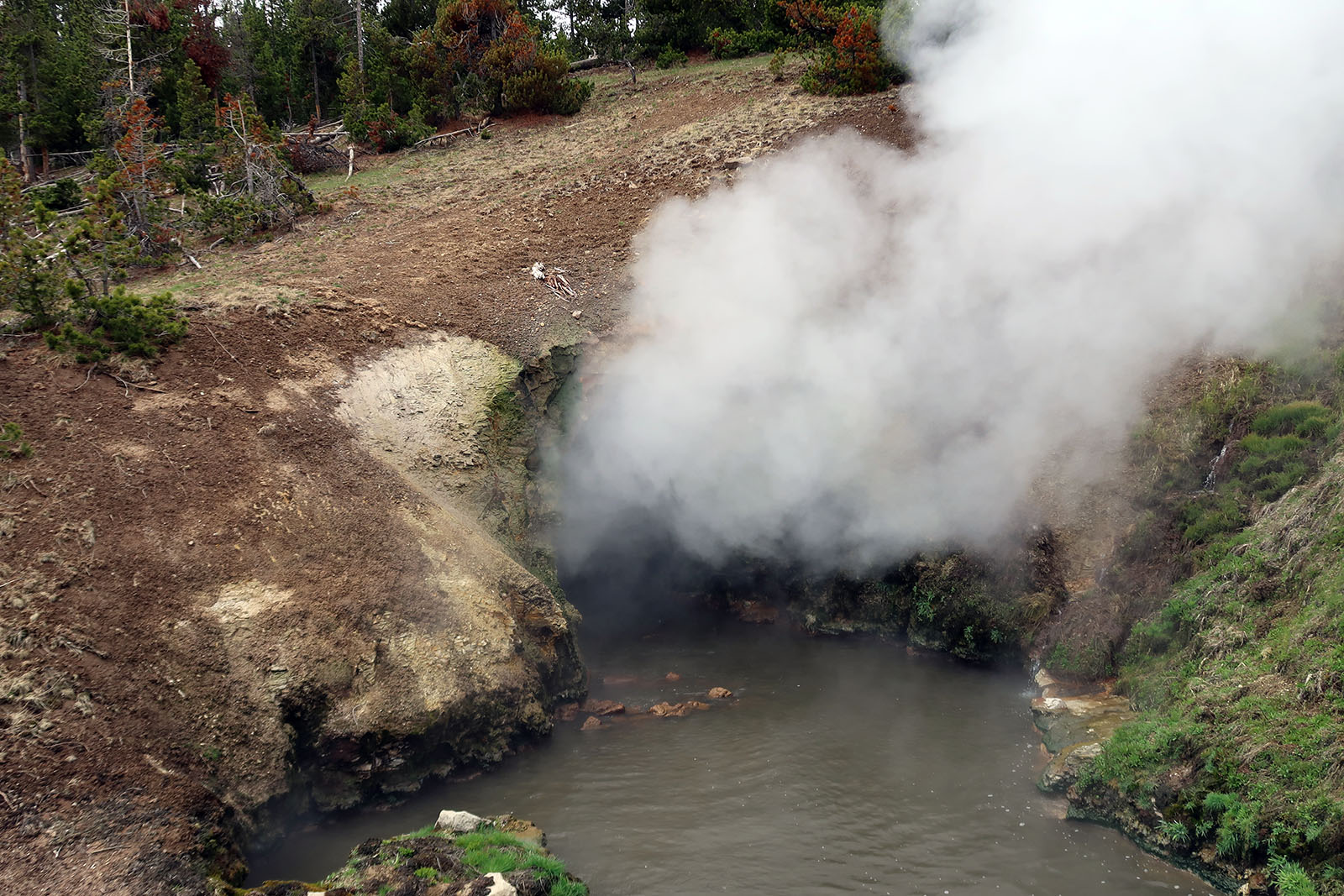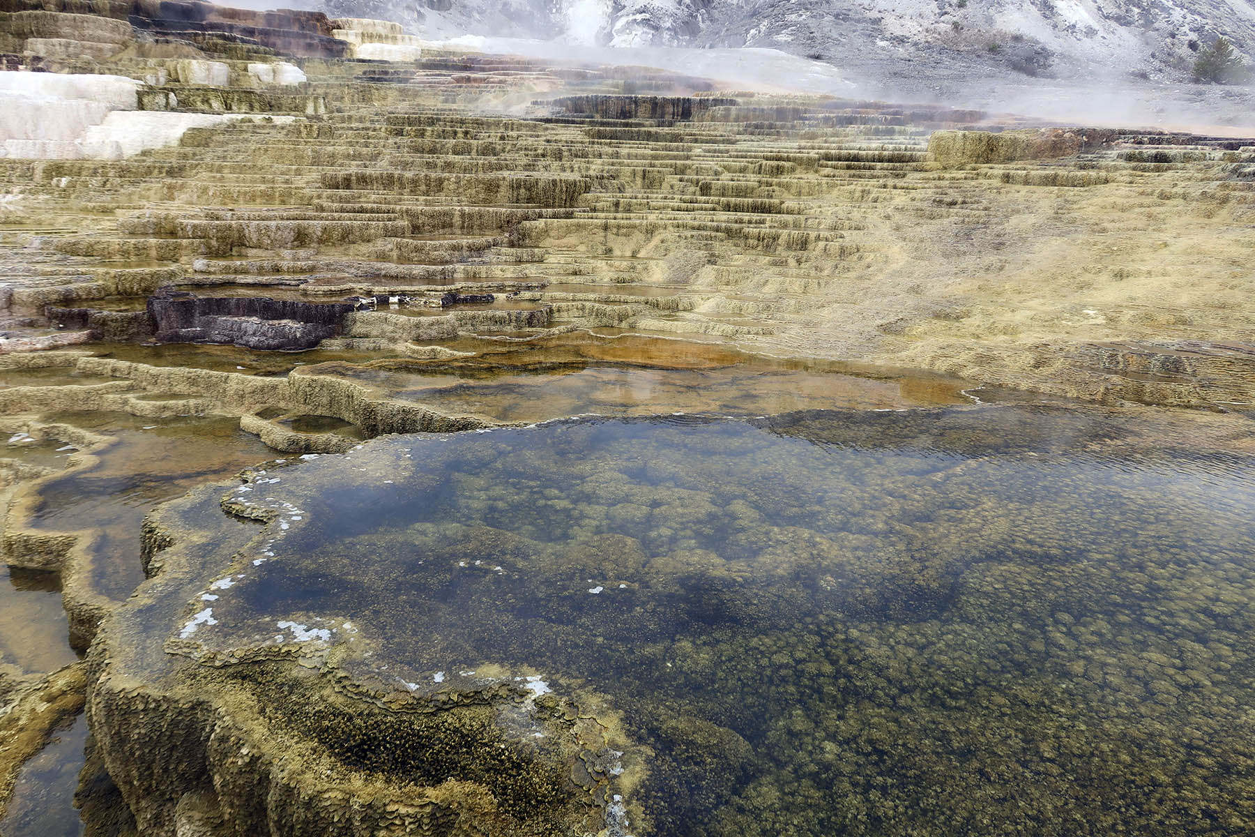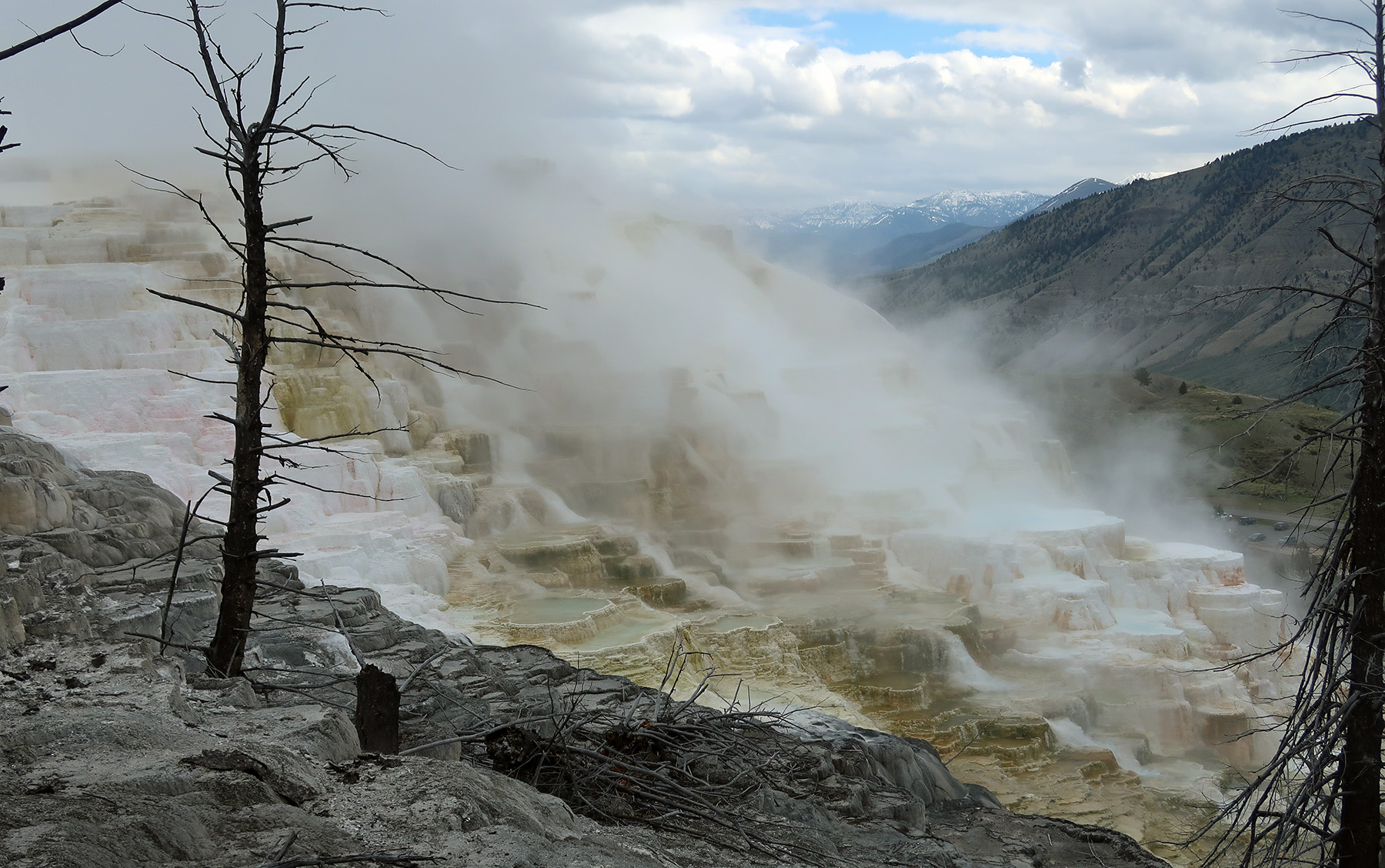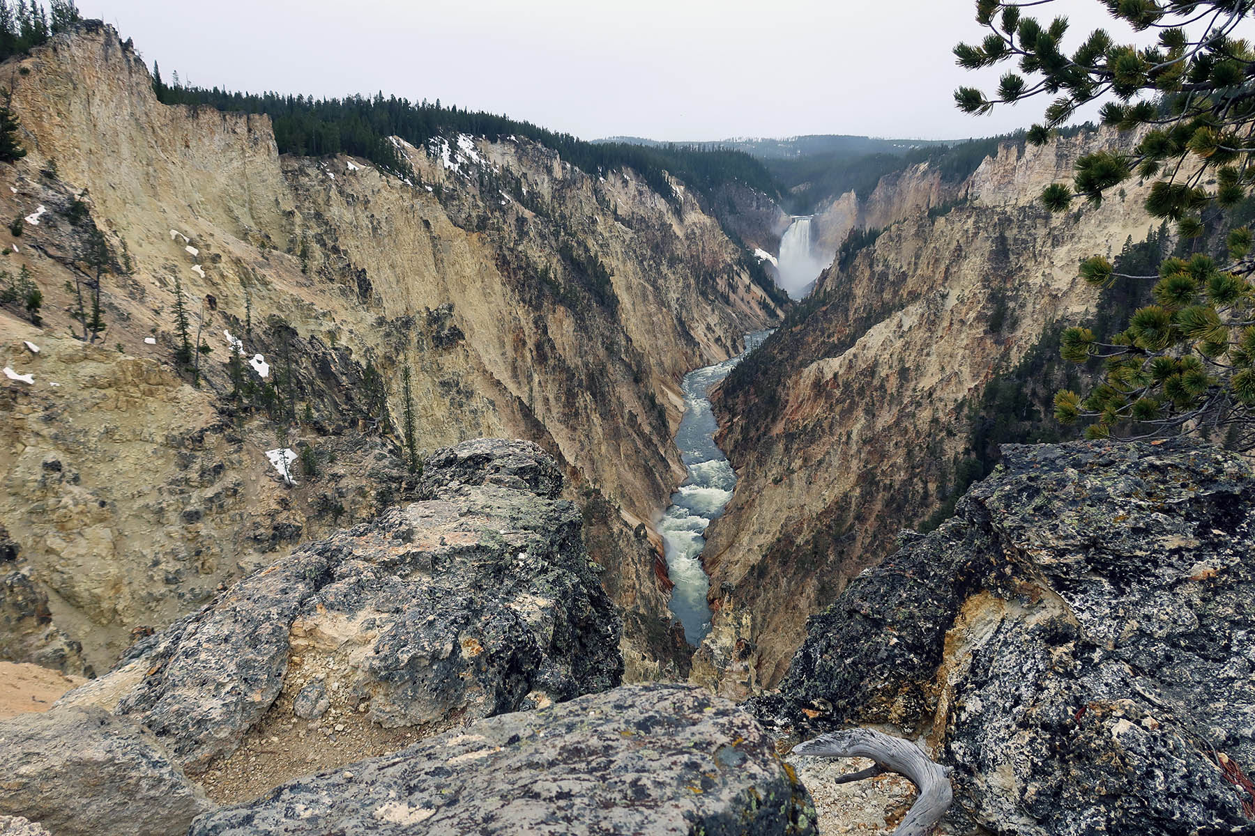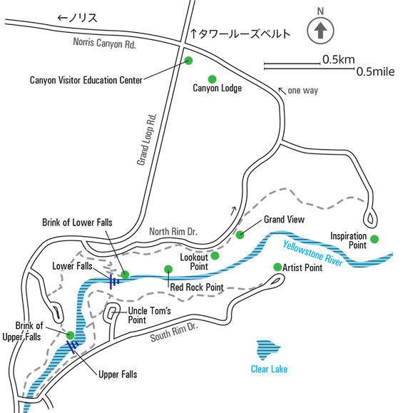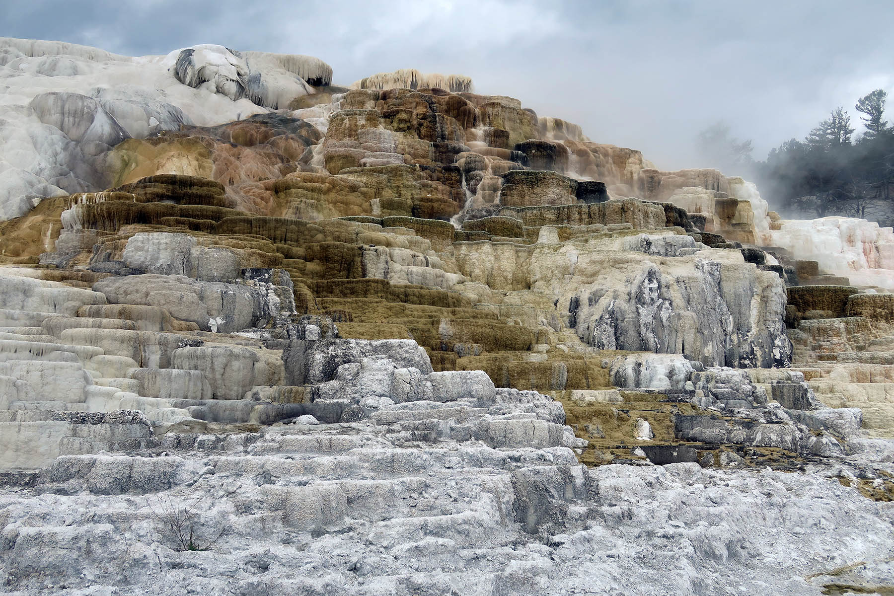 約59万年前に 流紋岩の溶岩が東方から流れてきて現在の渓谷を覆ったが、 それで地下から噴出す水蒸気やガスを閉じ込められず、流紋岩を脆弱化させ黄色く変色させとなった。溶岩が流れをせき止め湖を形成したが湖は氾濫し、流紋岩を侵食しイエローストーン渓谷を形成していった。その後氷河の形成と融解が繰り返され、1万4千年前に現在の景観となった。 |