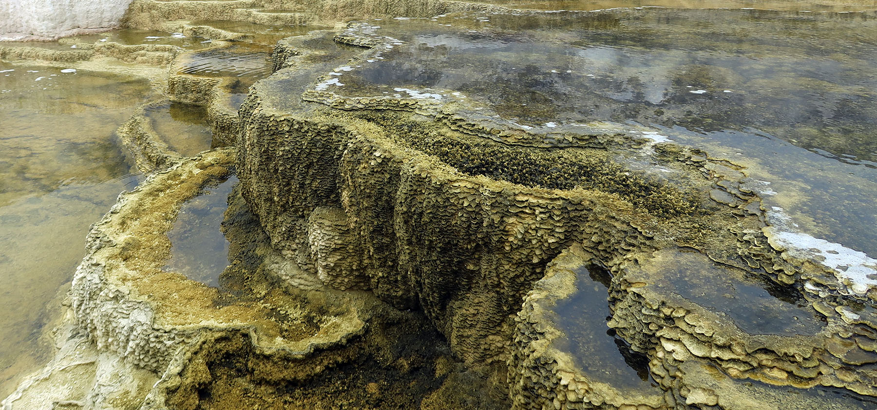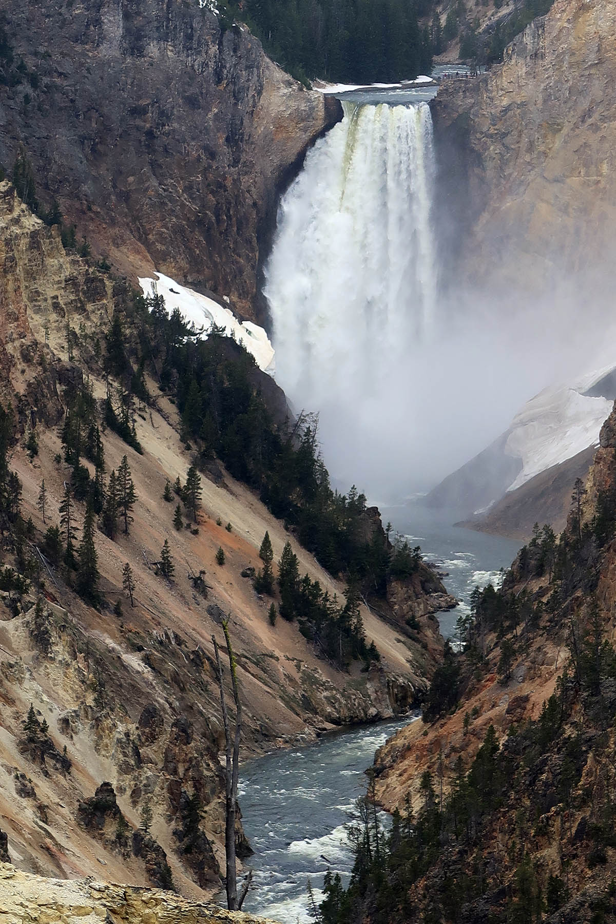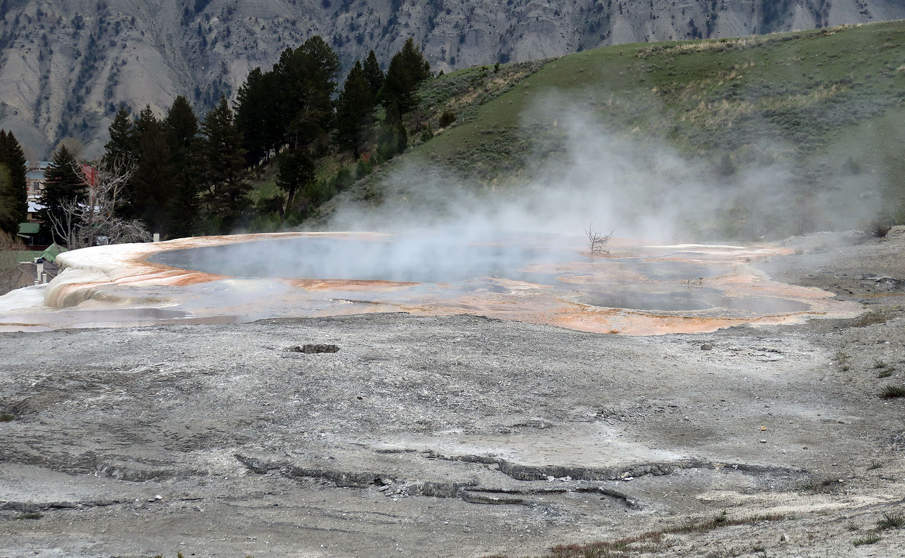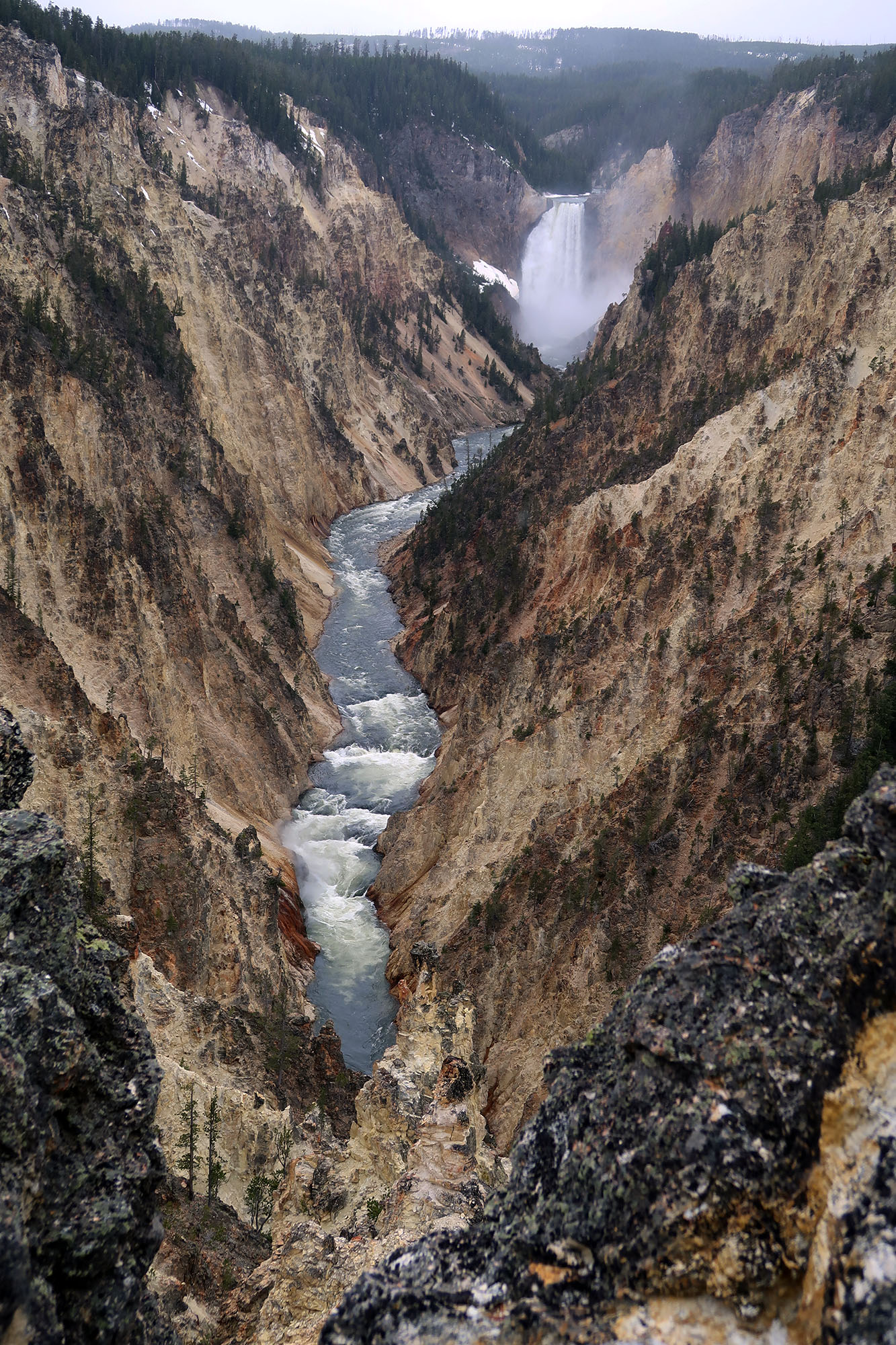 約59万年前に 流紋岩の溶岩が東方から流れてきて現在の渓谷を覆ったが、 それで地下から噴出す水蒸気やガスを閉じ込められず、流紋岩を脆弱化させ黄色く変色させとなった。溶岩が流れをせき止め湖を形成したが湖は氾濫し、流紋岩を侵食しイエローストーン渓谷を形成していった。その後氷河の形成と融解が繰り返され、1万4千年前に現在の景観となった。 |
