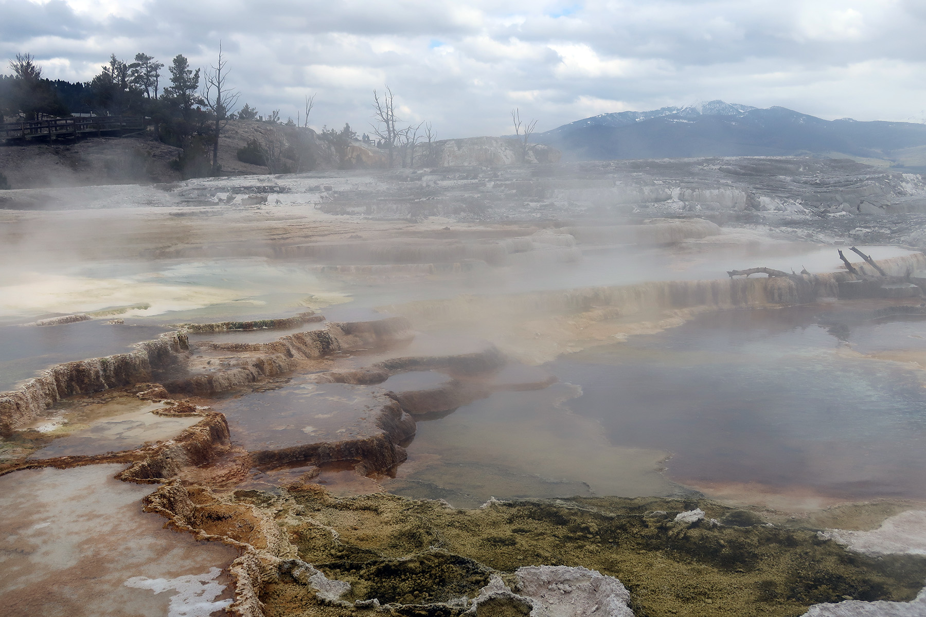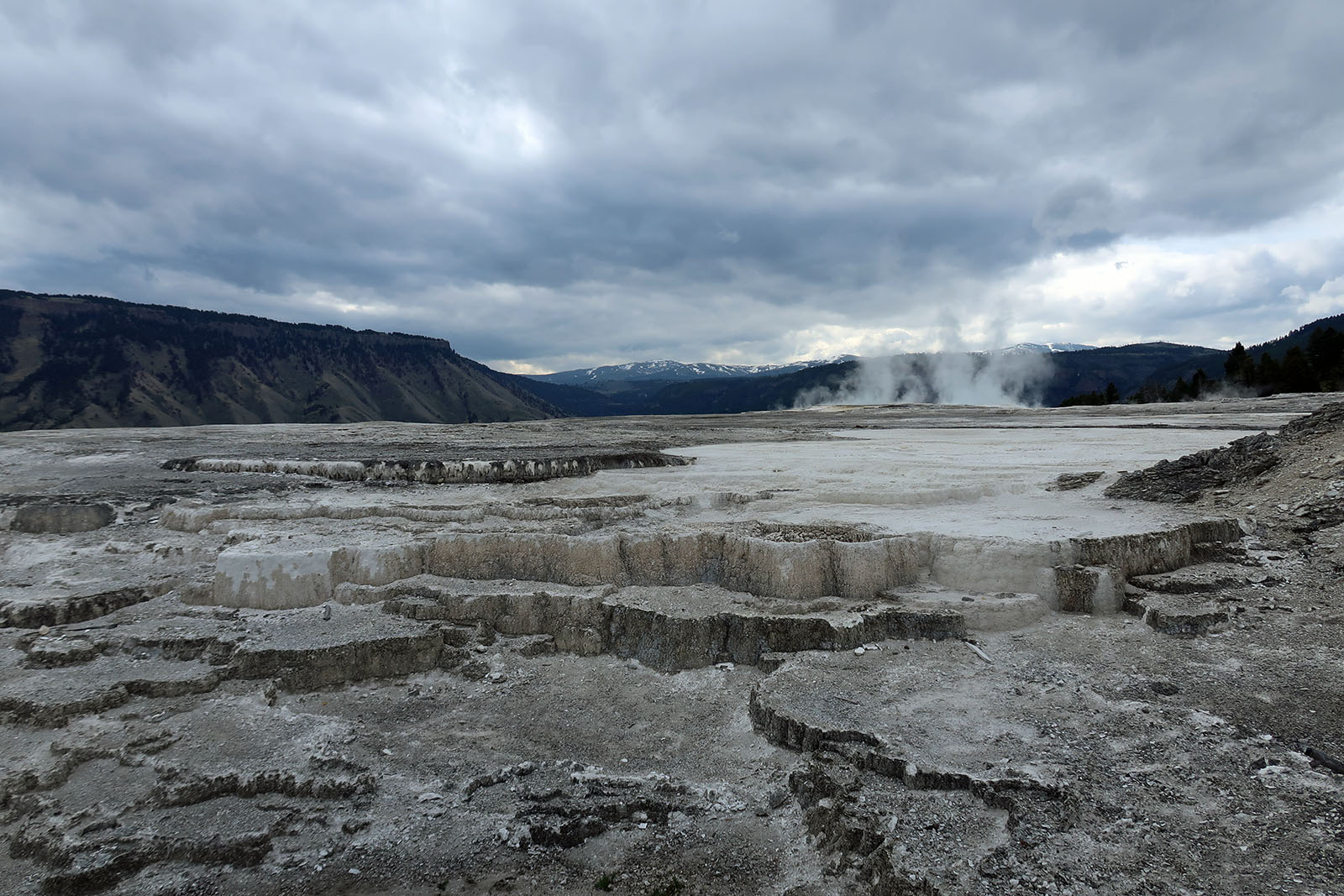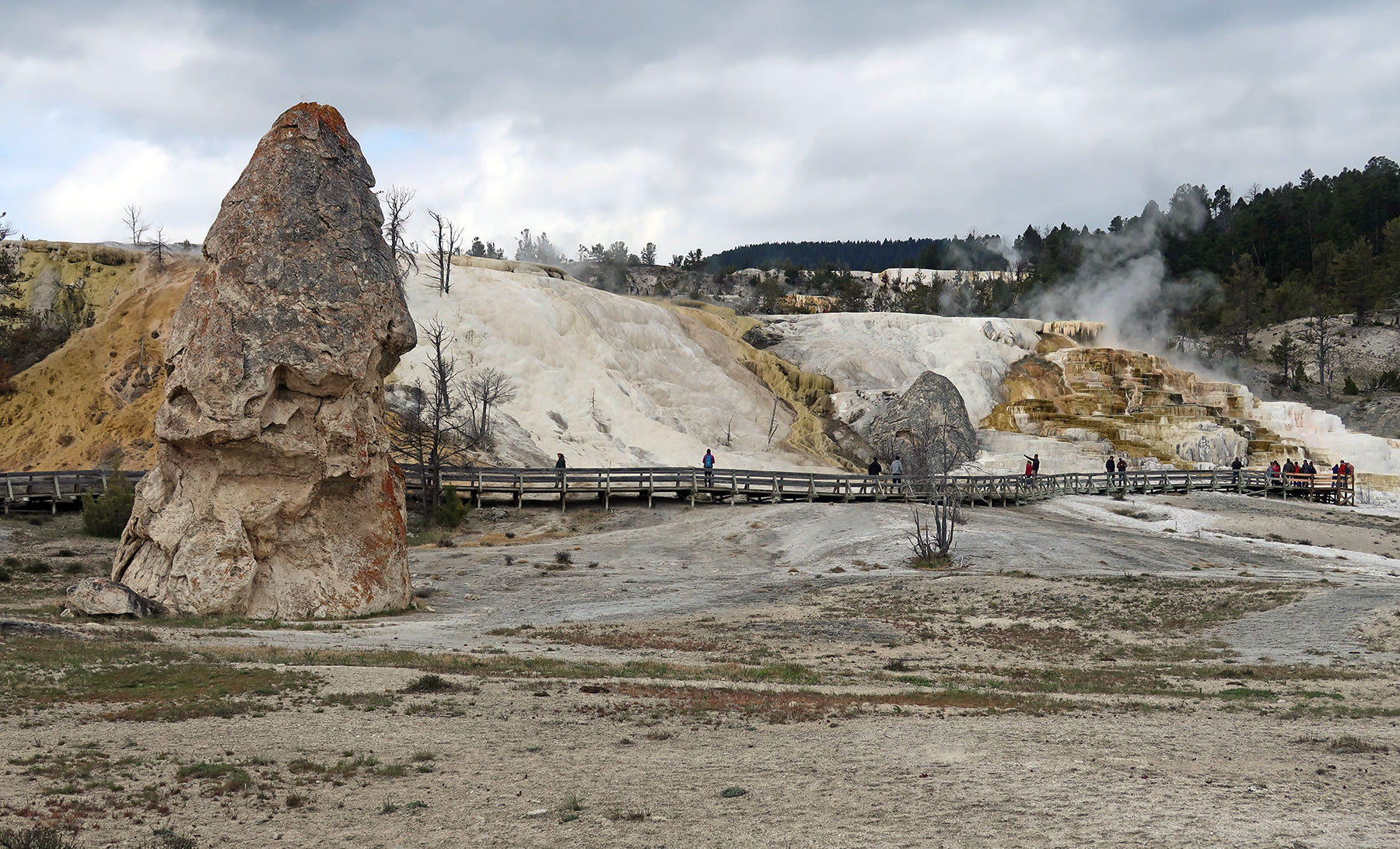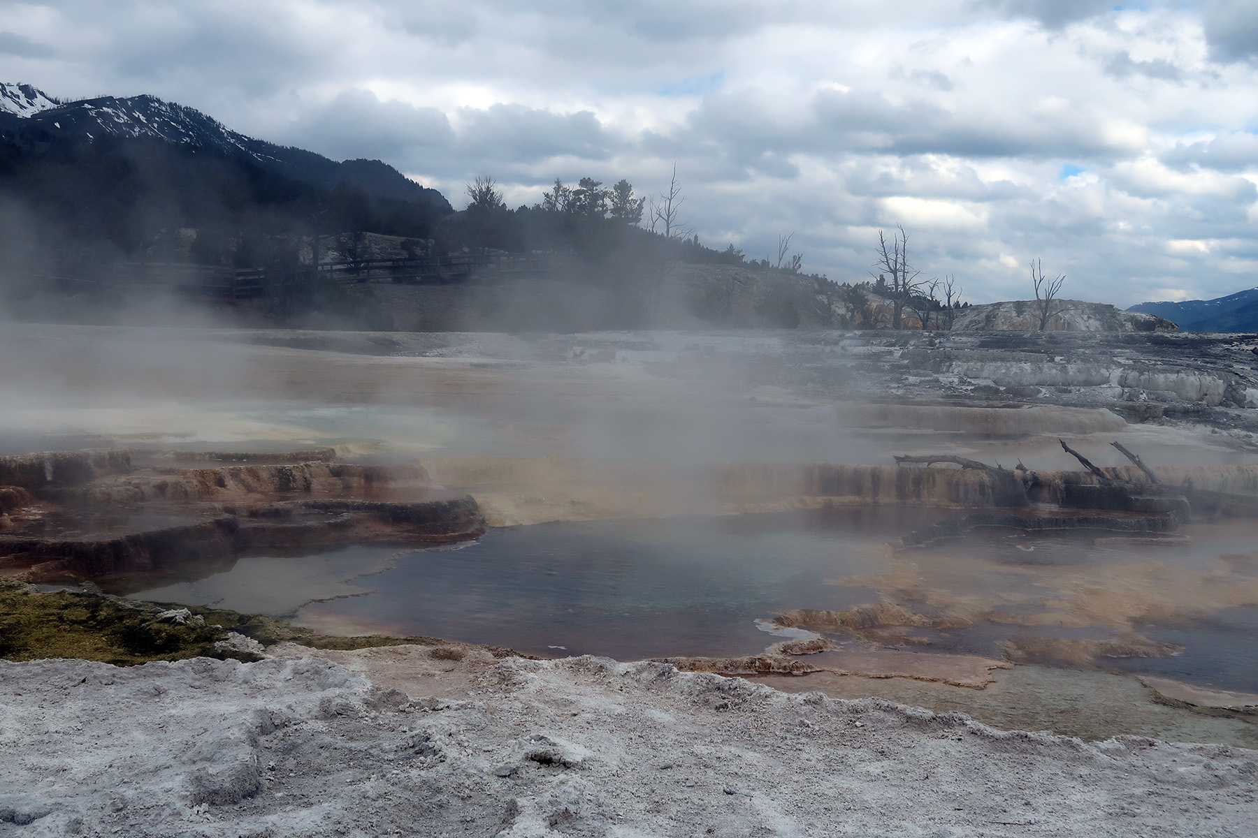 約59万年前に 流紋岩の溶岩が東方から流れてきて現在の渓谷を覆ったが、 それで地下から噴出す水蒸気やガスを閉じ込められず、流紋岩を脆弱化させ黄色く変色させとなった。溶岩が流れをせき止め湖を形成したが湖は氾濫し、流紋岩を侵食しイエローストーン渓谷を形成していった。その後氷河の形成と融解が繰り返され、1万4千年前に現在の景観となった。 |