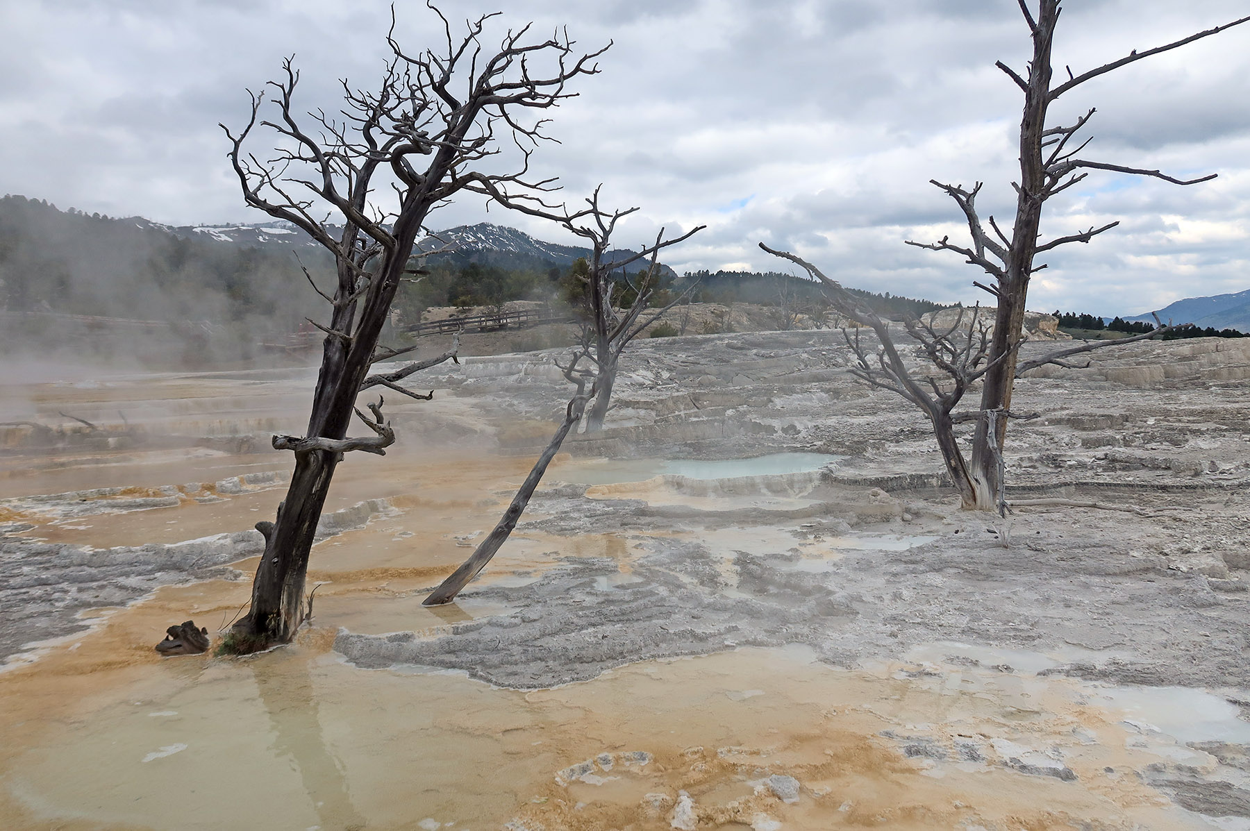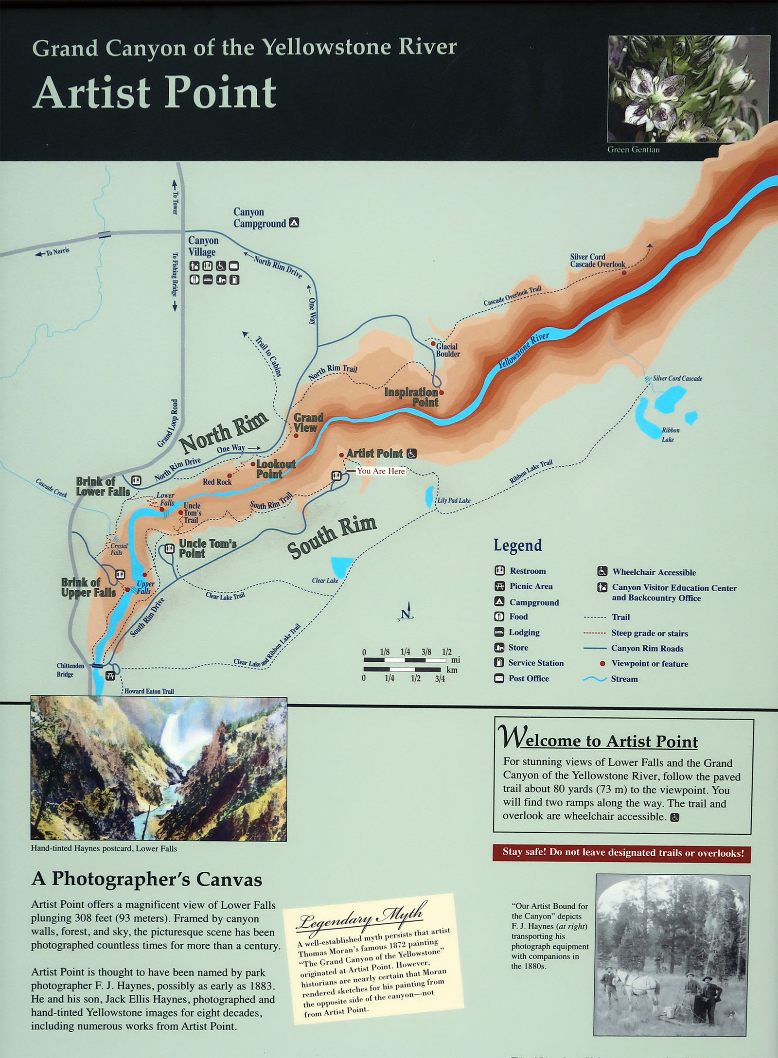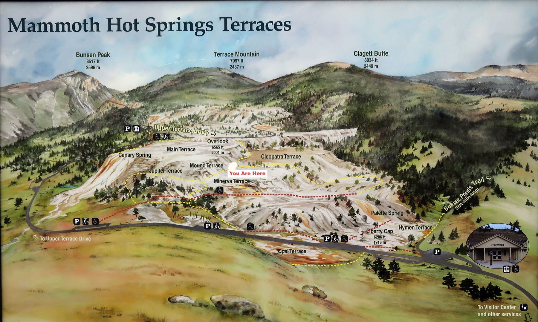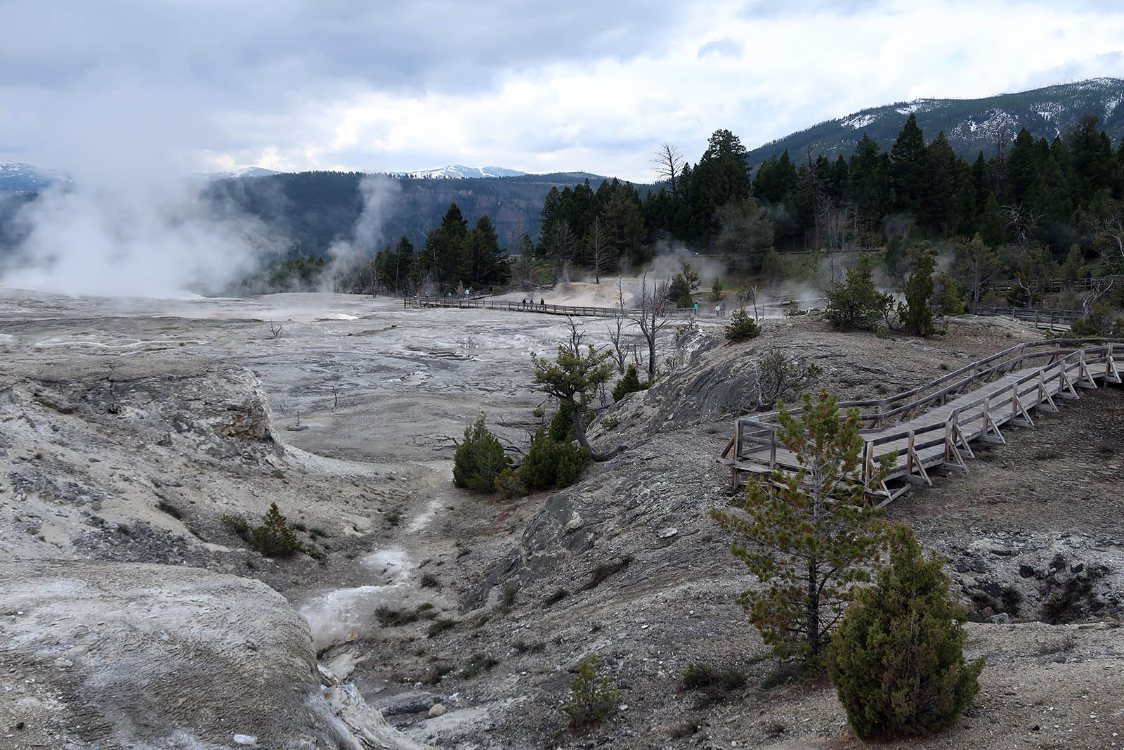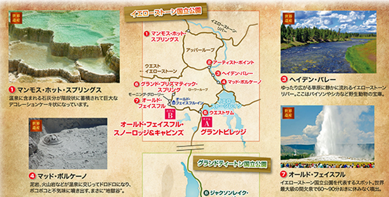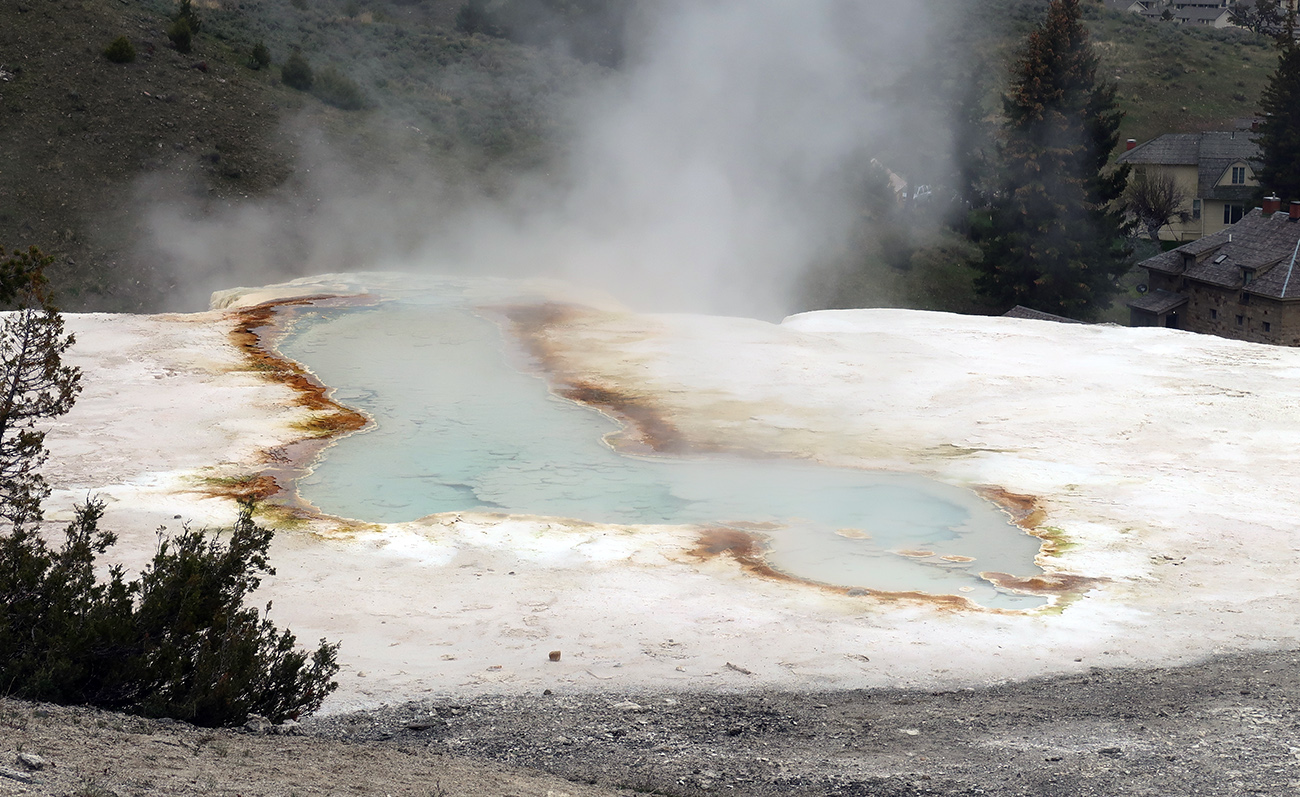 約59万年前に 流紋岩の溶岩が東方から流れてきて現在の渓谷を覆ったが、 それで地下から噴出す水蒸気やガスを閉じ込められず、流紋岩を脆弱化させ黄色く変色させとなった。溶岩が流れをせき止め湖を形成したが湖は氾濫し、流紋岩を侵食しイエローストーン渓谷を形成していった。その後氷河の形成と融解が繰り返され、1万4千年前に現在の景観となった。 |