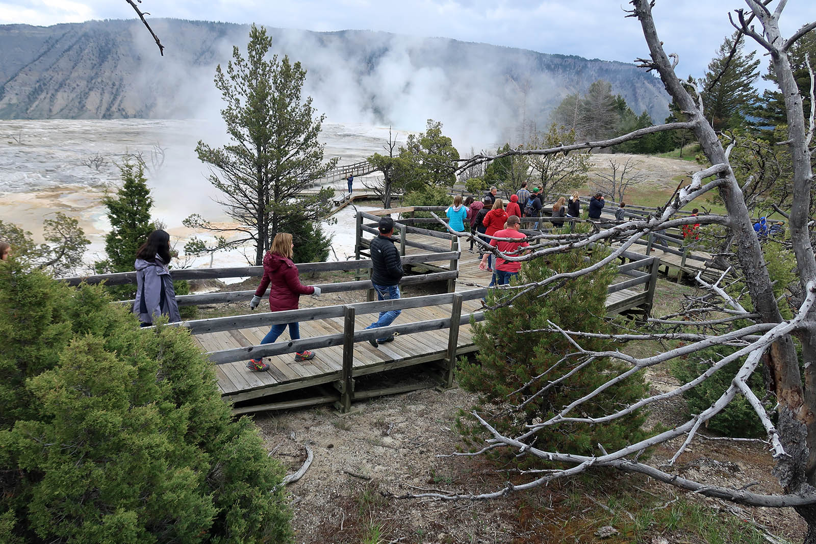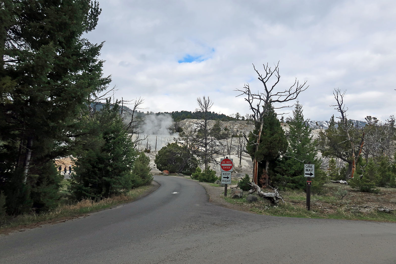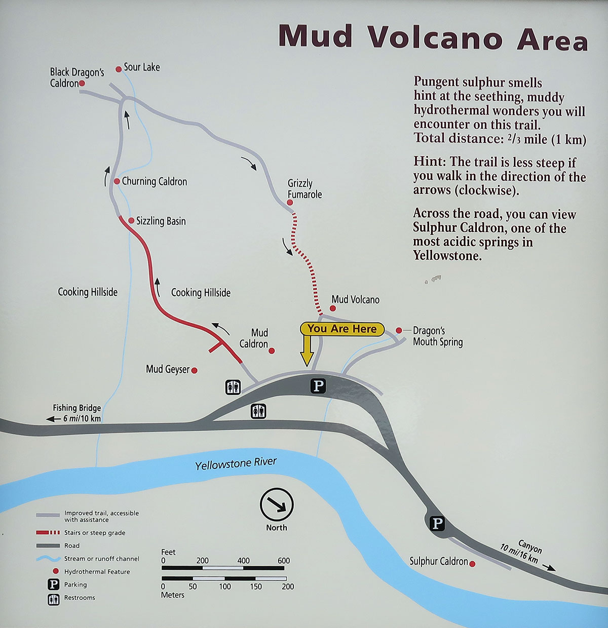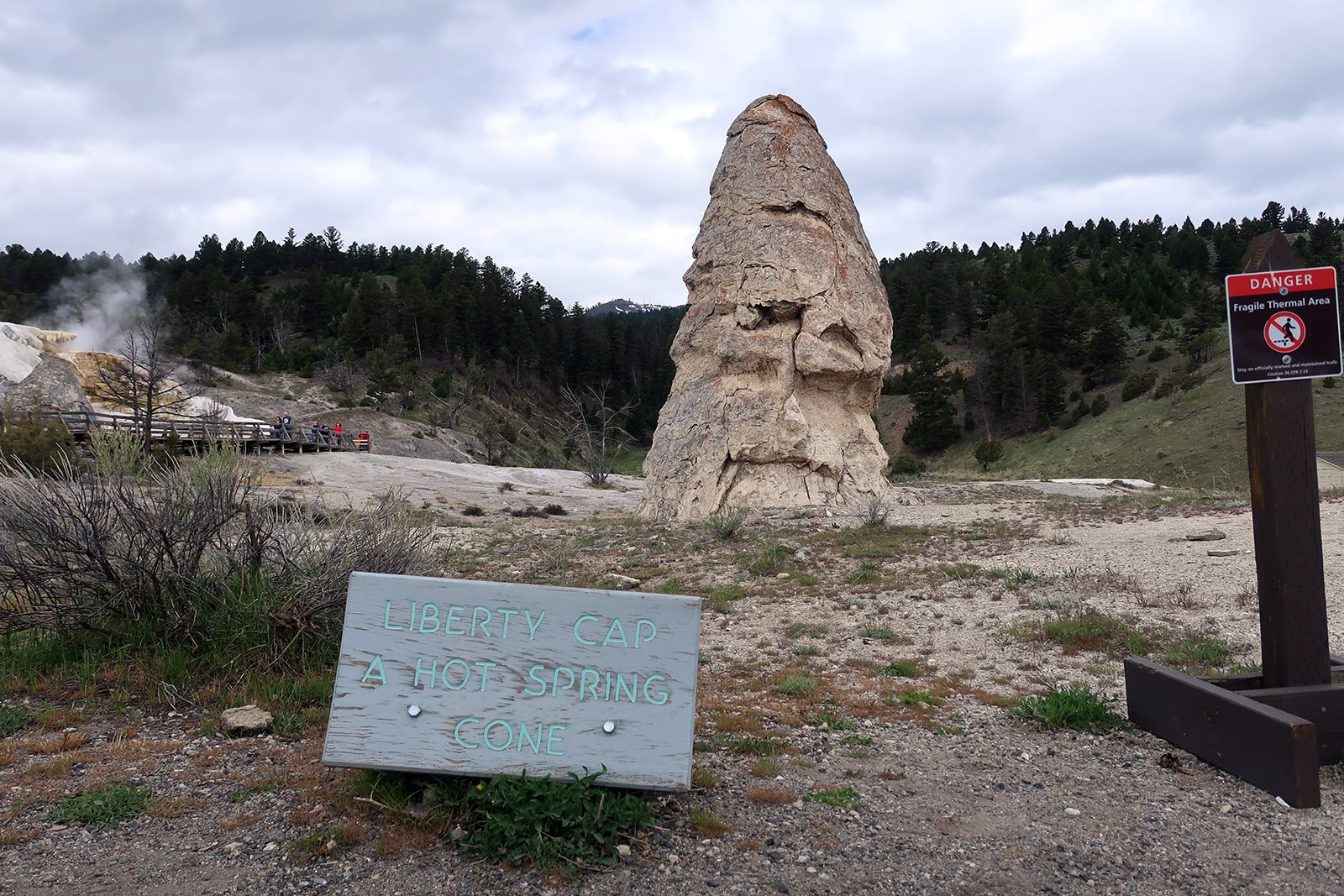約59万年前に 流紋岩の溶岩が東方から流れてきて現在の渓谷を覆ったが、 それで地下から噴出す水蒸気やガスを閉じ込められず、流紋岩を脆弱化させ黄色く変色させとなった。溶岩が流れをせき止め湖を形成したが湖は氾濫し、流紋岩を侵食しイエローストーン渓谷を形成していった。その後氷河の形成と融解が繰り返され、1万4千年前に現在の景観となった。 |