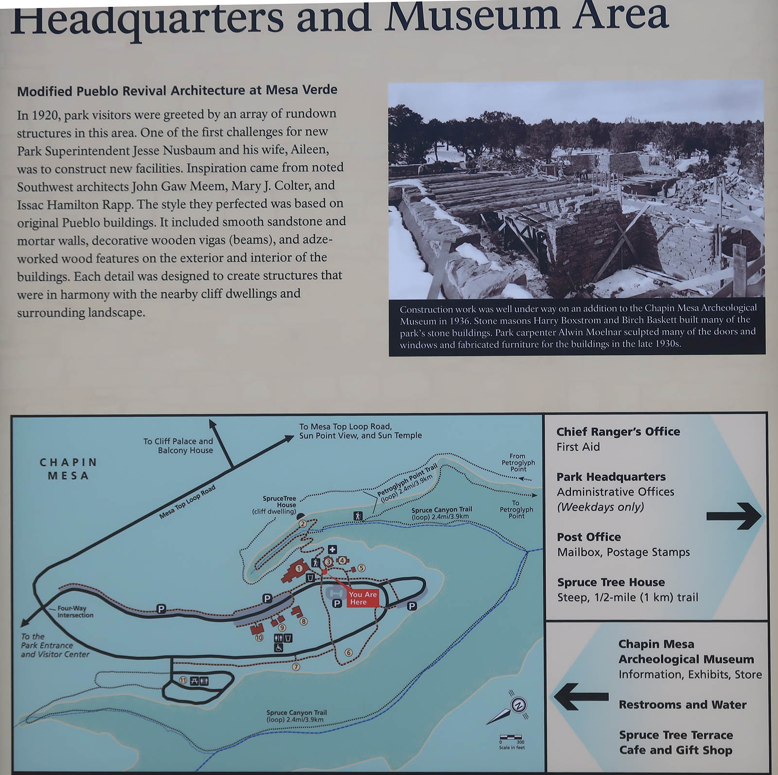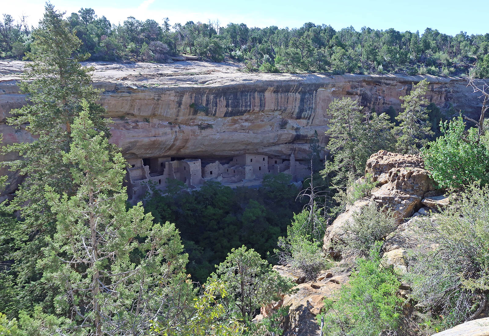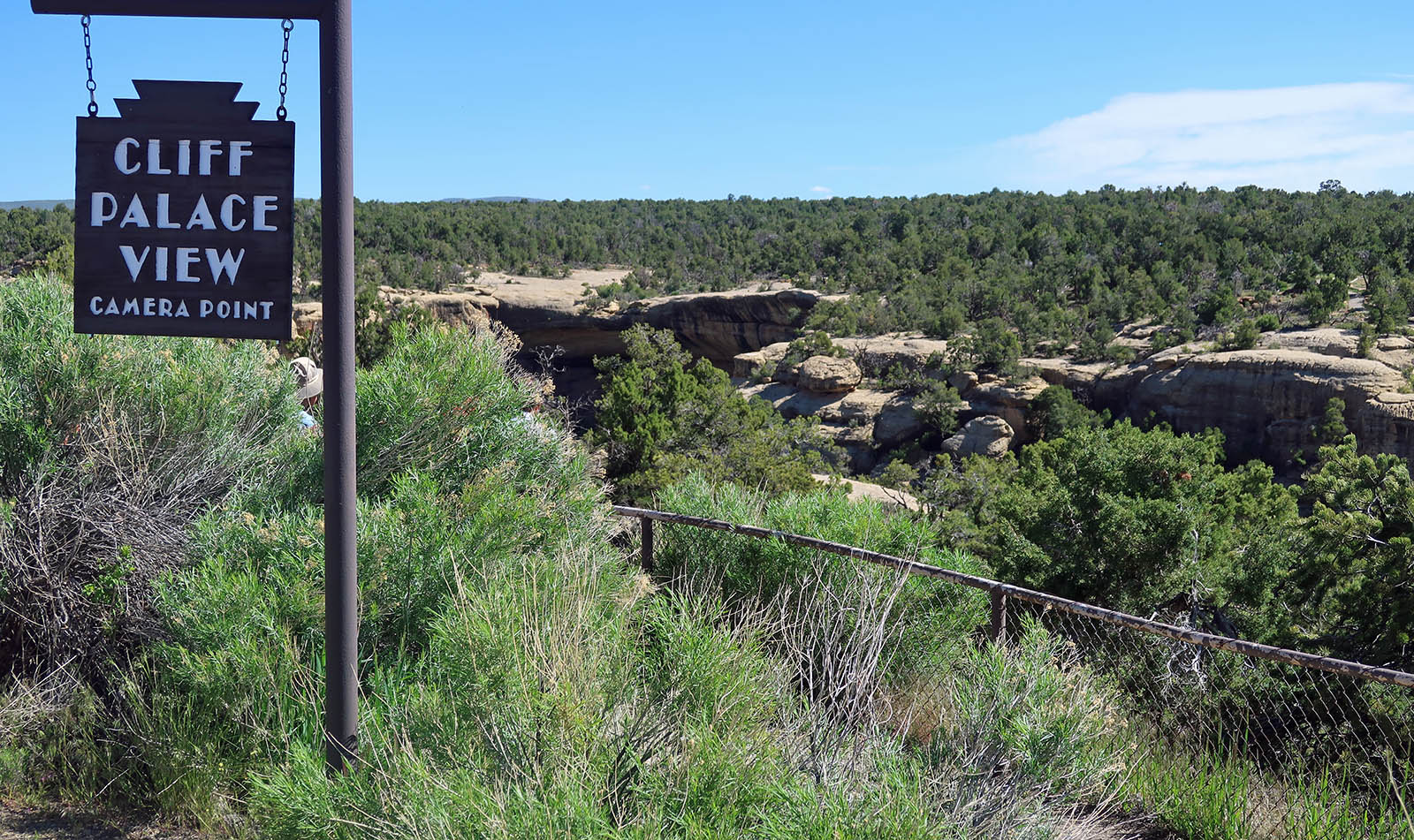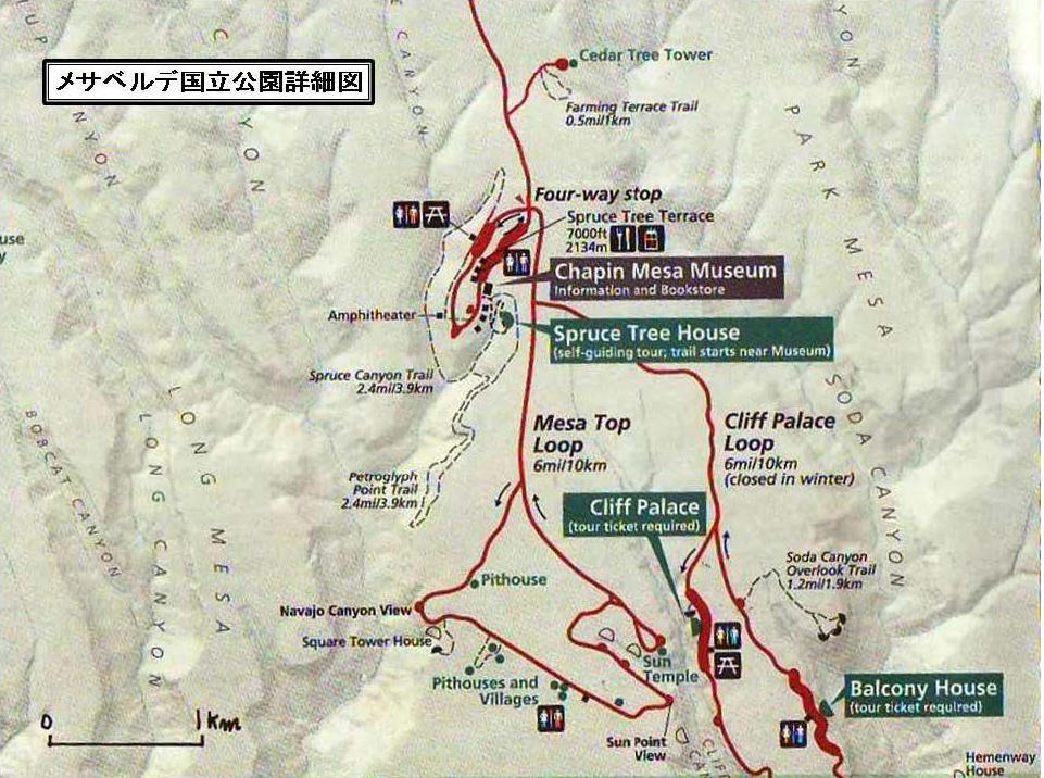 コロラド州南西部に位置するメサ・ヴェルデはスペイン語で「緑の台地」の意味であり、プエブロインディアンのアナサジ族の残した断崖をくりぬいた一連の集落遺跡である。1906年7月29日に国立公園として制定され、1978年9月6日に世界遺産 (文化遺産) に登録された。この公園の面積は211 km?で、この入口は Cortez の町の東約15kmに位置している。集落遺跡はクリフ・パレスといわれる「岩窟住居」である。200室ほどあり、一番高いところの高さは、4階建て相当にもなる。さながら高級マンションのようである。クリフ・パレスなど主要な遺跡コンプレックスへの立入りは公園レンジャーの引率によるツアーのみで許されている。 |