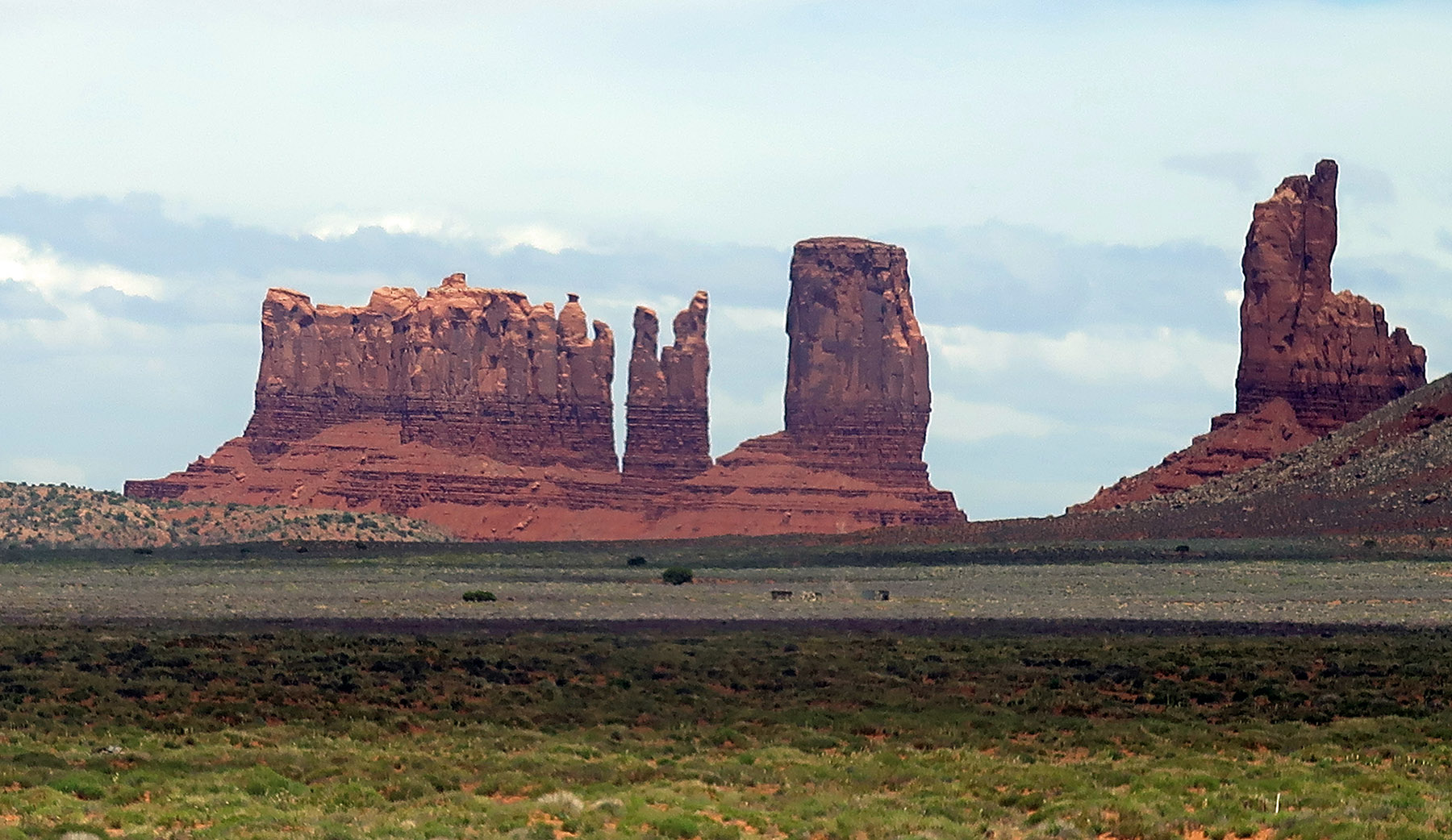 大地から突き出している岩山は、ビュート(butte)と呼ばれています。残丘という意味。高さは300m程あります。かつては、ここもグランド・キャニオンのような渓谷だったが、年月をかけて浸食され残った部分が少なくなって今の形となりました。