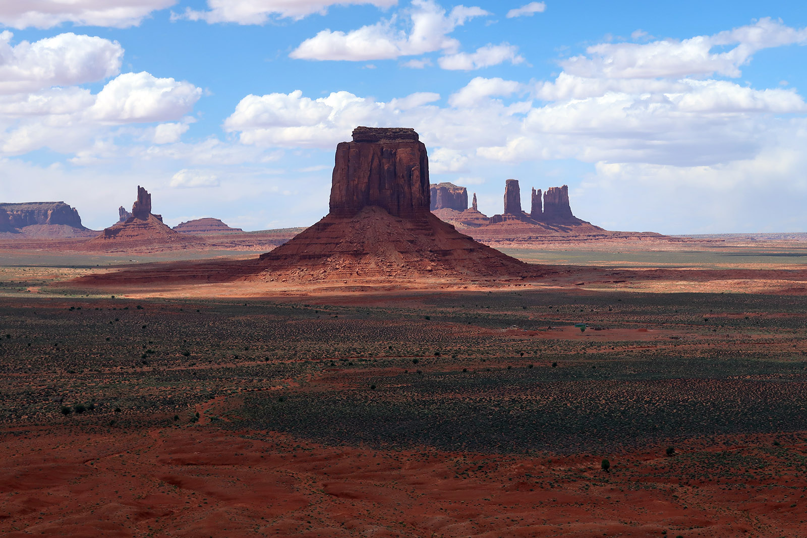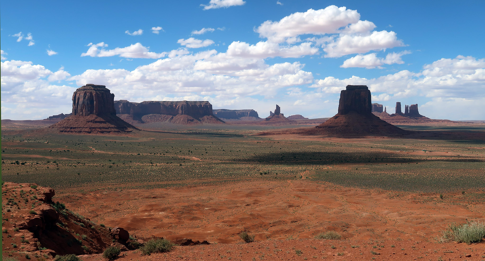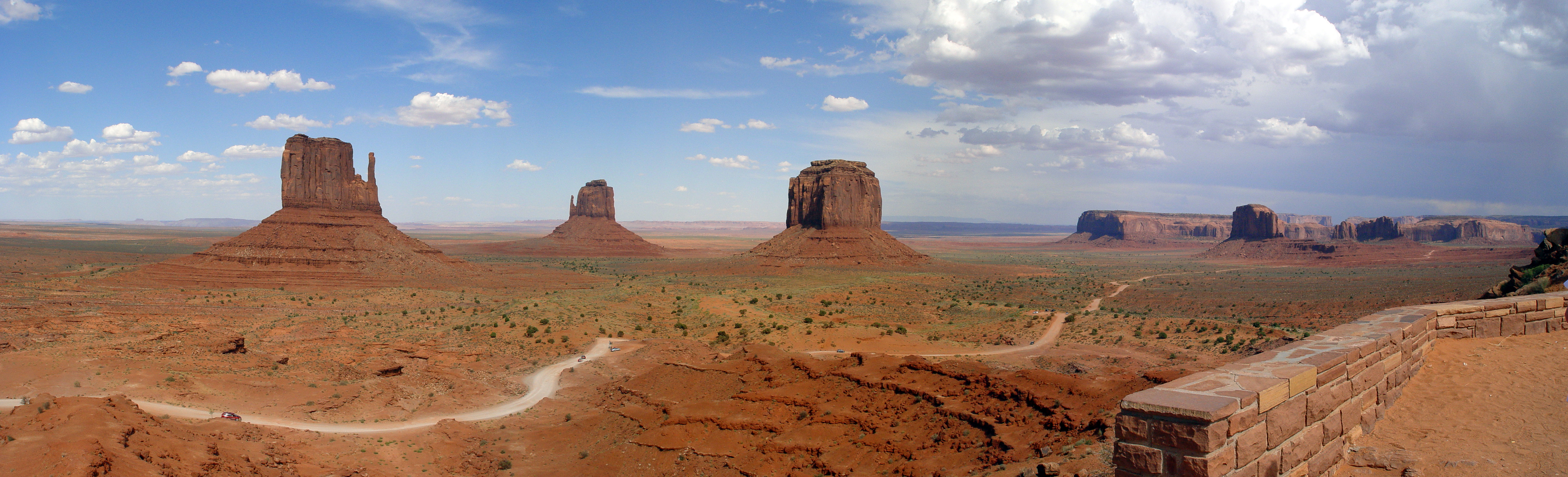 モニュメントバレーはUSAのユタ州とアリゾナ州かけて広がる地域で、メサと言われるテーブル状の台地や、それが侵食された岩山ビュートが点在し、モニュメントが並んだ景観を示している。国立公園、国定公園、州立公園のいずれでもなく、ナバホ族居住地に属しており、モニュメントバレーはナバホ族の聖地。このエリアの正式名称は、モニュメントバレー・ナバホ族公園(Monument Valley Navajo Tribal Park)といい、アメリカ政府から大幅な自治権を与えられ、独立国に近い存在である「ナバホ国」の国立公園です。公園の管理もナバホ族の人々によってなされています。