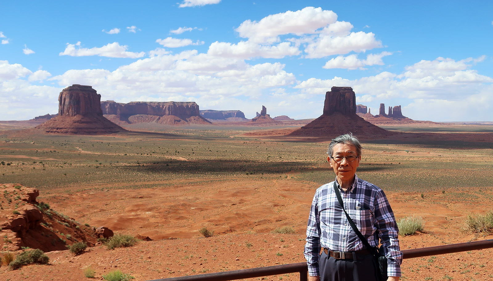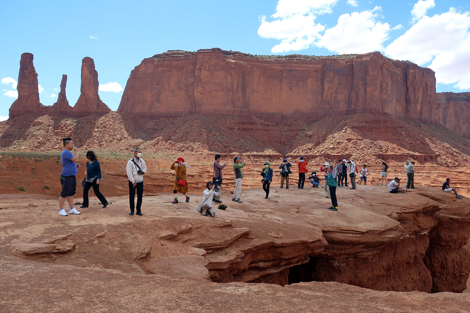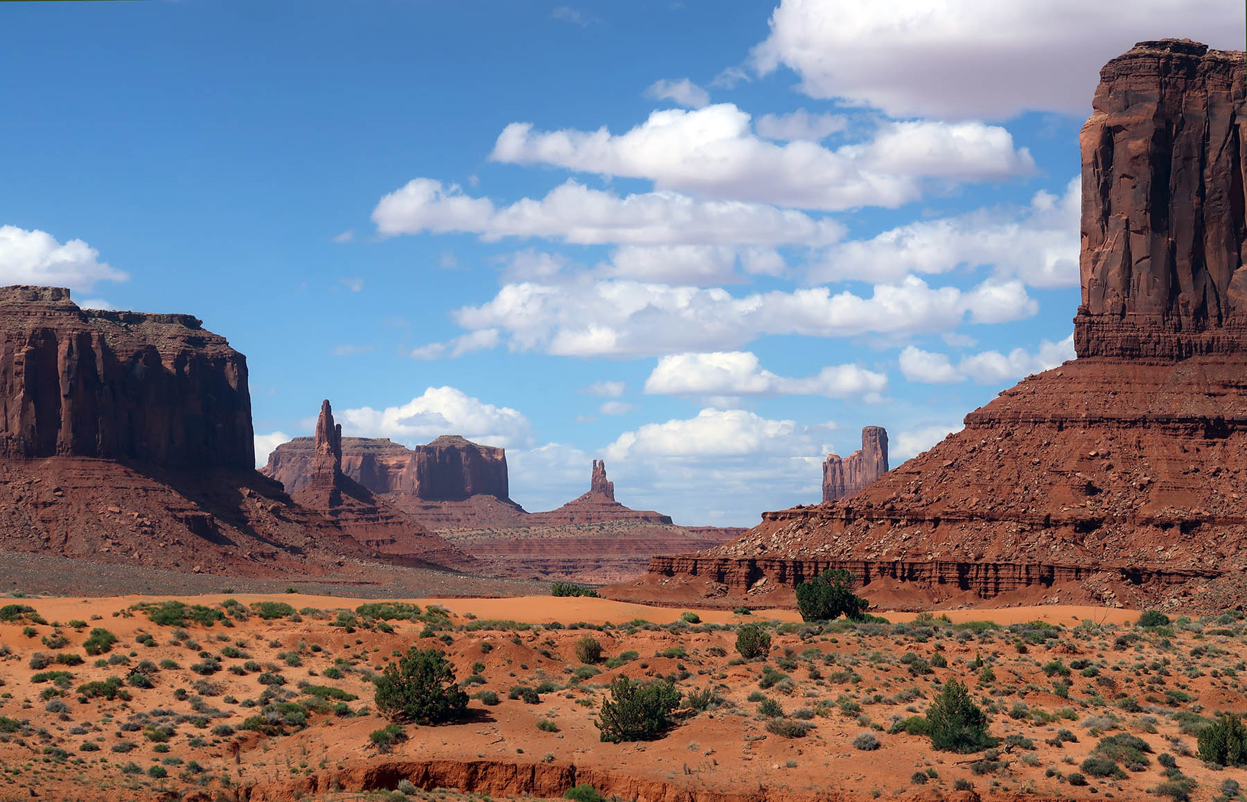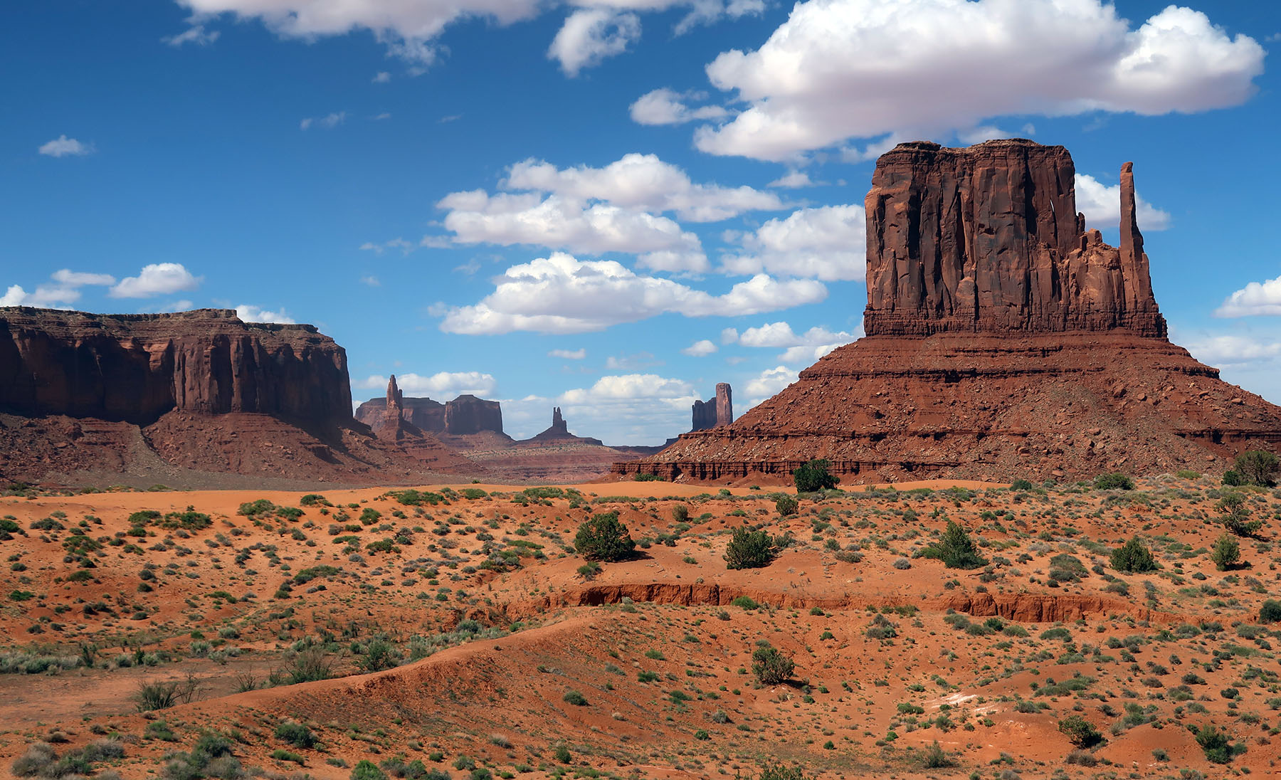 モニュメントバレーはUSAのユタ州とアリゾナ州かけて広がる地域で、メサと言われるテーブル状の台地や、それが侵食された岩山ビュートが点在し、モニュメントが並んだ景観を示している。国立公園、国定公園、州立公園のいずれでもなく、ナバホ族居住地に属しており、モニュメントバレーはナバホ族の聖地。このエリアの正式名称は、モニュメントバレー・ナバホ族公園(Monument Valley Navajo Tribal Park)といい、アメリカ政府から大幅な自治権を与えられ、独立国に近い存在である「ナバホ国」の国立公園です。公園の管理もナバホ族の人々によってなされています。
