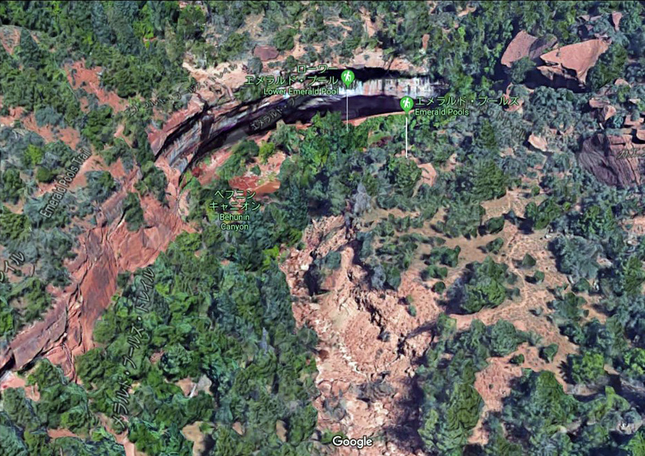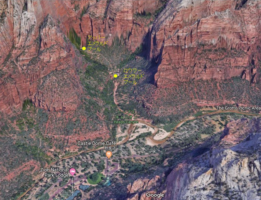 エメラルドプールトレイル(衛星写真) 国立公園ロッジ前でバージン川を渡る