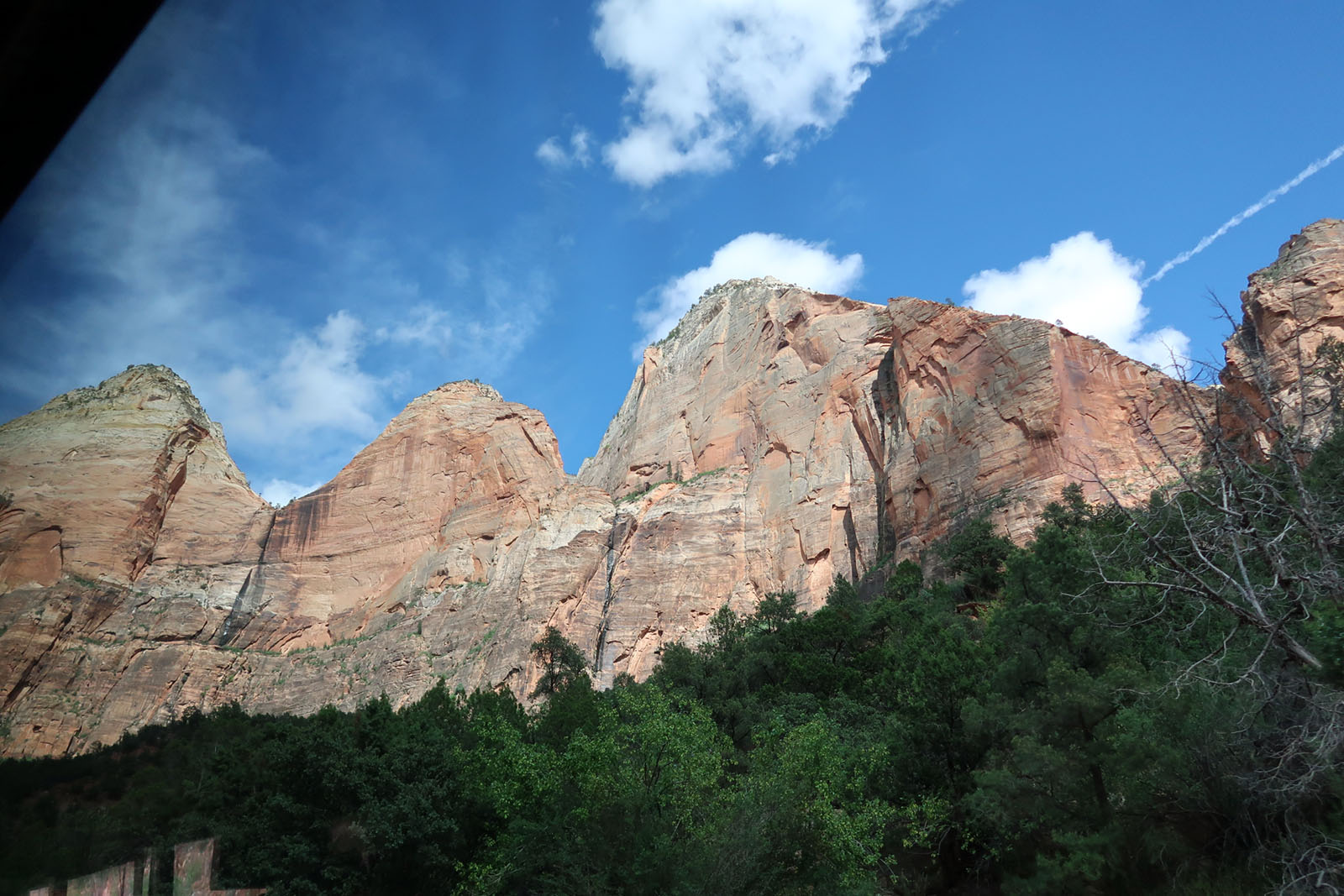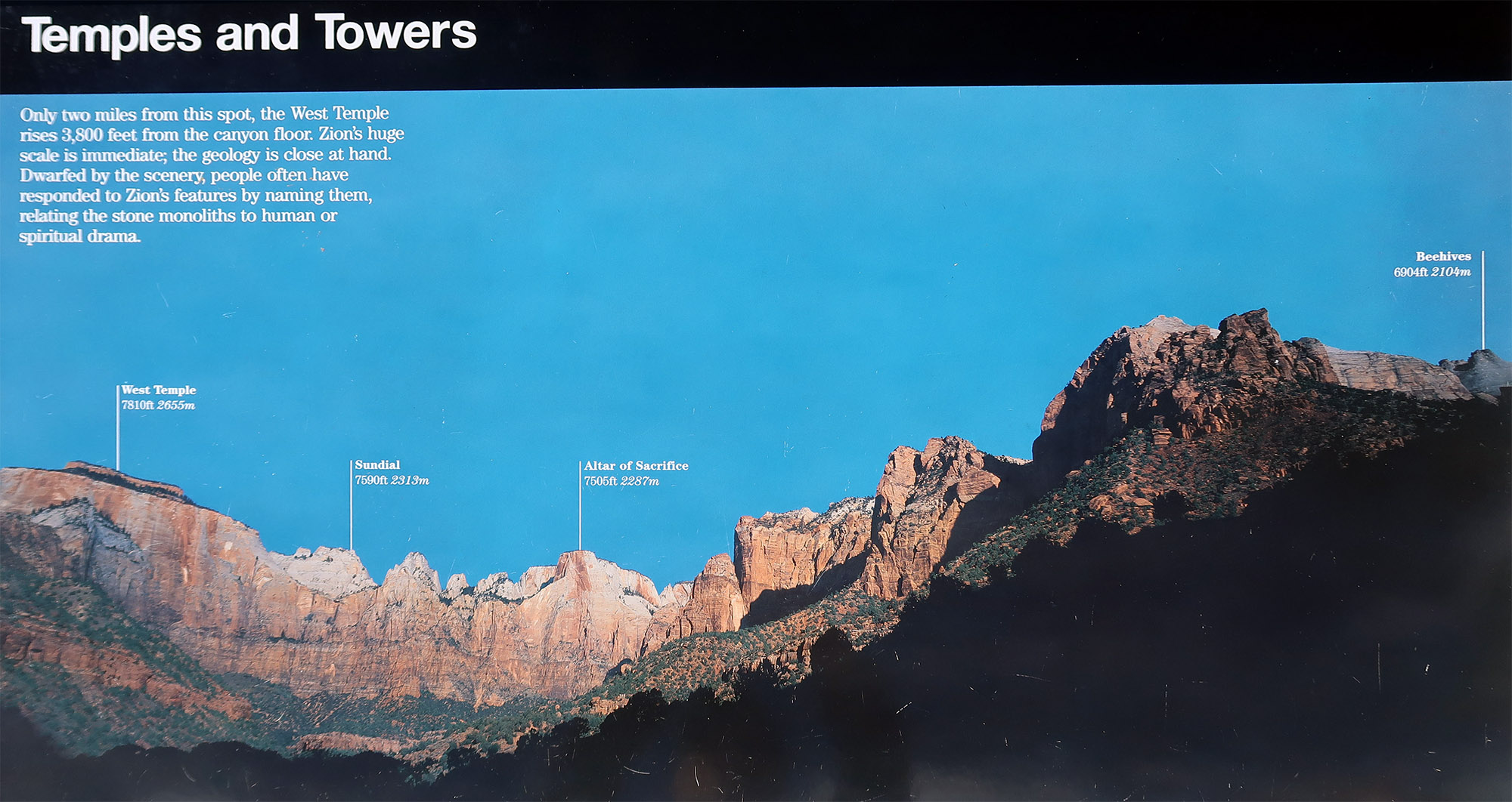 ザイオン国立公園はユタ州に位置し、南はスプリングデール、東はマウント・カーメル・ジャンクションに接しており、面積は593平方kmである。この公園は特徴は、長さ24km、深さ0800mのザイオン渓谷で、ノース・フォーク・ヴァージン川によって赤いナバホ・サンドストーン(砂岩)が侵食されたものである。浸食された岩の芸術とも呼ばれる。ザイオンとコロブ渓谷地域には、中生代の1億5000万年間の堆積を示す9つの地層が含まれる。その地域は、当時、暖かく浅い海、小川、池、湖、広大な砂漠、岸に近い乾燥した環境に覆われていたが、コロラド高原を生み出した隆起により1300万年前から3000mに持ち上げられた。 |