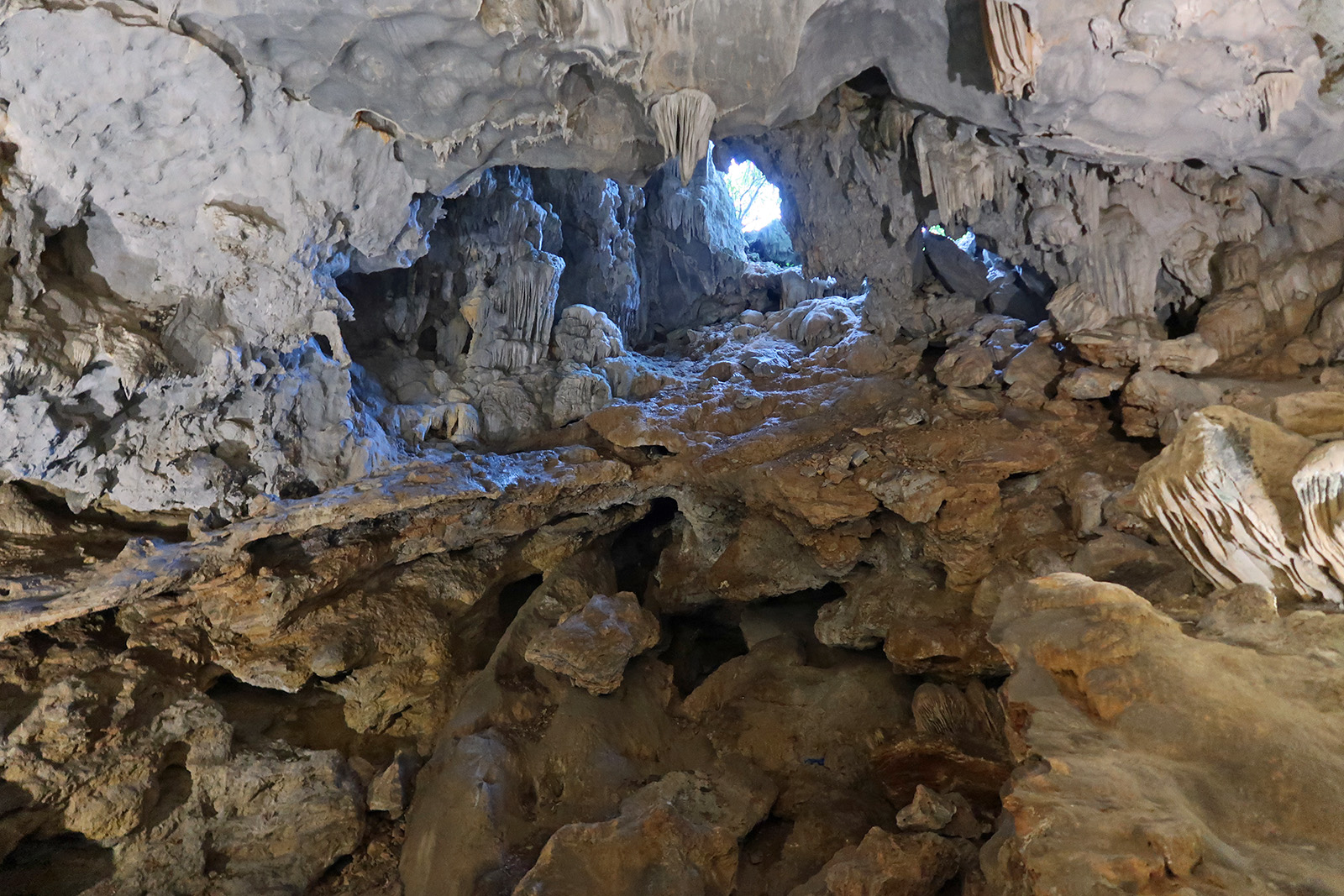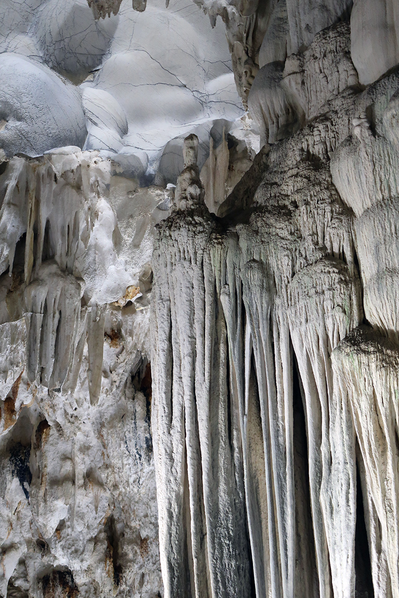 ハロン湾に点在する多くの島に鍾乳洞があるが、ダウゴー島にあるティエンクン洞は、天宮の意味がある。3時間の短いクルーズでも立ち寄る最もポピュラーな鍾乳洞。鍾乳洞の内部は高さ20m、幅10m程でそう広くはないが青や緑などにライトアップされていて幻想的な世界となっている。