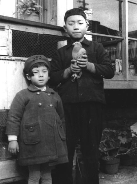鳩小屋の前で妹と