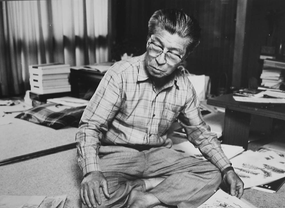 清城町の自宅で版画を見る(80歳)