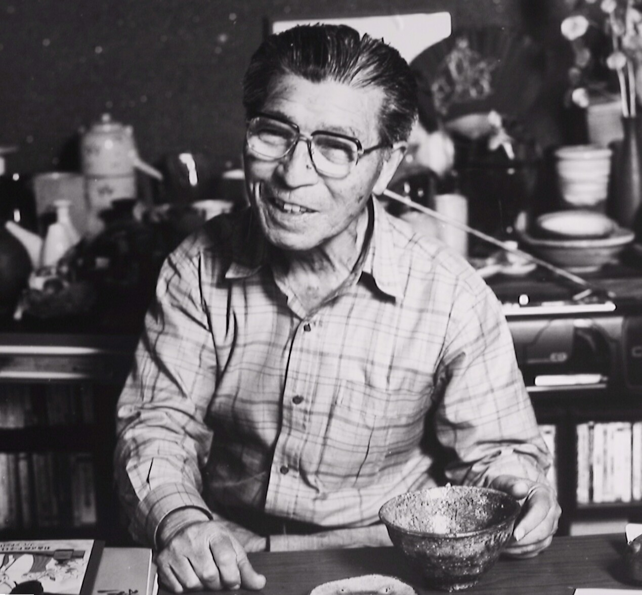 清城町自宅で陶器を見ながら