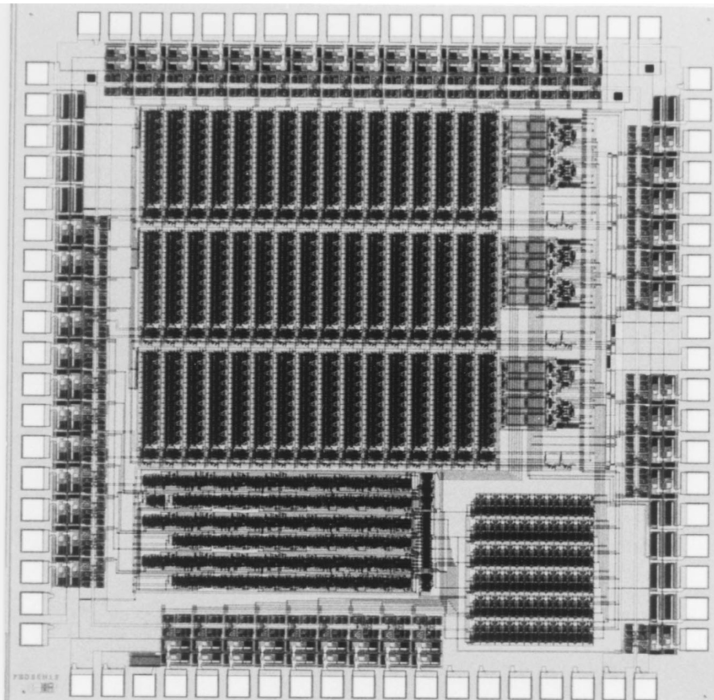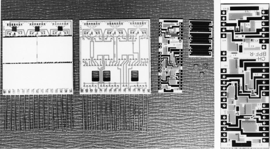 左は完成品でサイズは4cm x 4cm程度,上にある黒い■がオペアンプチップ,真ん中の2個の白い基板の裏にはCが,下の白い基板の裏に はRが形成されているいる.真ん中の基板は,C基板とR基板とオペアンプを搭載する前のメイン基板,縦長の基板はR基板で, 多数の抵抗が形成されている.その拡大写真が一番右にある.小さい基板はC基板で,3個のコンデンサーが形成されている. メイン基板には穴が空け,これを通してレーザーをあてRの値を調整して,精度を高めます. |