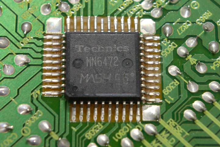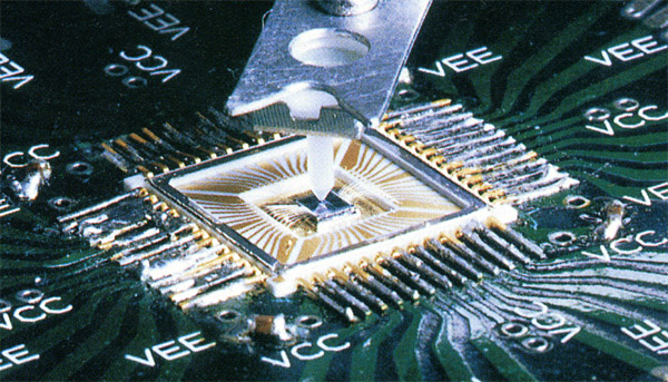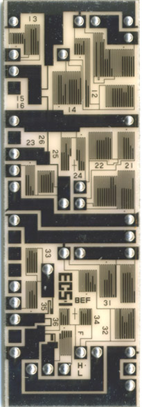 フィルタの特性(振幅と位相)を測定して,所望の特性になるように,薄膜抵抗素子をカットして抵抗値を上げて調整する.これを機能トリミングという. 混成ICを移動させるステージ,抵抗をカットするYAGレーザー,フィルタの特性を測定するネットワークアナライザー,これらを制御するコンピュータと制御ソフトウェアで構成されている. 右の写真に示すように,混成ICの抵抗パターンにははしご形の調整片を設けて,加工の高速化と切断面を減らすことにより,経時特性変化を抑えるように設計している. |