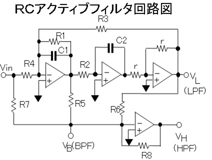 そこで,コイルを用いないでフィルタを作り,小型・軽量にしようという考えで研究・開発されたものです.現在主流になっているシリコンチップ上に形成した集積回路の前には混成集積回路(ハイブリッド)があり,この技術実現するのに適しています. 抵抗(R)とコンデンサー(C)とアンプを用いることにより,等価的にコイルの機能を実現できるという原理で動作します.RとCの値を変えると,周波数が変わるので,特性調整ができます. |