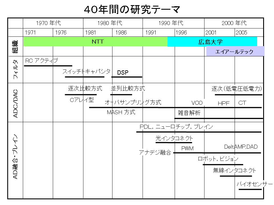 □CMOSデバイスでアナログ回路を作るという先端のテーマに恵まれ,世界初の1チップの音声符号・復号器(音声をPCMデジタル信号に変換,PCMを音声に変換)を開発できた. □これを発展させて考案された微細なCMOSに適した新AD, DA変換技術MASHの研究・開発で技術と学会に貢献し,オーディオ機器等への実用化に貢献できた. □大学に異動して産学共同研究として低電圧・低雑音アナログ回路,基板雑音の解析評価の研究を実施して,これら成果と卒業生で,アナログ設計企業A-R-Tecを設立できた. □NTT時代から将来技術として,超大規模ポストデジタルLSI,神経回路網チップ,光インタコネクト,アナデジ融合回路,無線インタコネクト,3次元集積,半導体バイオ融合に挑戦してきた. 未だ道半ばだが,能力・気力が尽きつつある. |