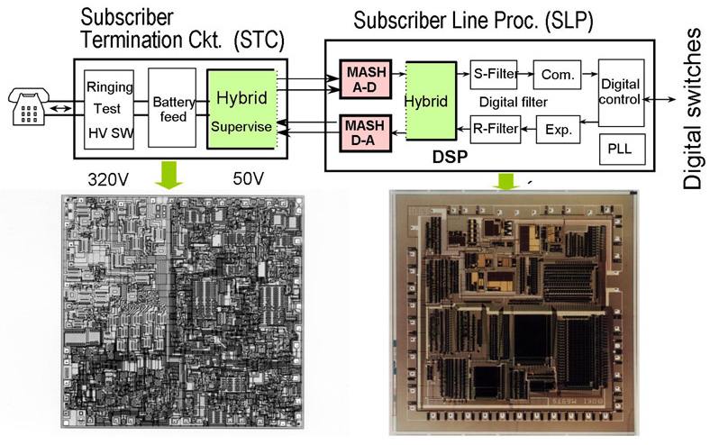 ・PB Rec (Push Buttom Signal Receiver) は電話機からの接続先のダイヤル信号を受信するもの.0-9,*,#の12の符号を2周波の組み合わせピポハで送る, ・MF Rec Multi-Frequency Receiver 交換機間の信号を受信するもの.700,900,1100,1300,1500,1700 Hzの6周波の中から,任意の2周波の組合せで表現される。 ・LCフィルタ(共振回路)で周波数を選別して受信していたが,低周波のためL,Cの値が大きく, 大きなものであった.これを混成IC化RCアクティブフィルタで実現して小型化して,交換機に導入した. |