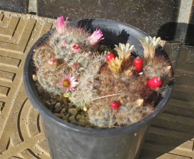 松霞枝変わり 「松霞」を長年植え替えず粗末に放置していたら,親株が枯れ,子株が親株の中に成長しピンク色の花を咲かせた.刺も若干白っぽい感じ.「姫霞」,「霞姫」,「桃霞」,「桜霞」のうちから命名予定.