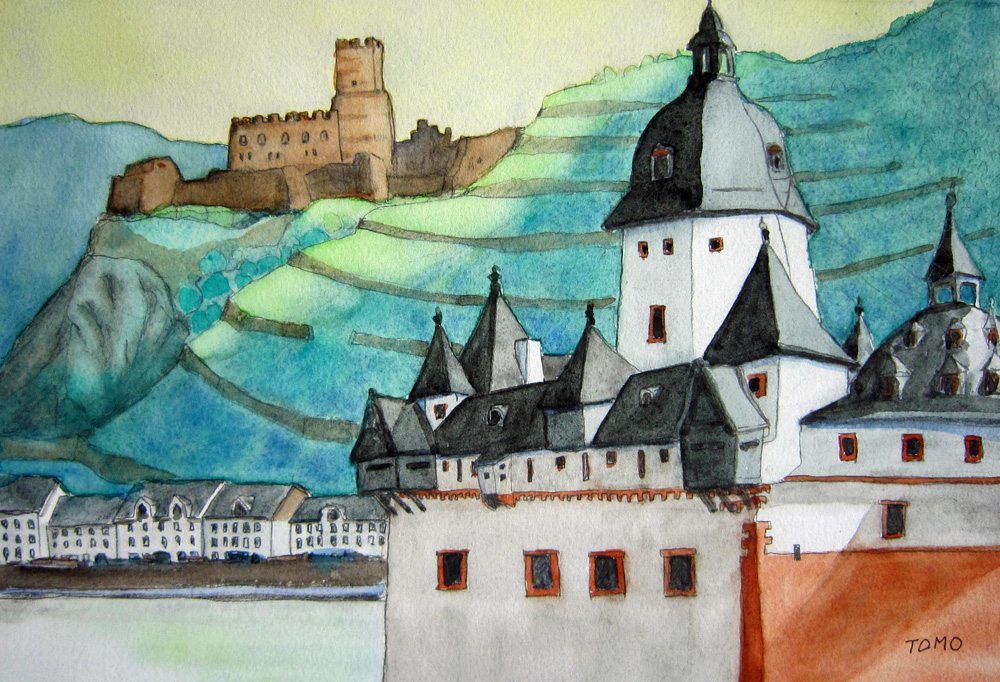 作品9 旅の思い出2 [制作2011年2月] ドイツ ライン川 (中洲にそびえるプファルツ城の向こうに、 朝日が差し込むブドウ畑と、そびえる古城が美しい) |