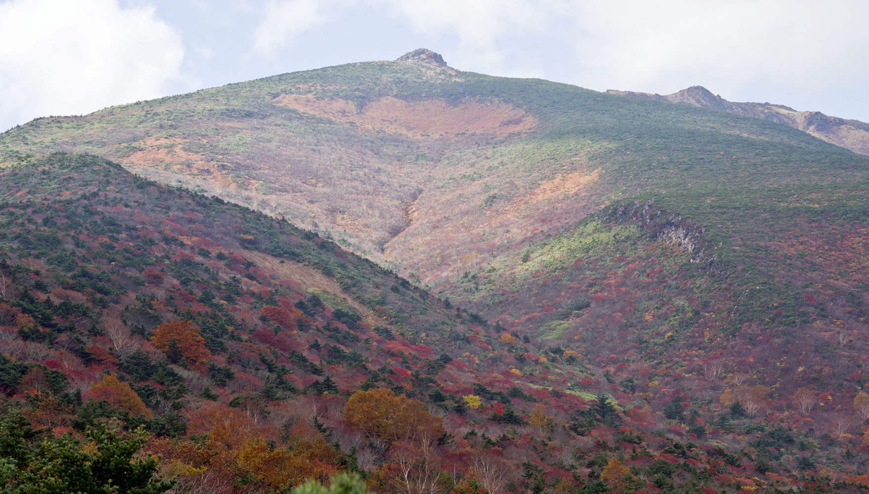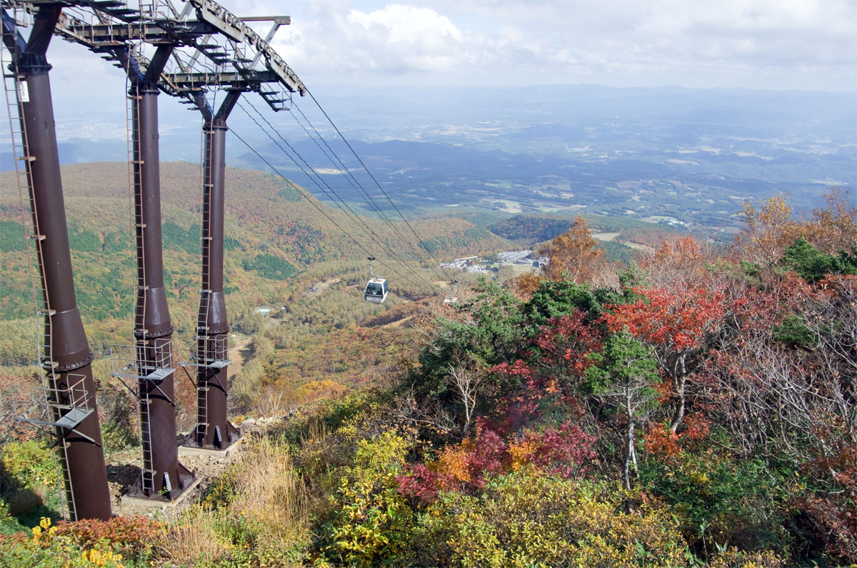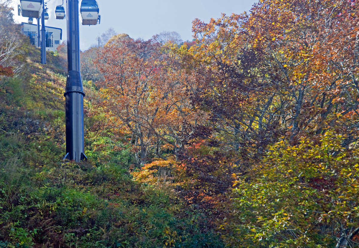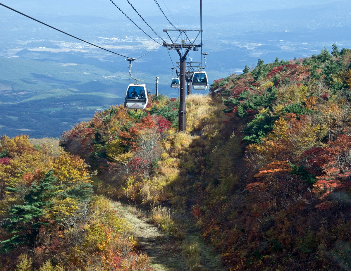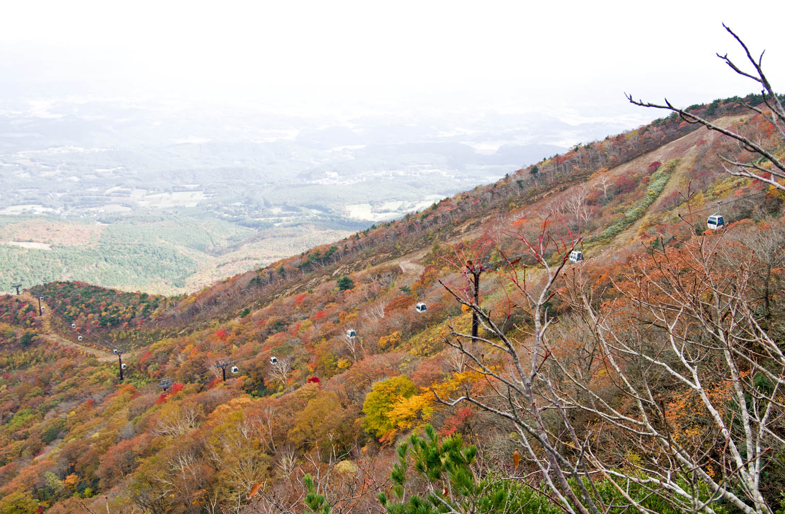 ![]() 薬師岳展望台(ロープウエイの山頂駅)からの安達太良山 中腹の紅葉が盛り |