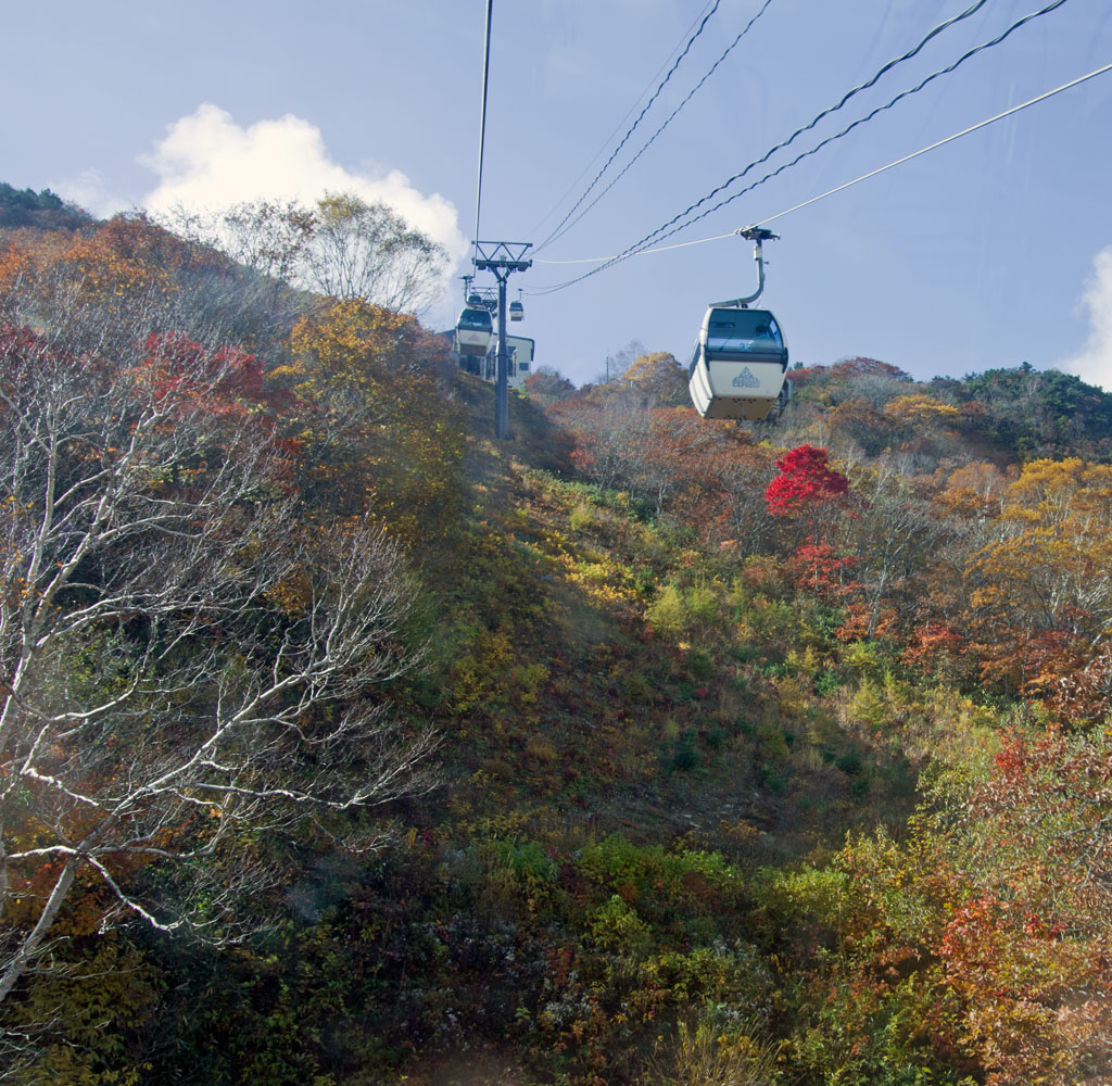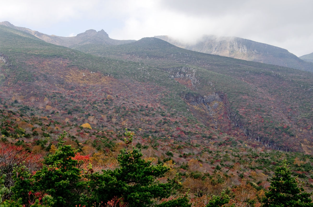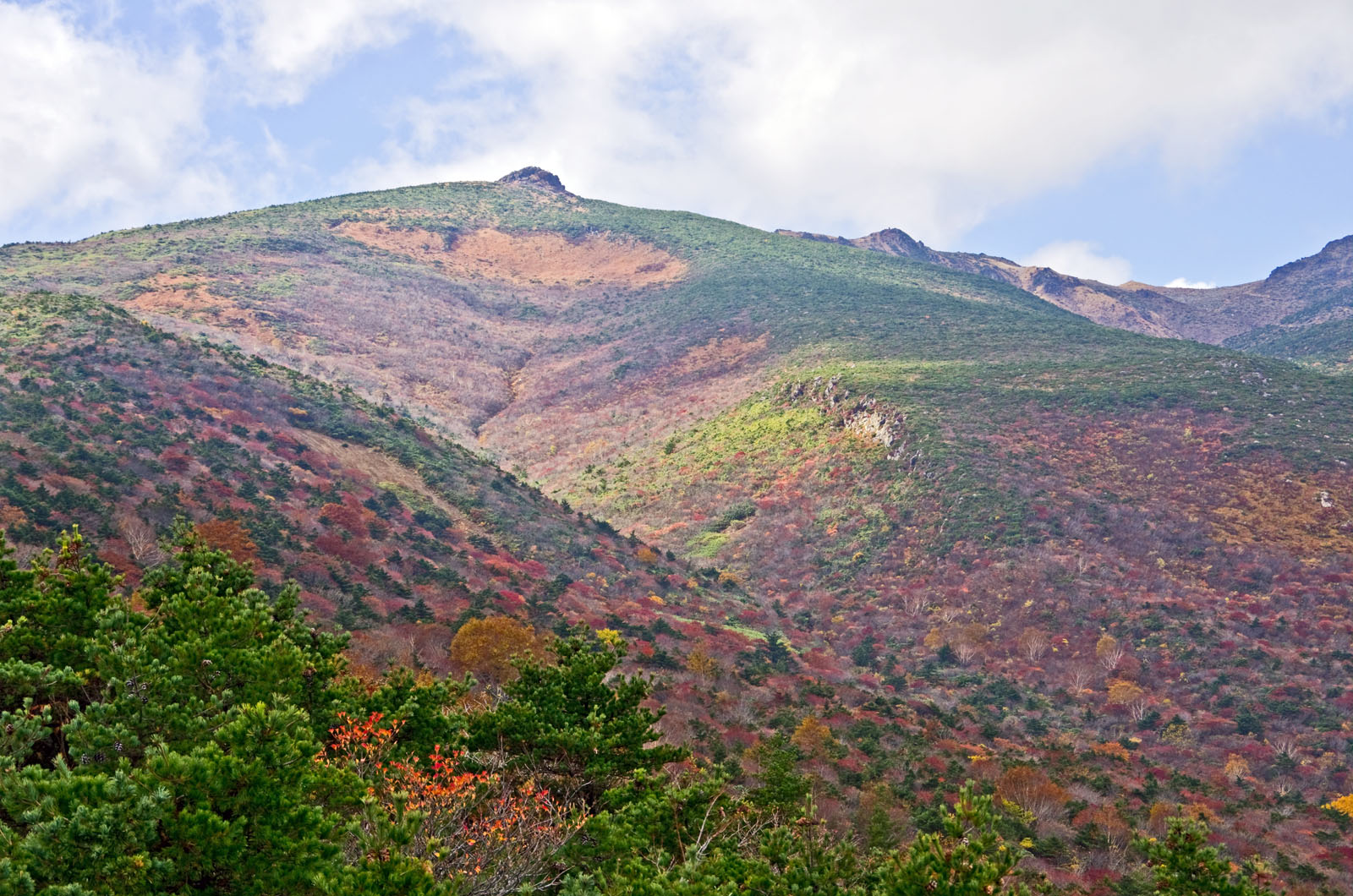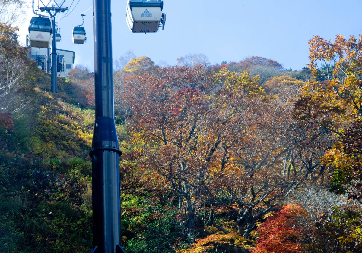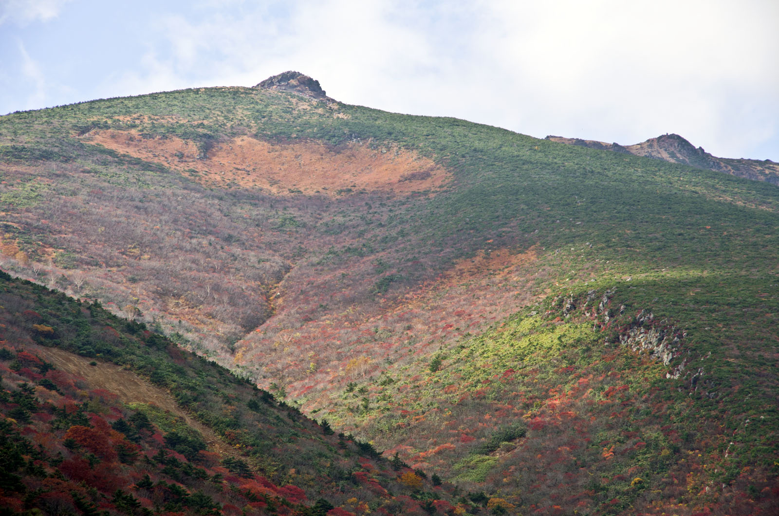 ![]() 薬師岳展望台(ロープウエイの山頂駅)からの安達太良山 中腹の紅葉が盛り |