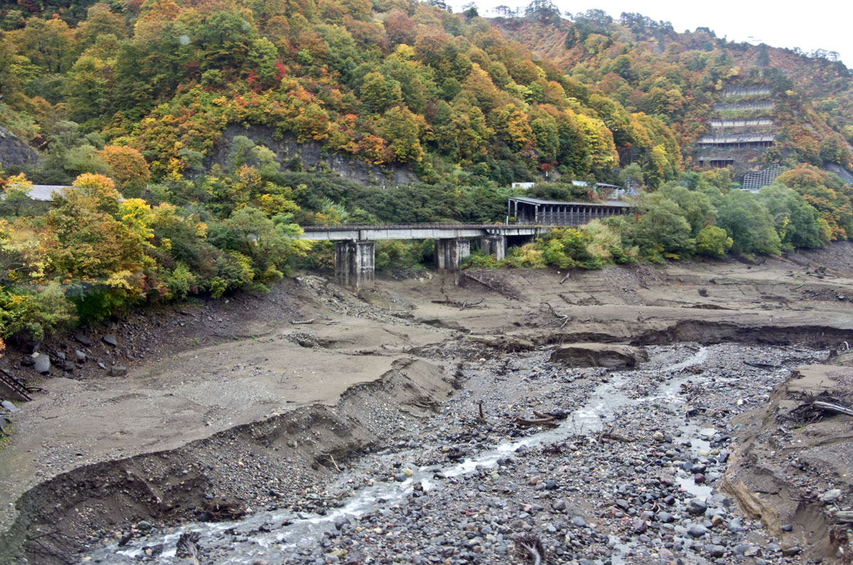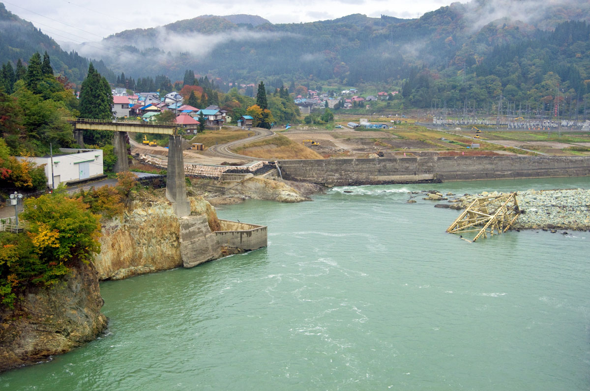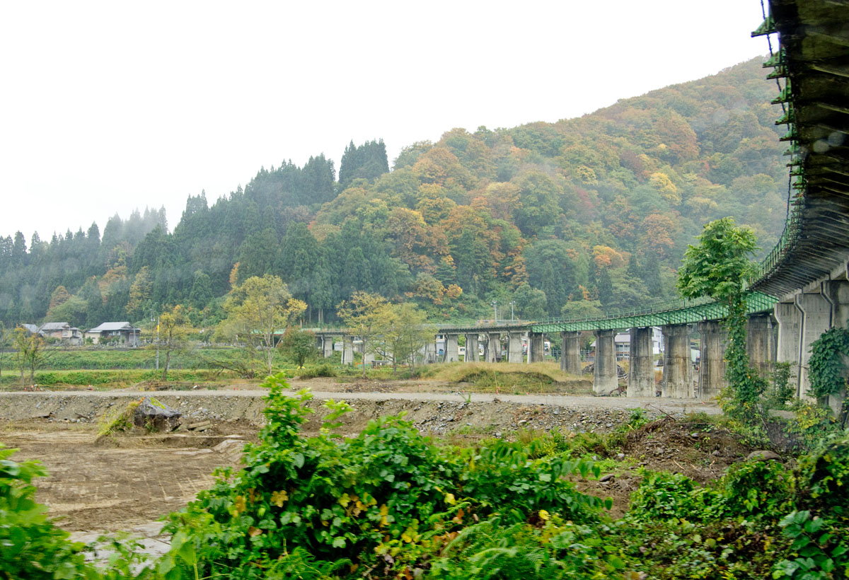 ![]() 只見川第六橋梁 大雨で倒壊したまま、 只見線が会津川口駅・大白川駅間が寸断し、 バス輸送 |