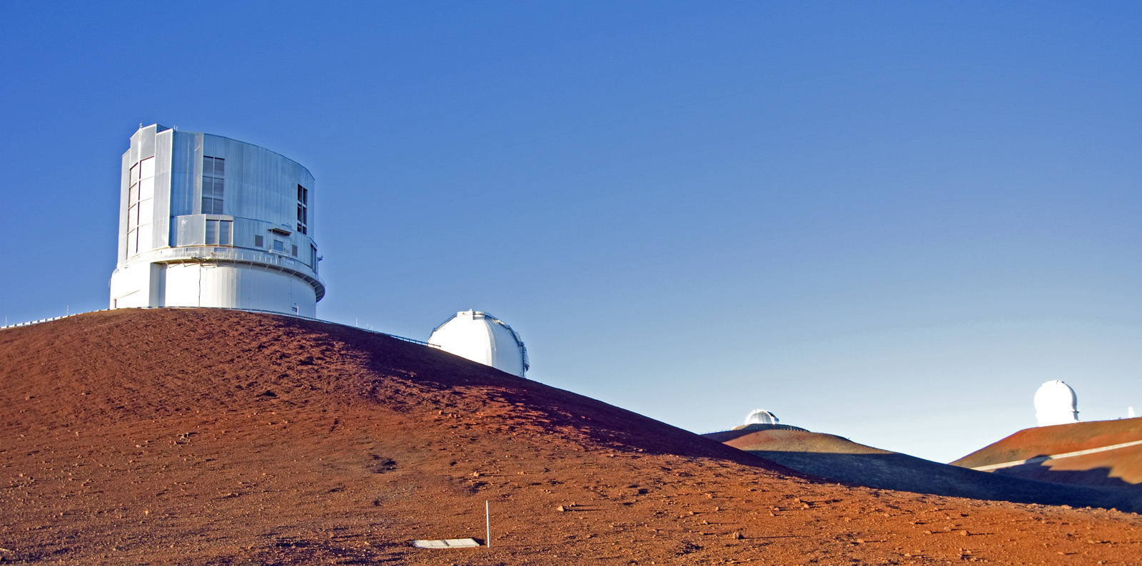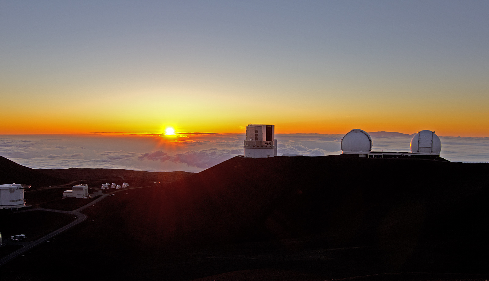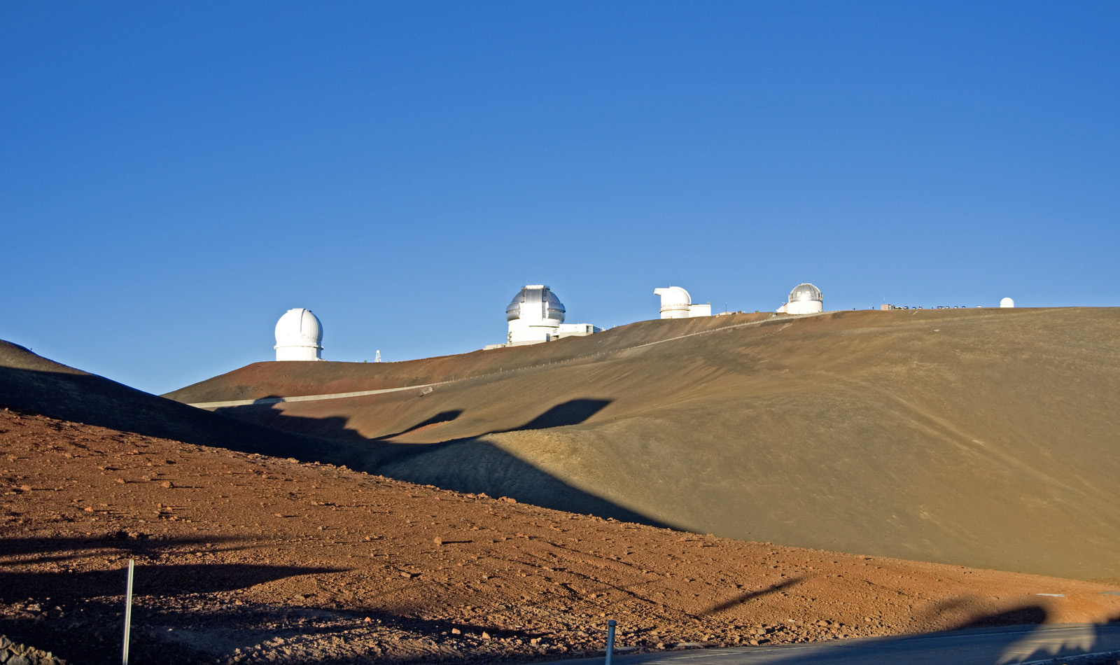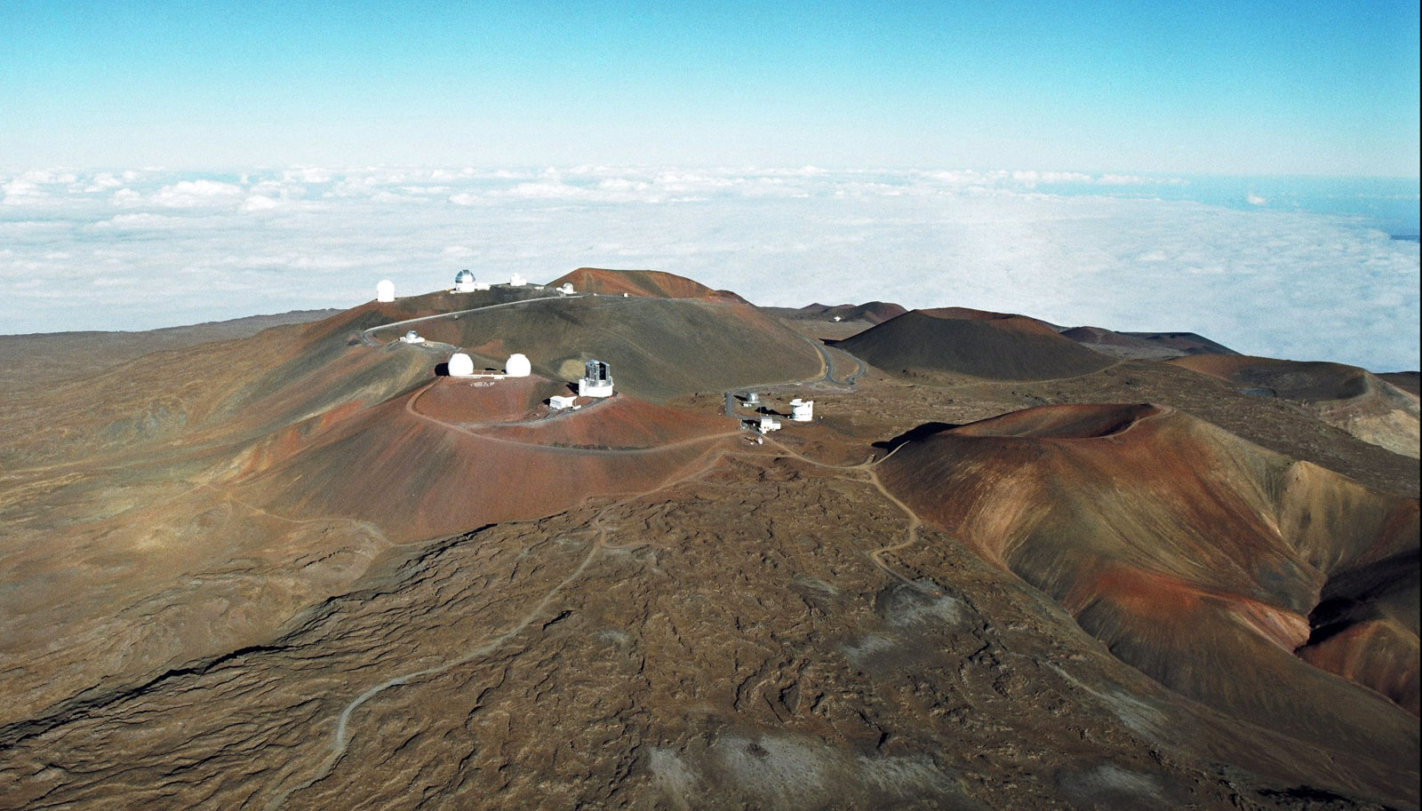 マウナケア山頁(中央奥)と各国の天体望遠鏡群 (c)国立天文台