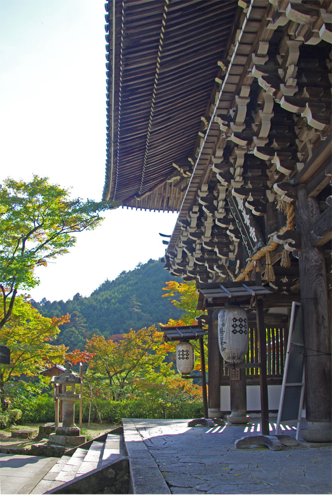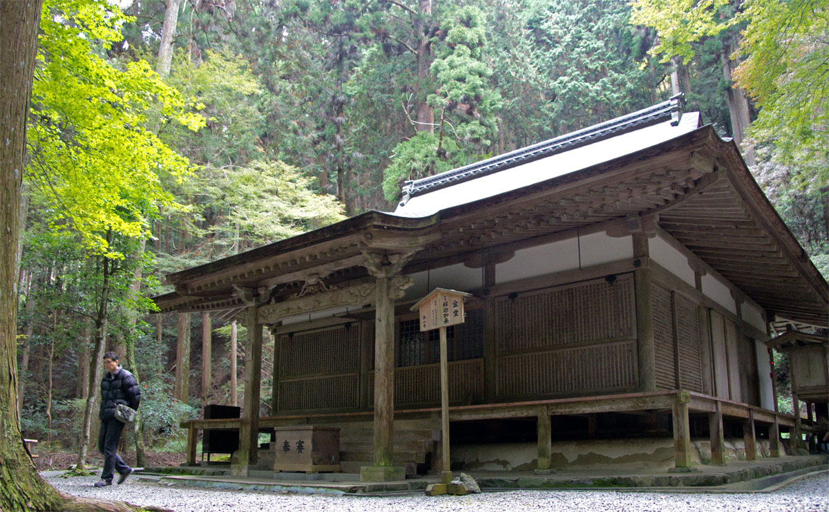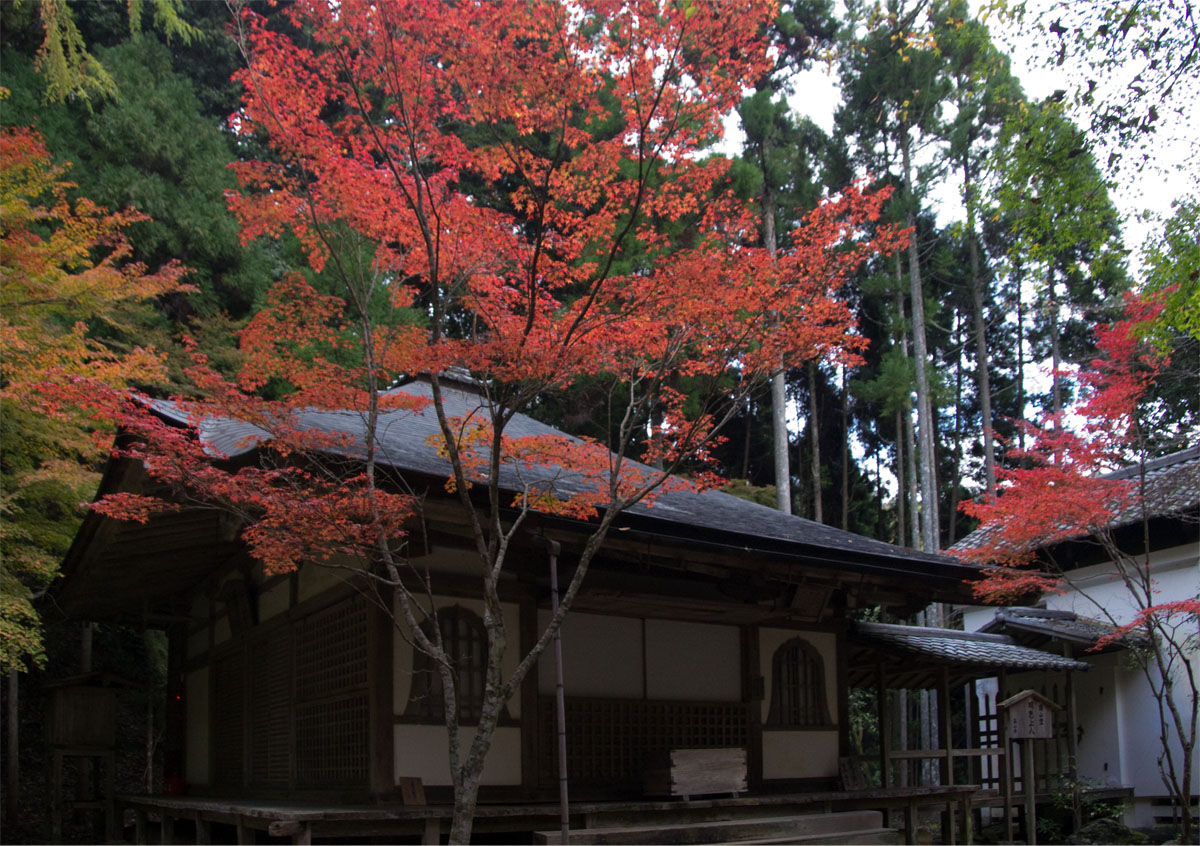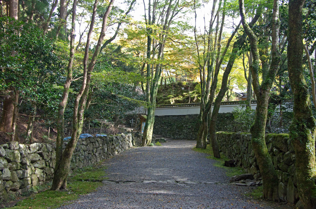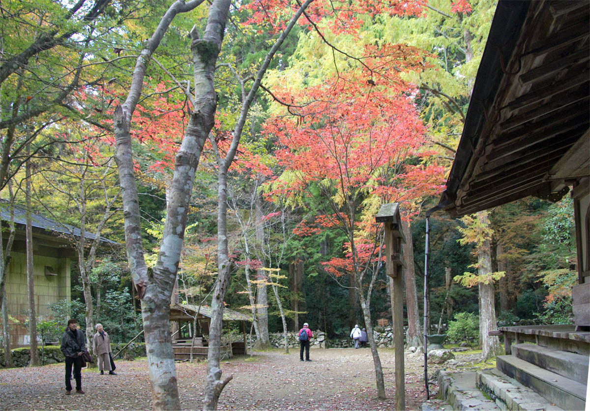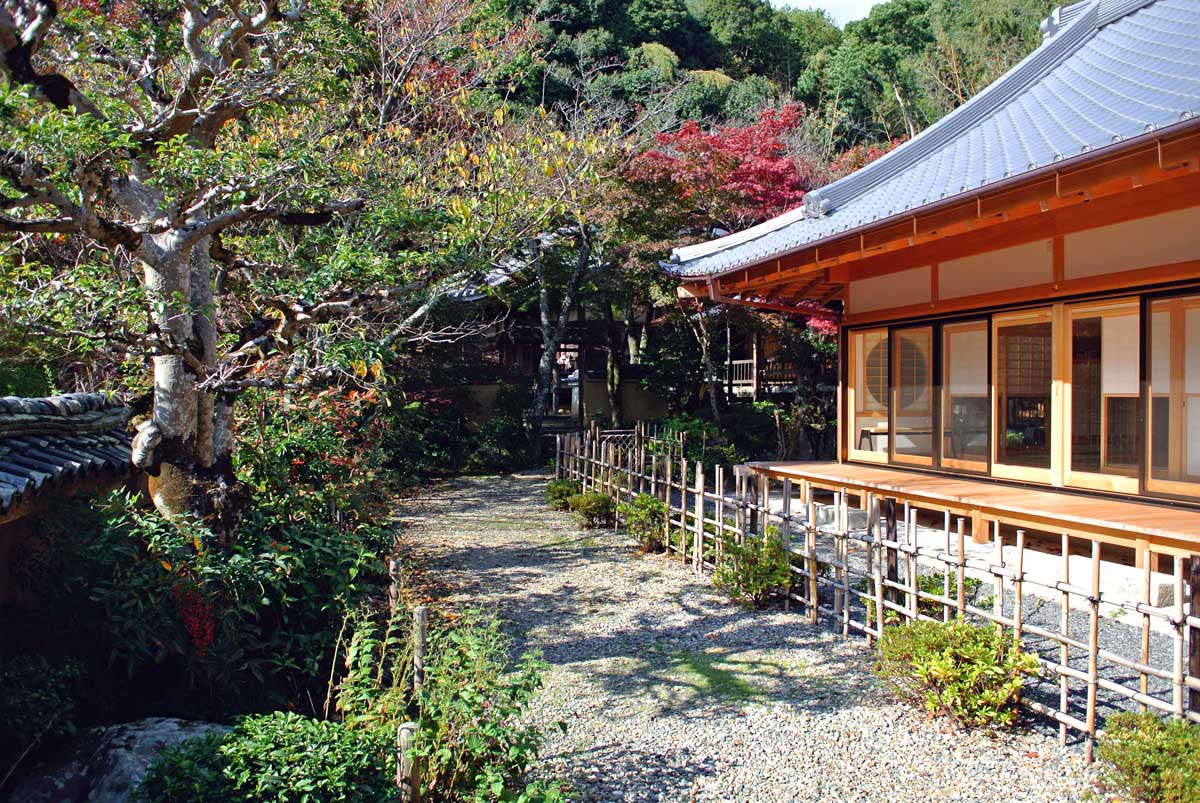右側の国宝・石水院は、後鳥羽上皇の学問所を明恵上人が住居としていた建物で、簡素な造りが特徴である. 明恵上人樹上座禅像の写し、鳥獣戯画の写し、善財童子像などが展示.石水院の庭 動画