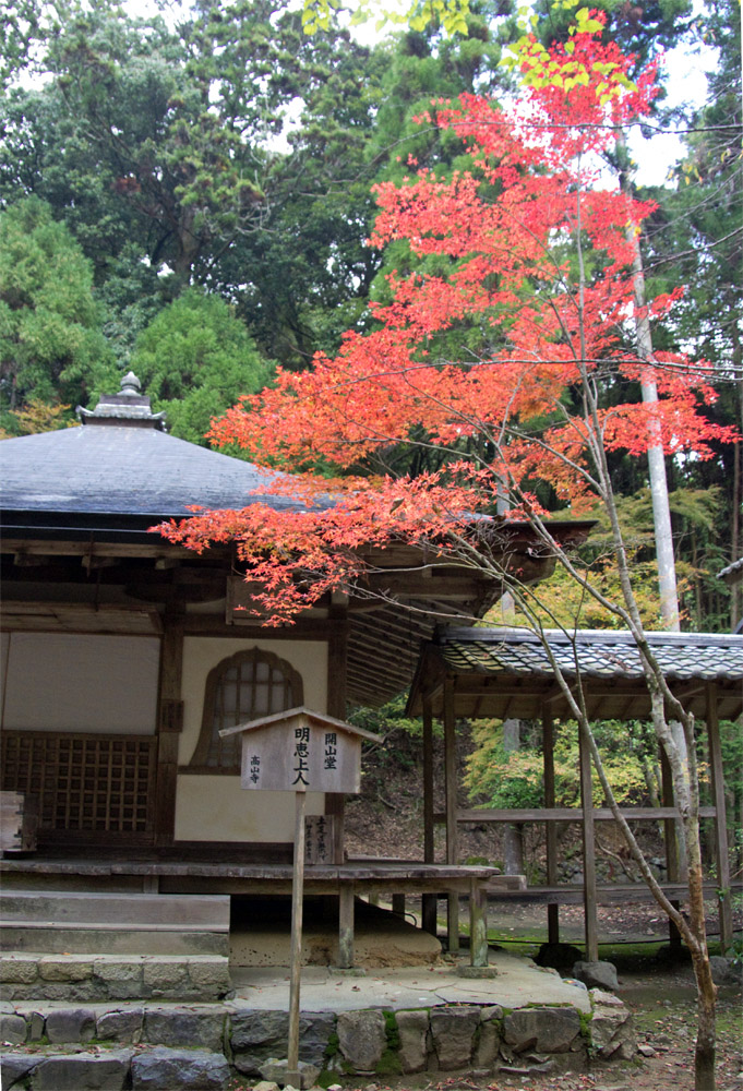 古義真言宗(こぎしんごんしゅう)の別格本山である。鎌倉の初期め、この地の天台宗の古刹・度賀尾寺(とがのおでら)が 神護寺の文覚上人によって復興され、神護寺の別院となった.間もなく荒廃したが、 建永元年(1206)、後鳥羽上皇の命で明恵(みょうえ)上人が華厳宗の道場として再興したのが高山寺の始まり. 以後、朝廷や幕府の崇信も厚く、建物や寺領の寄進も続いたが、応仁の乱で衰微し、 近世になって豊臣・徳川両氏の保護もあって寺観も整備され、華厳・真言の兼宗をやめて真言宗に転じた。