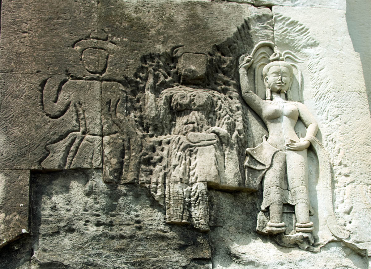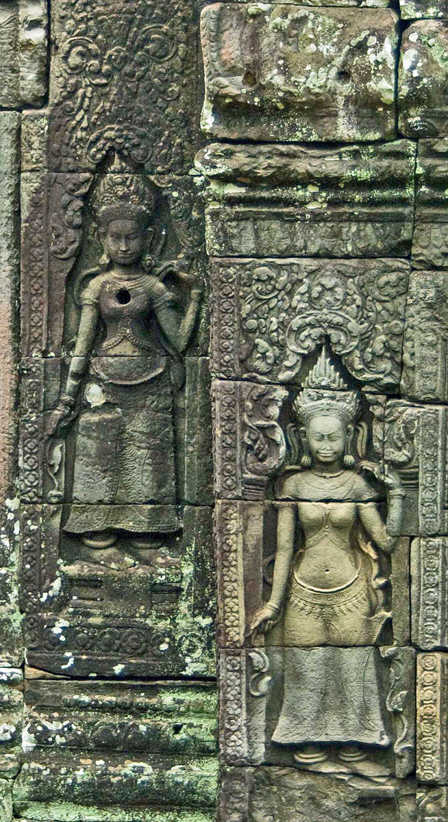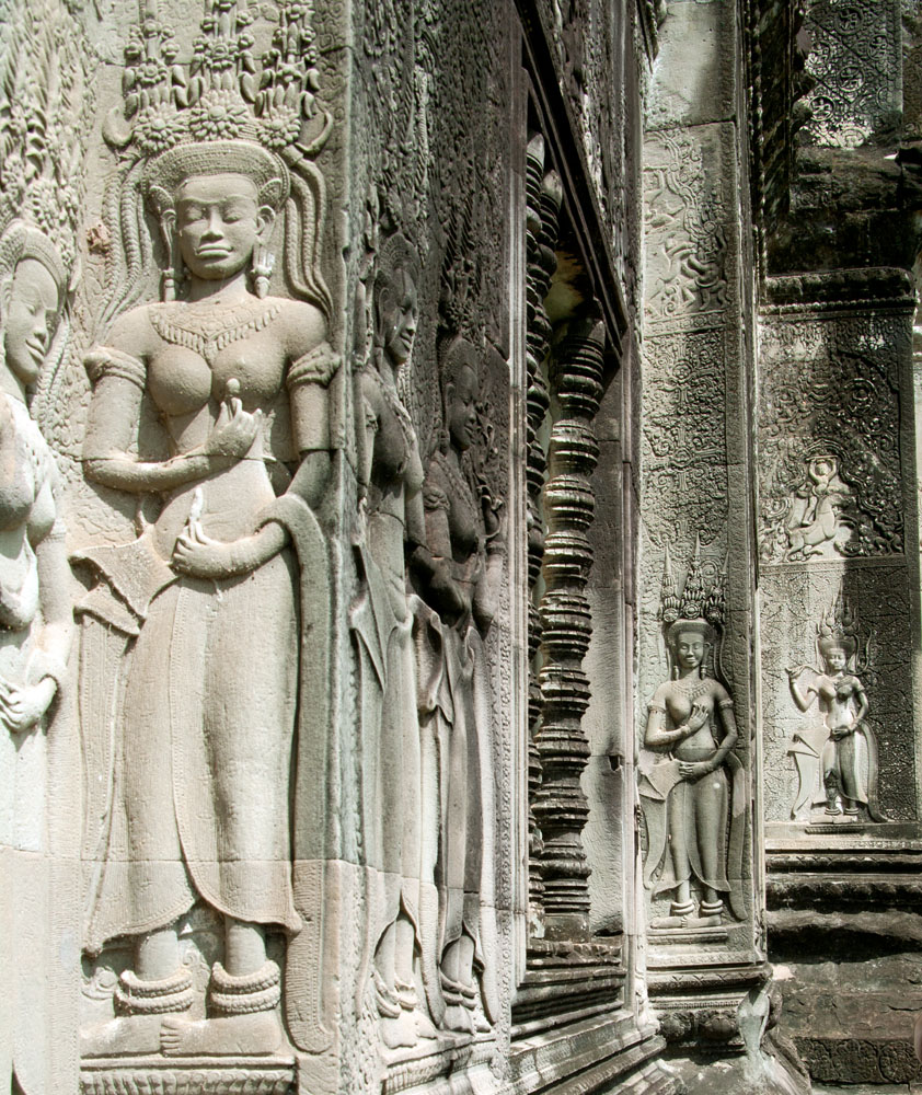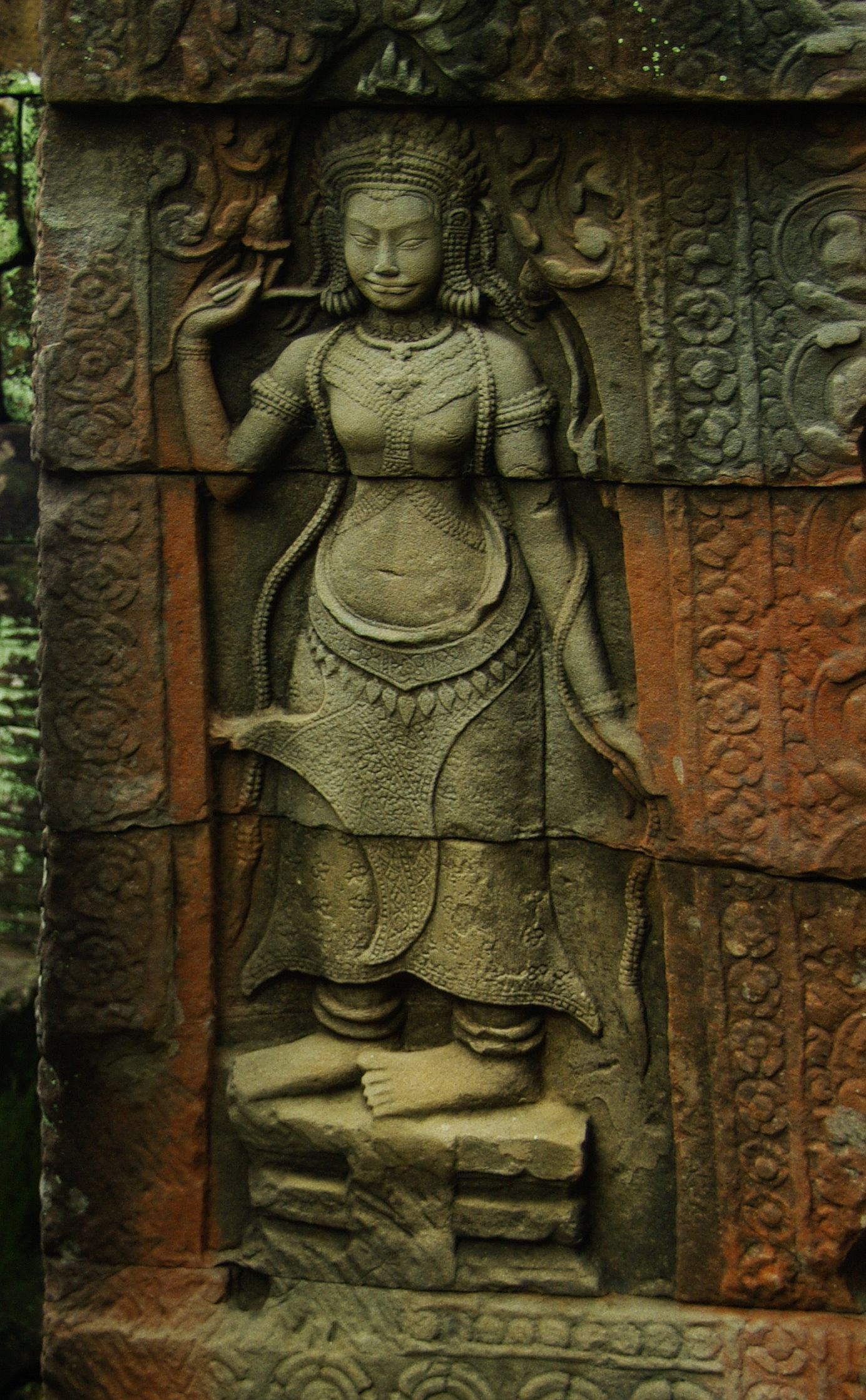 デバターは宮廷の女官をモデルにした女神のレリーフで,アンコールワット以外のほとんどの遺跡でも見られアンコール遺跡の魅力の一つです。数え切れないほど沢山あるが同じ容姿のものは一つもない。