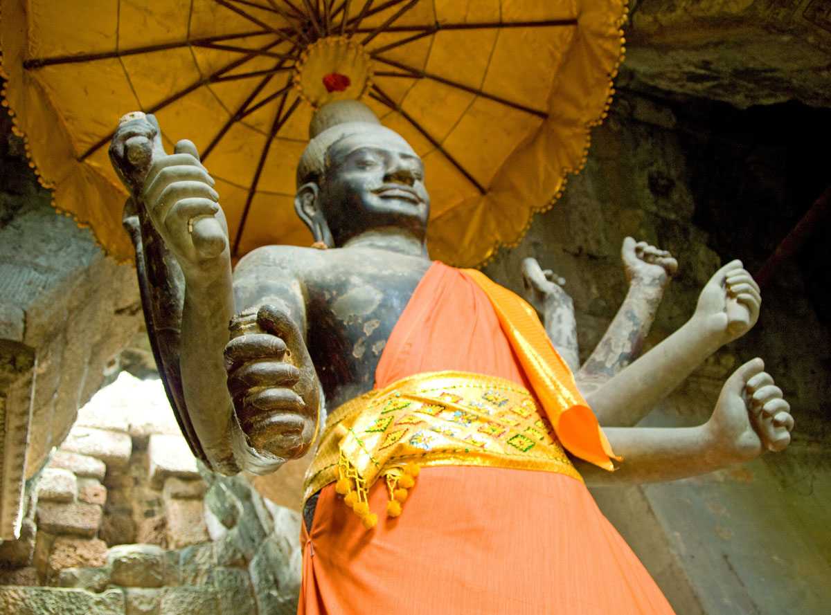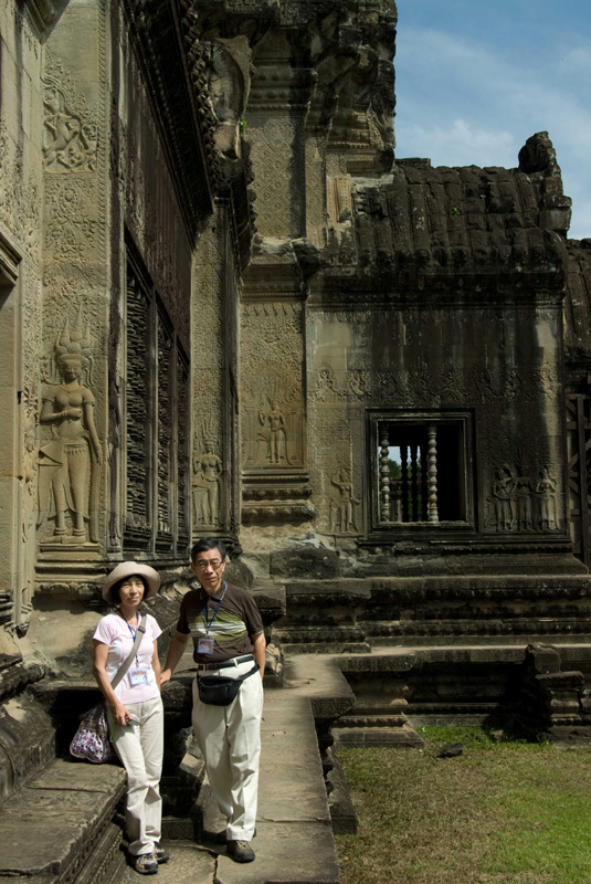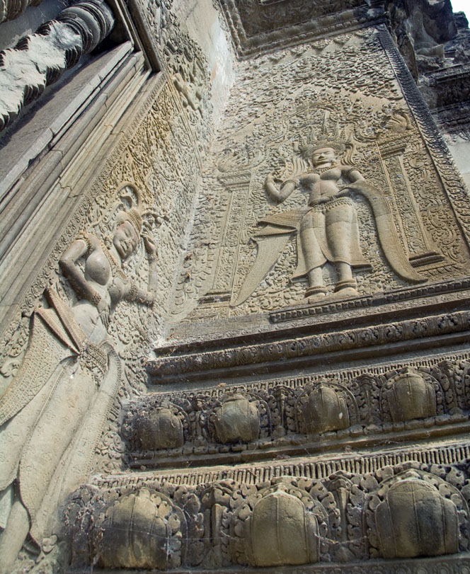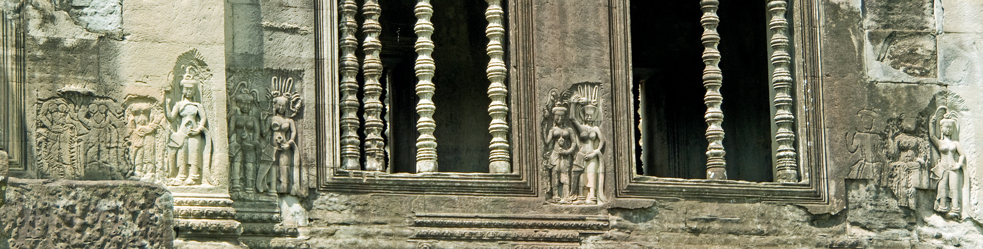 デバターは宮廷の女官をモデルにした女神のレリーフで,アンコールワット以外のほとんどの遺跡でも見られアンコール遺跡の魅力の一つです。数え切れないほど沢山あるが同じ容姿のものは一つもない。