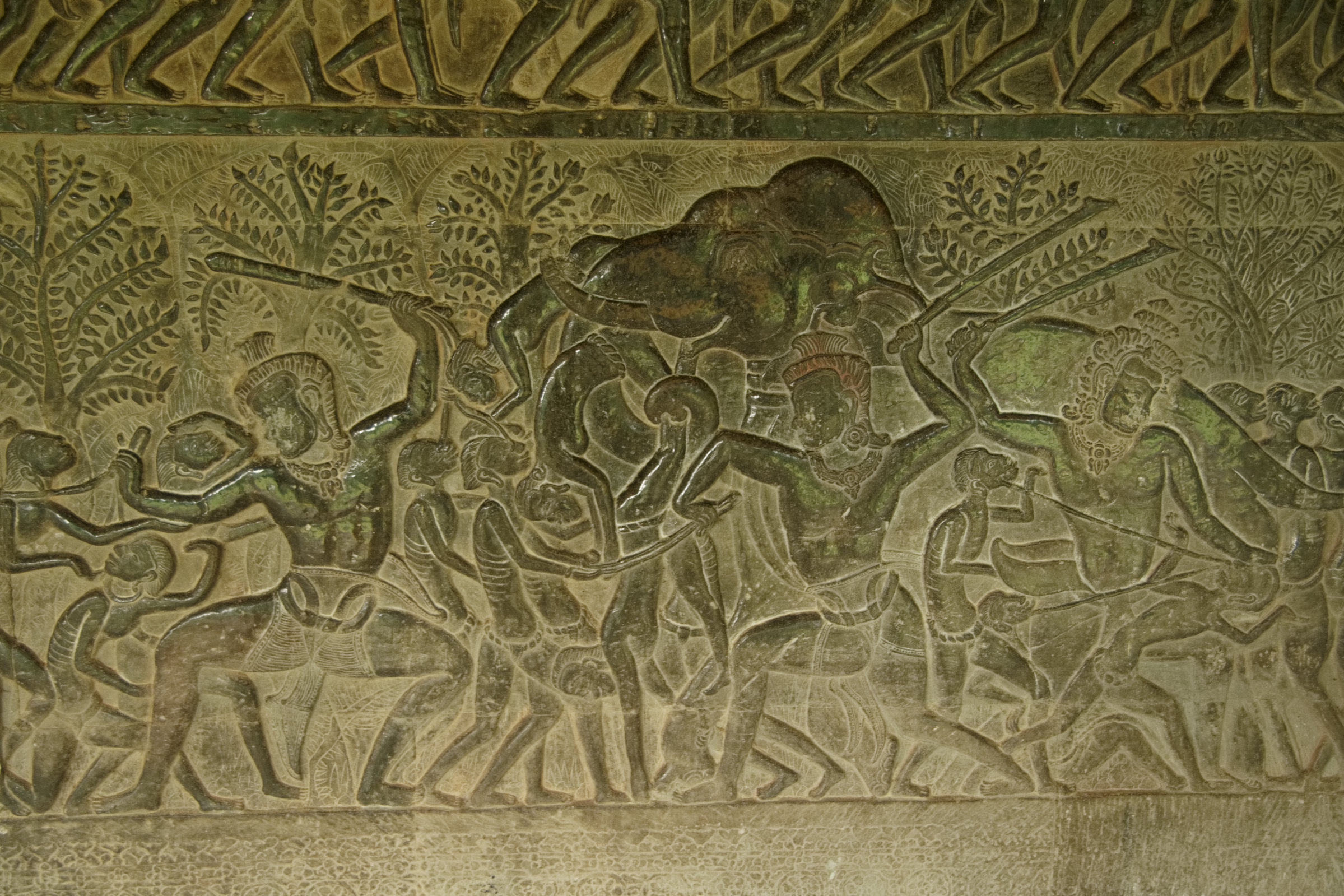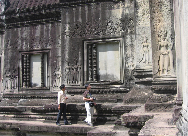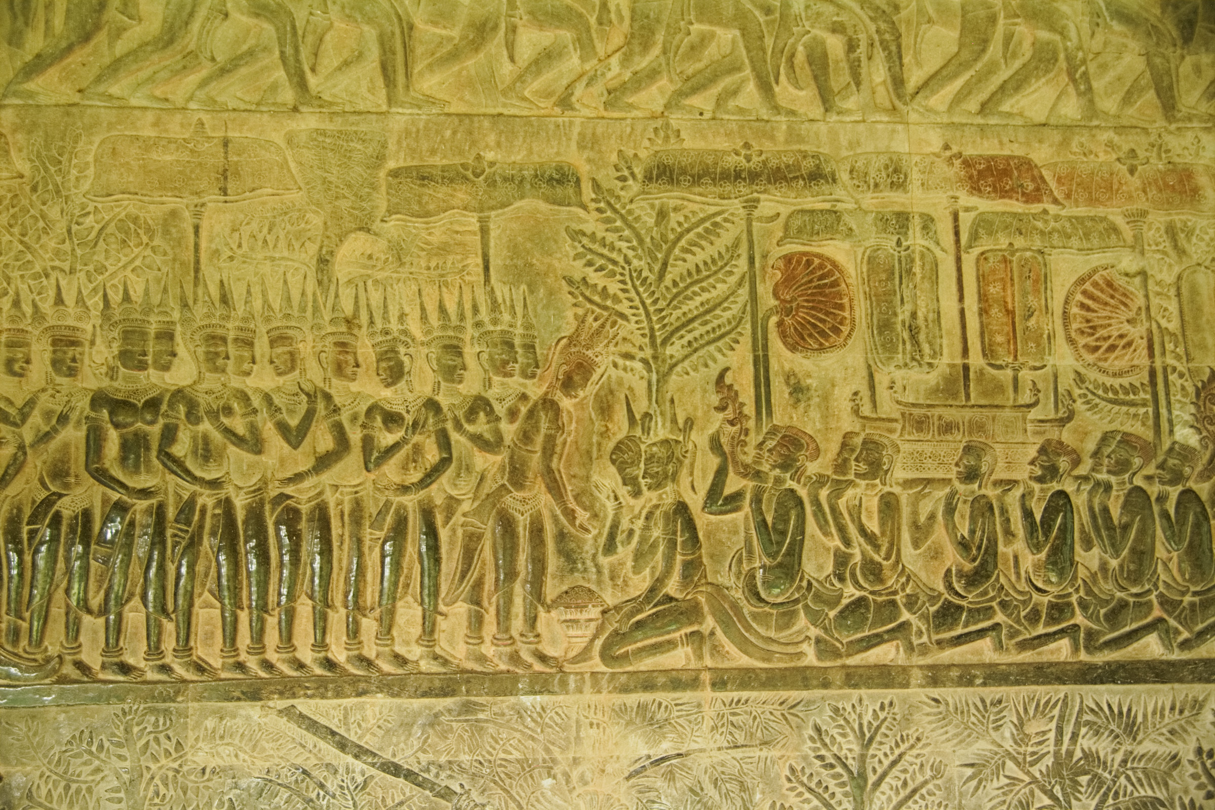 ・第一回廊は東西200m、南北180mで、多くの彫刻が施されている。西面南には、インド叙事詩『マハーバーラタ』の場面で、左から攻めるパーンダヴァ族と右から攻めるカウラヴァ族の軍が描かれている。西面北には、『ラーマーヤナ』の説話があり、ラーマ王子と猿が魔王ラーヴァナと戦う場面が大きい。南面西は「歴史回廊」と呼ばれ、スーリヤヴァルマン2世と大臣、将軍、兵士などが彫られている。南面東は「天国と地獄」と呼ばれ、上段に天国へ昇った人々、中段に閻魔大王らと裁きを待つ人々、下段に地獄へ落ちた人々が彫られている。東面南には乳海攪拌の様子が彫られている。