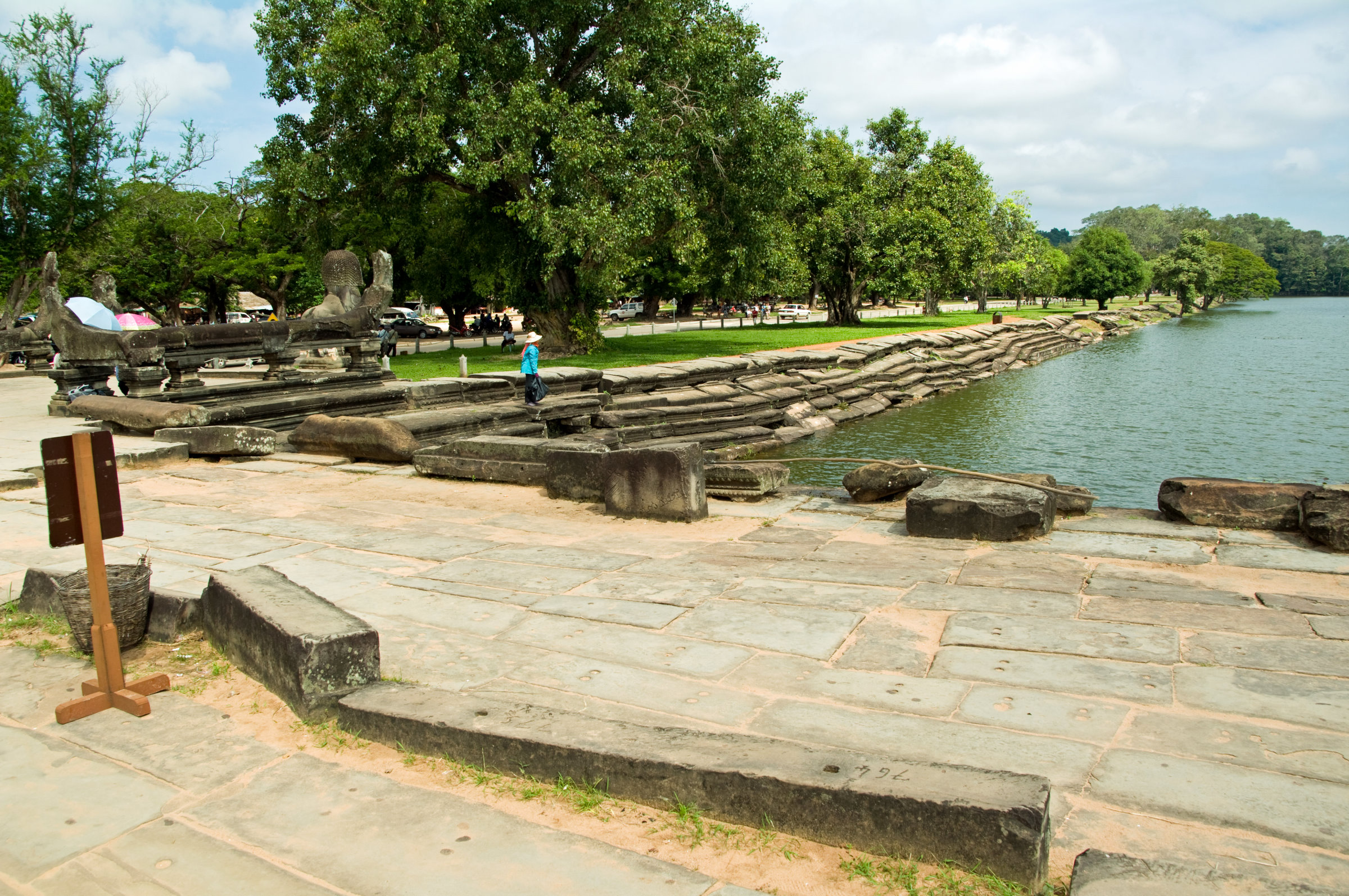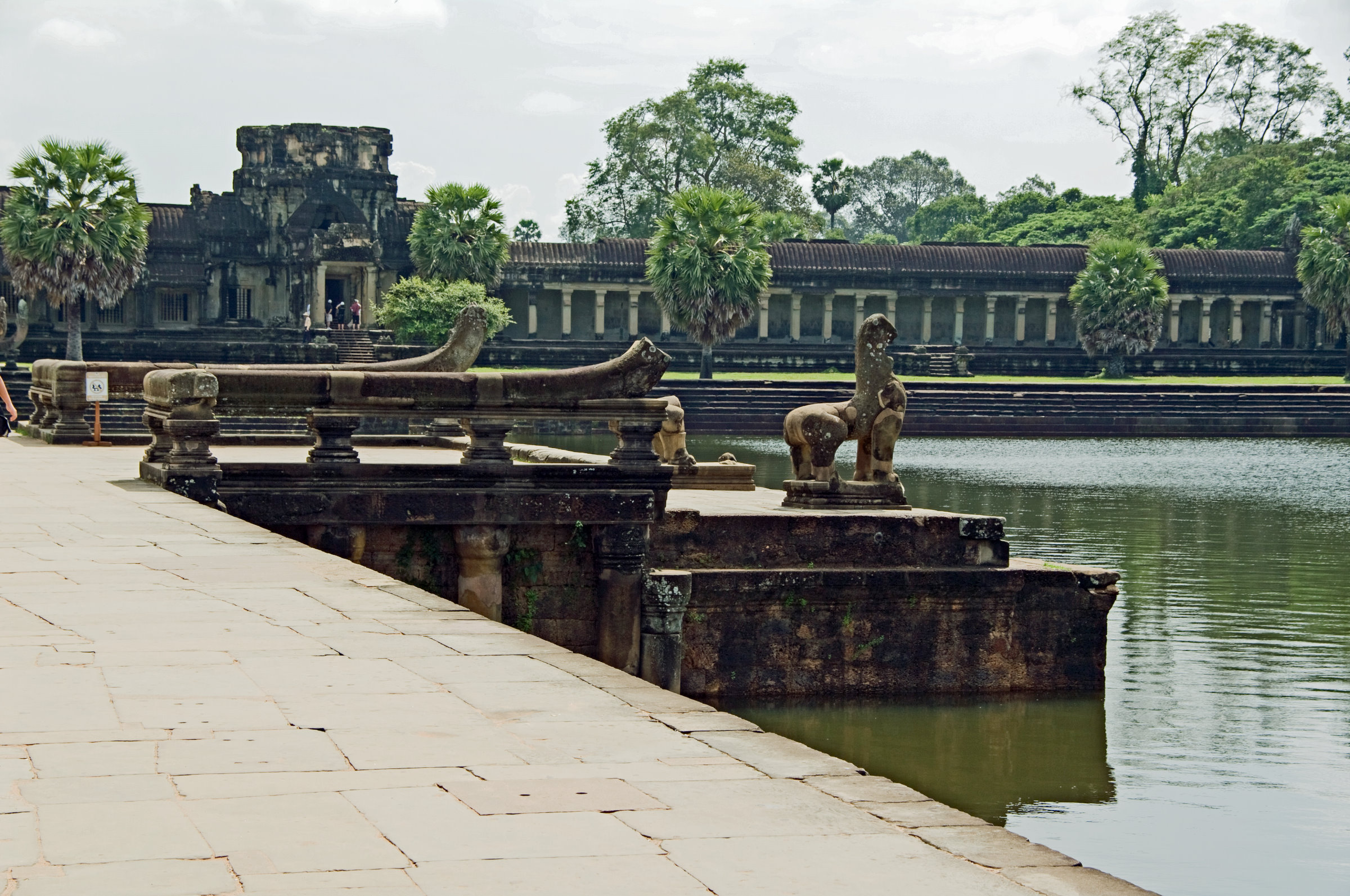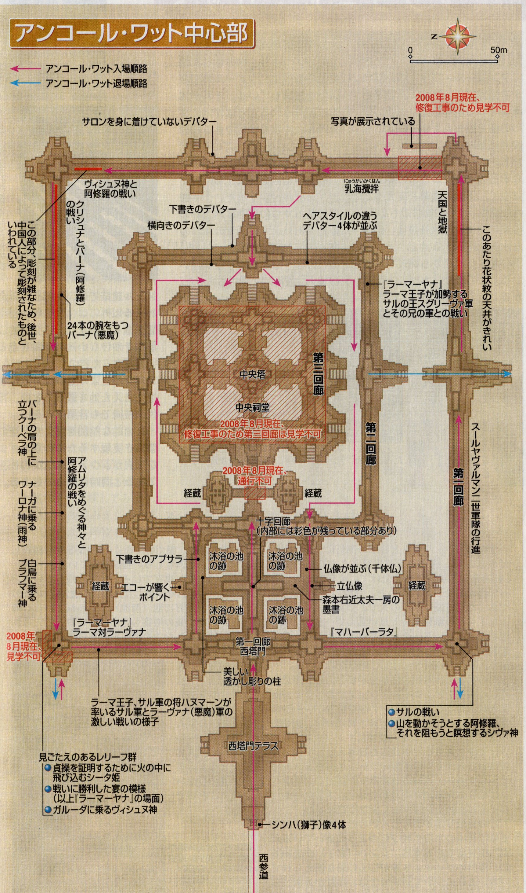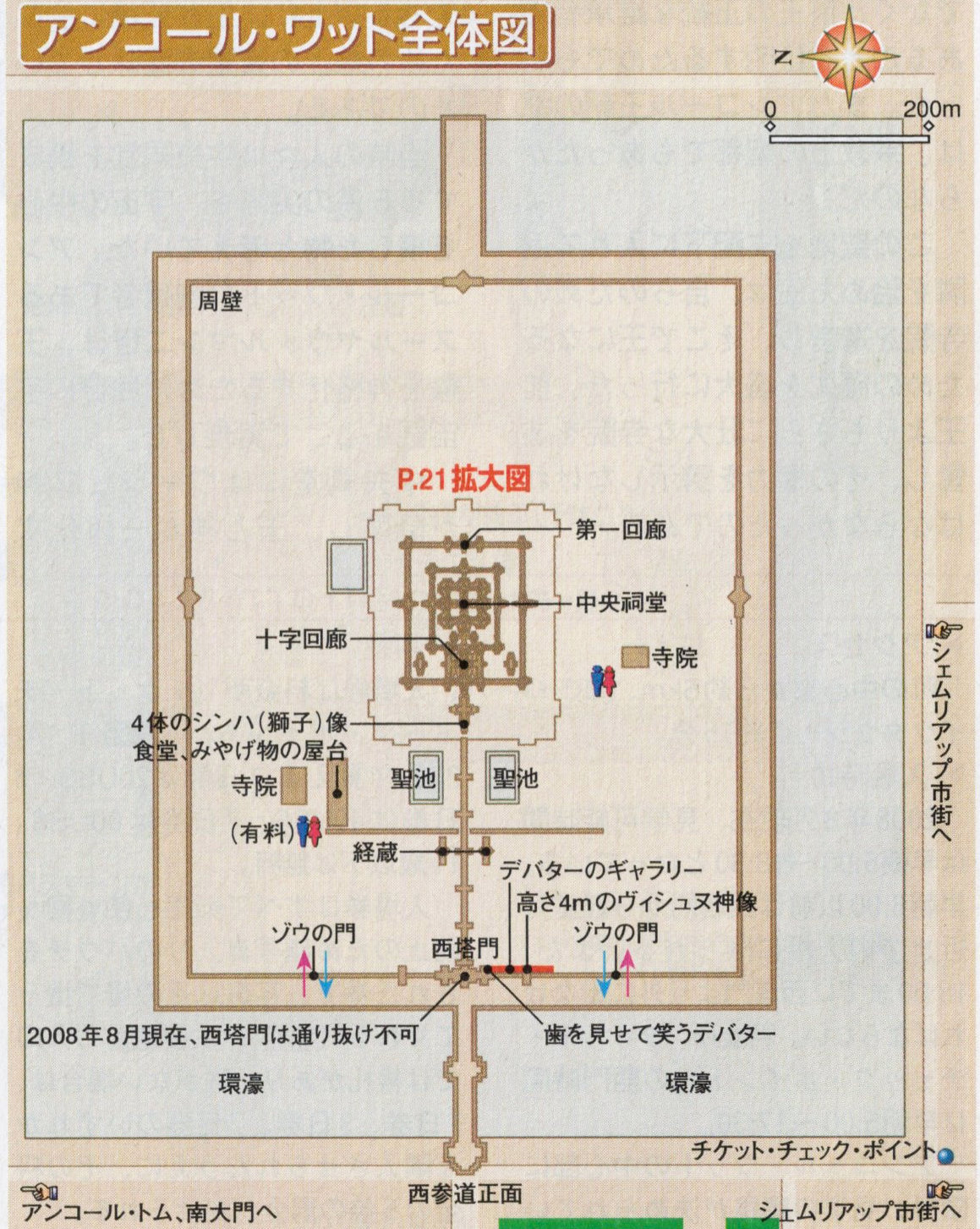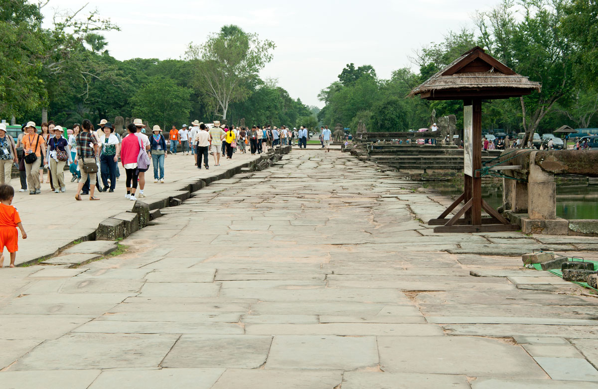 ・西参道正門から入ると外周、東西1,500m、南北1,300m、幅190mの環濠がある。砂岩ブロックが敷かれた高さ4mの土手道で環濠を渡って進む。 中程には石段の船津が備えられている。土手道を渡りると西塔門を持つ周壁へ至る。この周壁は東西1,030m、南北840mでラテライトにより築かれている。西塔門は南北230mほどの大きさで、三つの塔を持ち、中央に王の門と左右に2つの門がある。さらに南北にゾウが通れる象門が2つある。王の門の左右は7つの頭を持つ蛇神ナーガが護っている。西塔門を抜けると、大蛇の欄干に縁取られた参道を通り前庭を進む。前庭は南北にそれぞれ経蔵と聖池があり、聖池の水面に祠堂が映る。シンハが4体いる階段で西塔門テラスに上がるナーガの欄干があり、長い参道や聖池が見える。第一回廊の西塔門から三重の回廊に囲まれ5つの祠堂がそびえる中心部に入る。