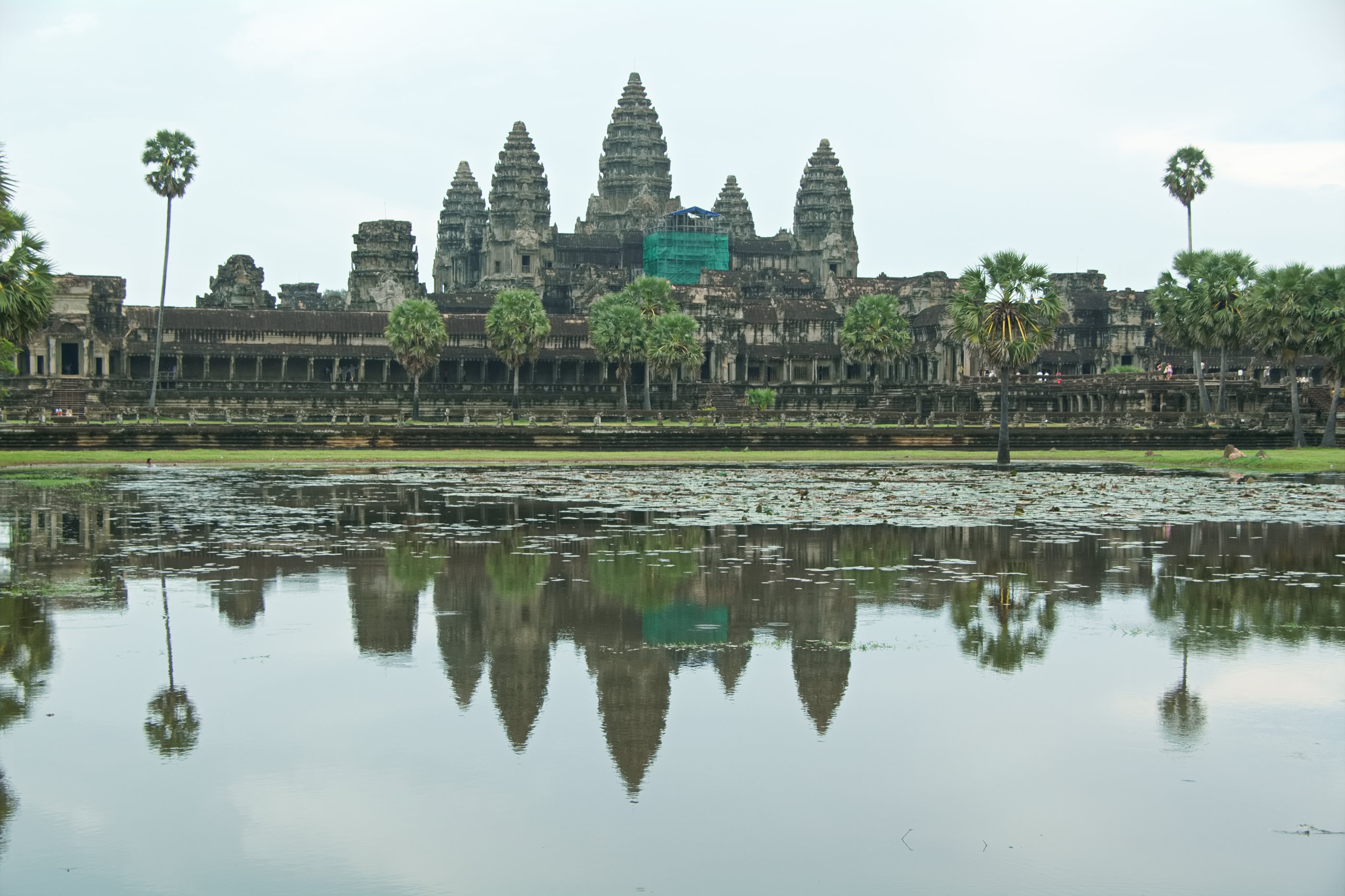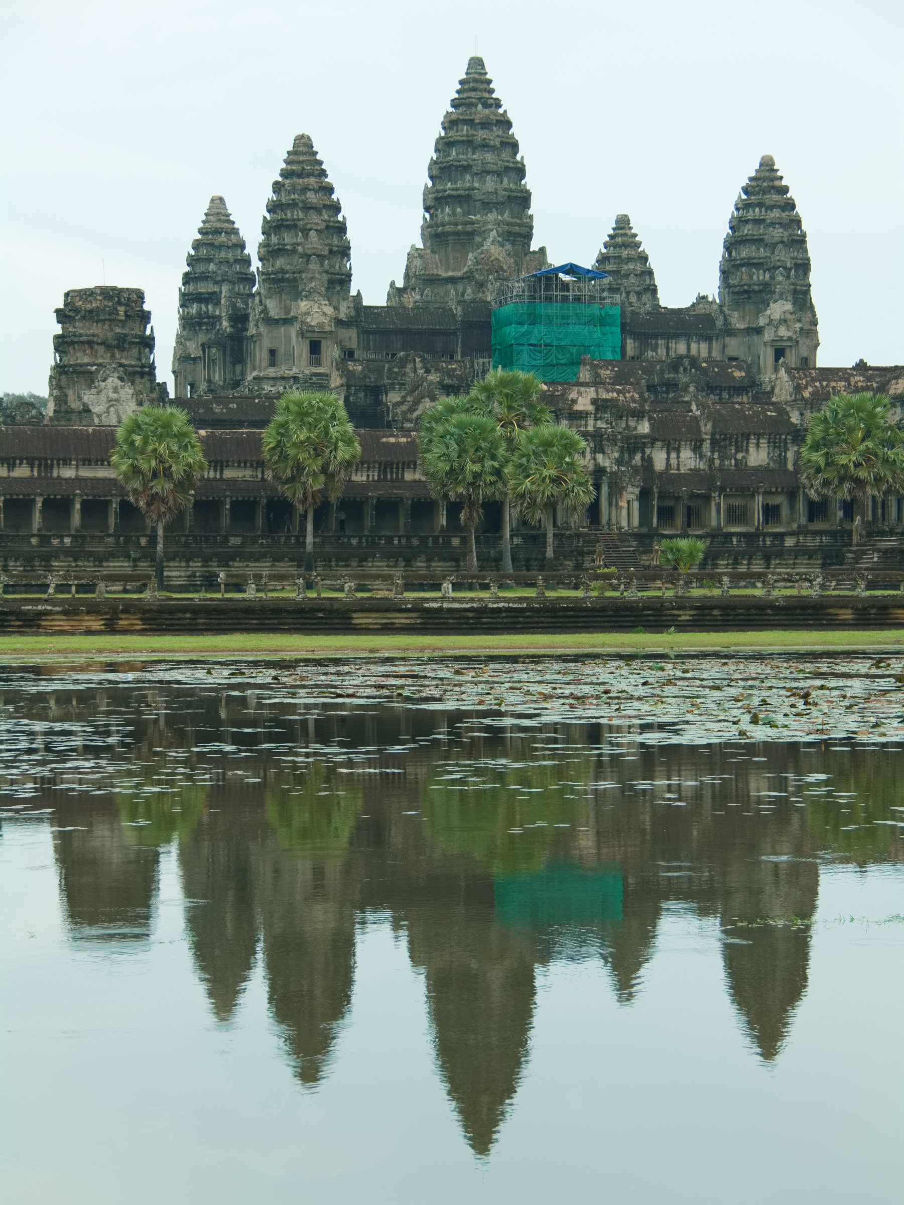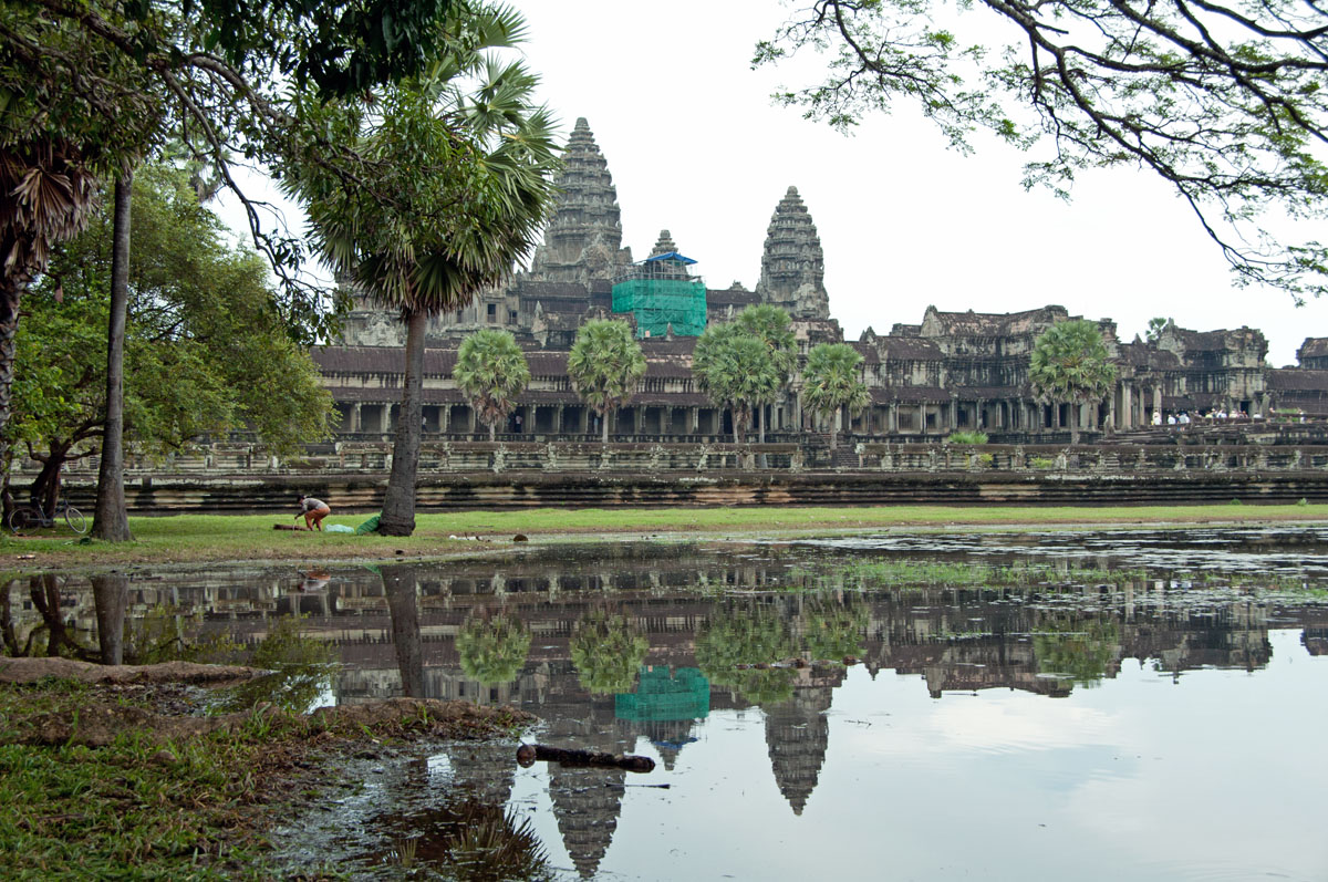 池に映るアンコールワット 中央に五個の祠堂 がそびえる
