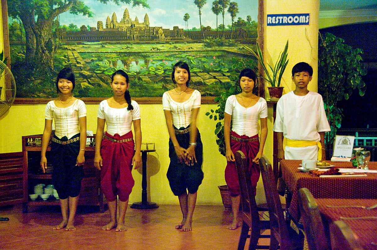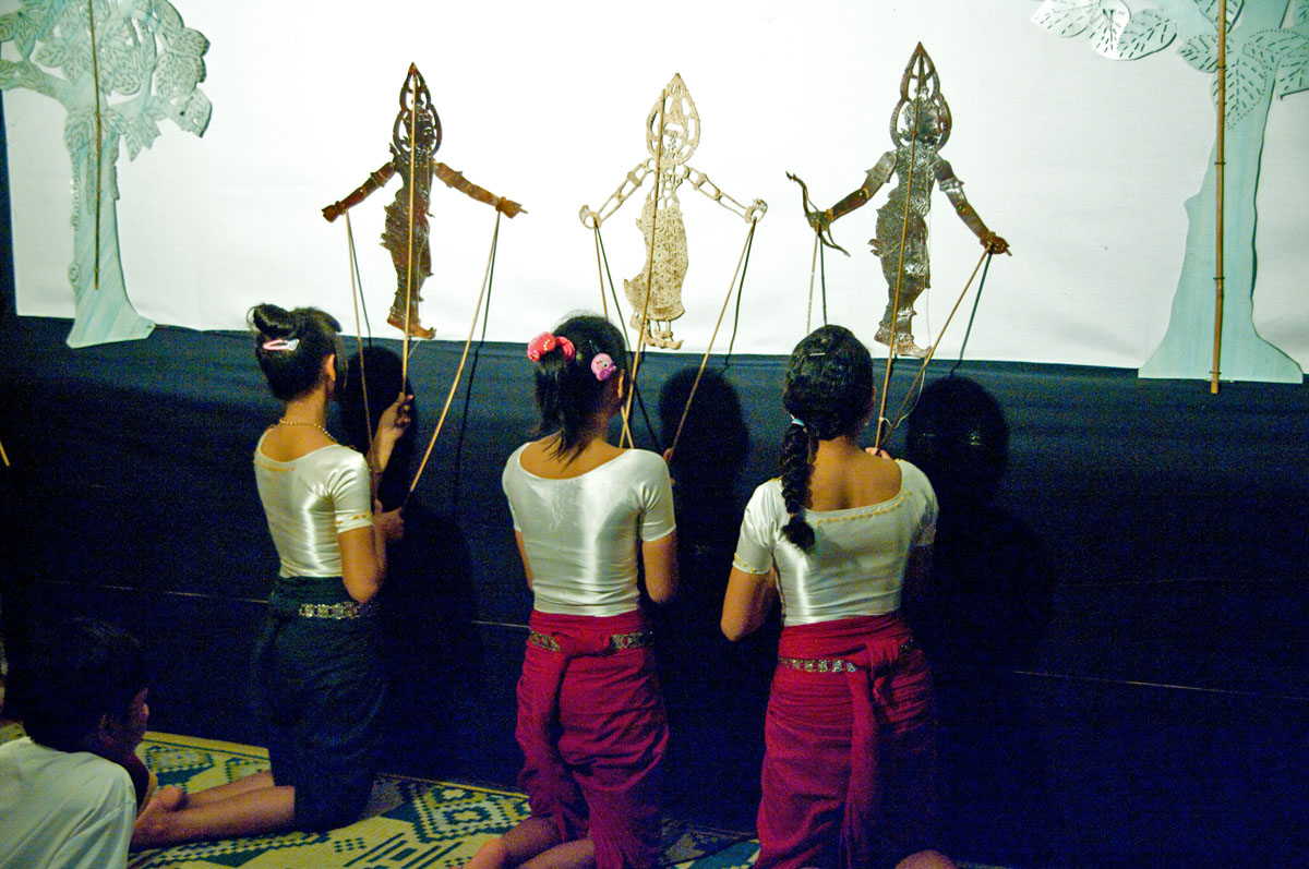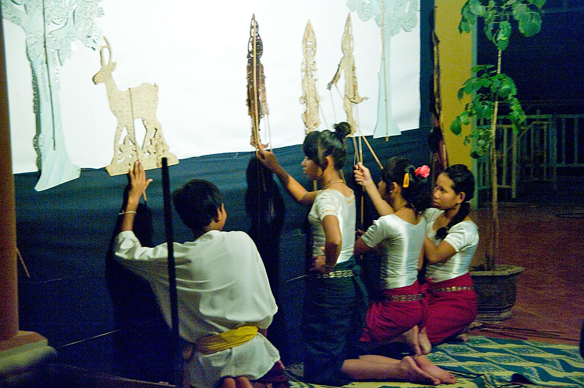 シュムリアップ市内のレストランで影絵を見ながら夕食を食べる。影絵を演じるのは若い子達