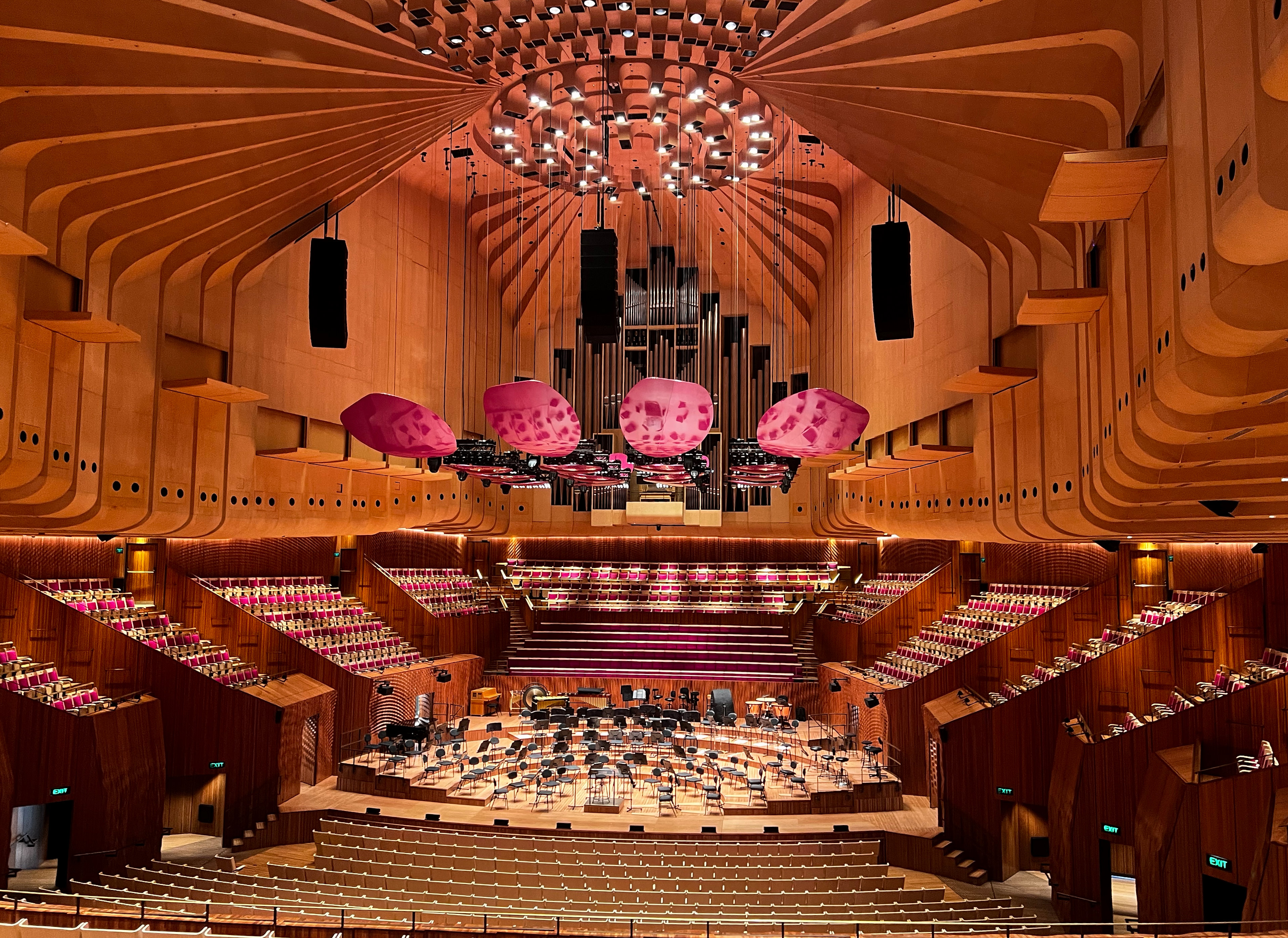 コンサートホール フルオーケストラの設定、パイプオルガン、赤い音の反射板が見える。