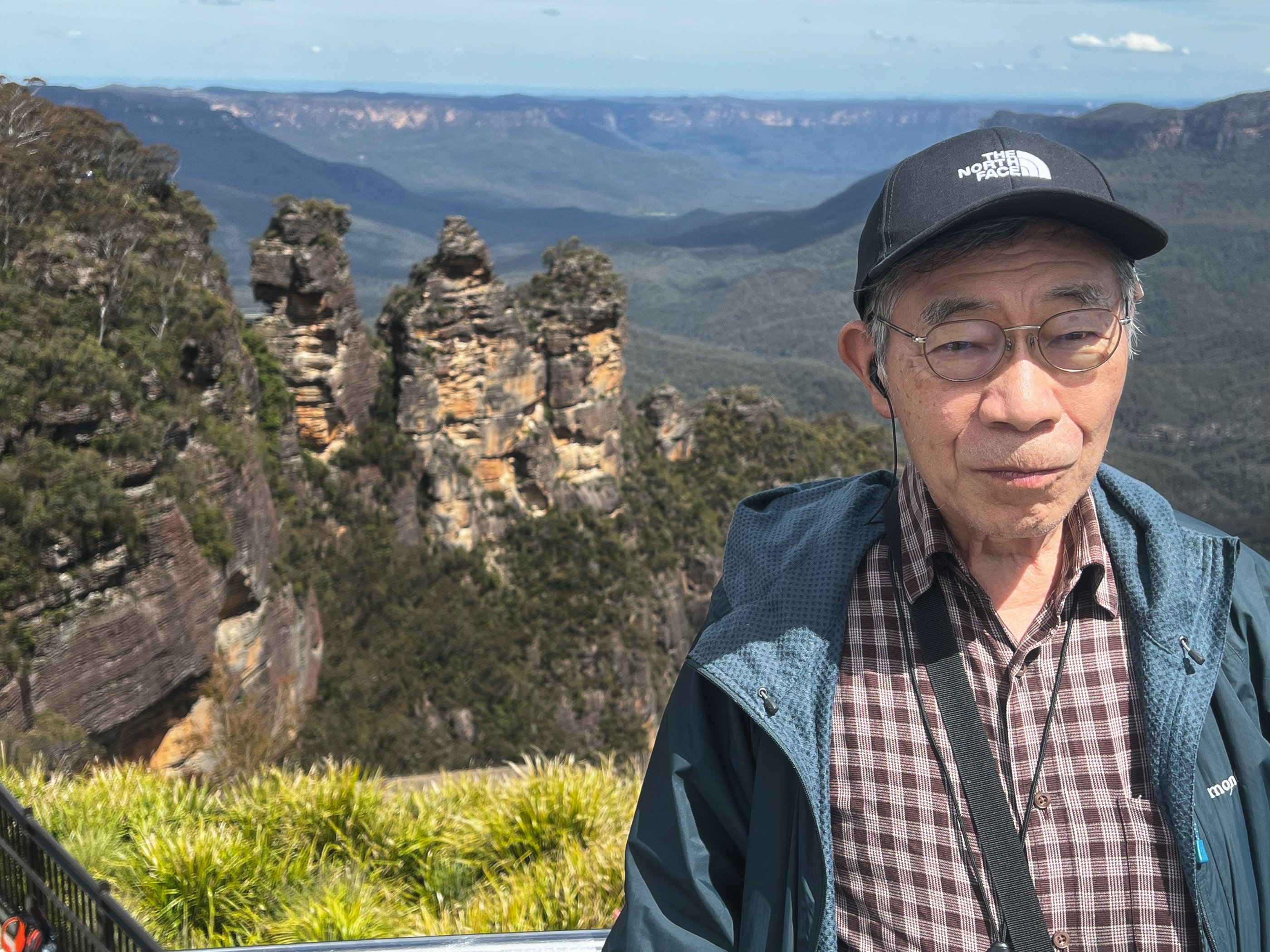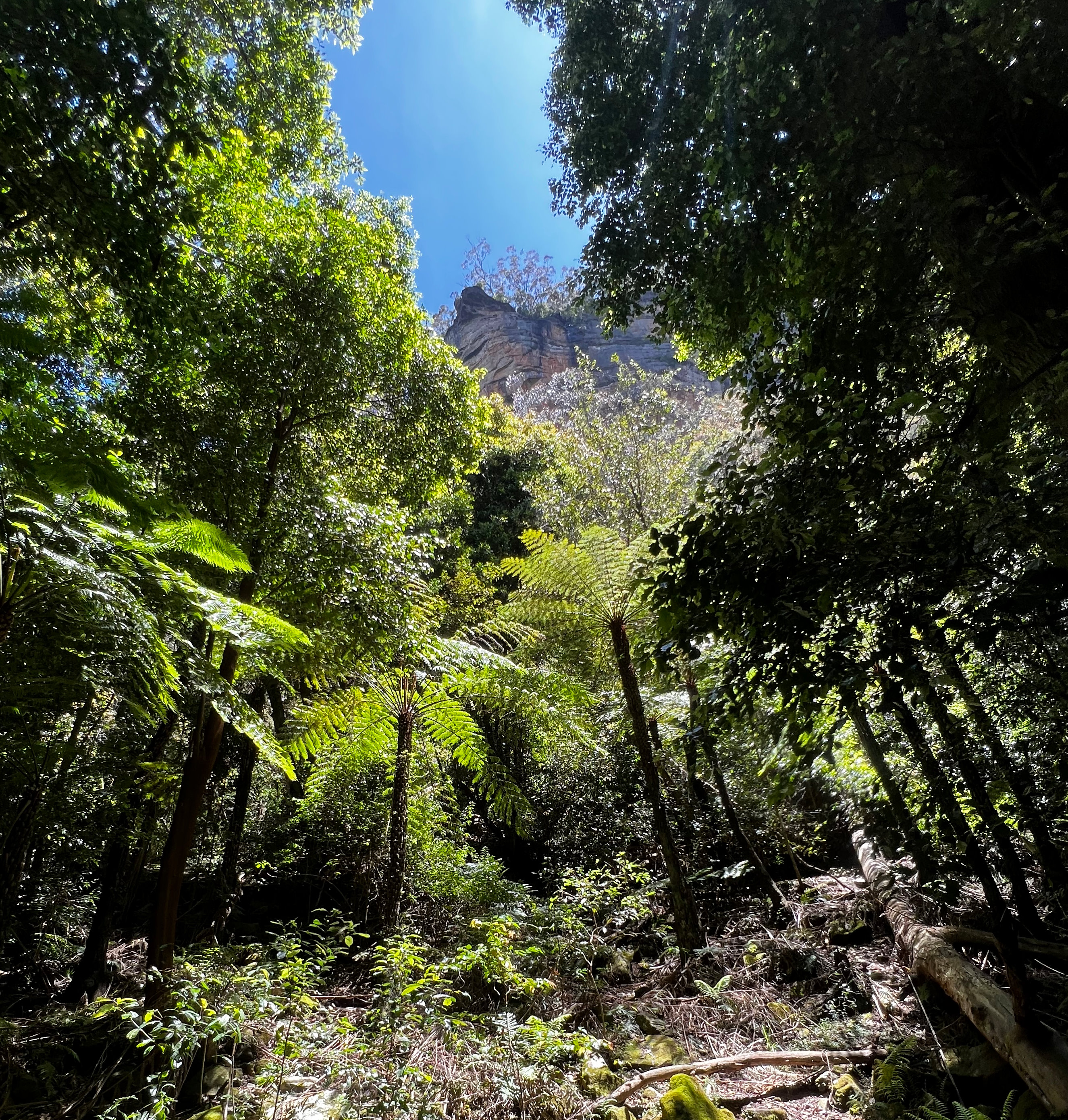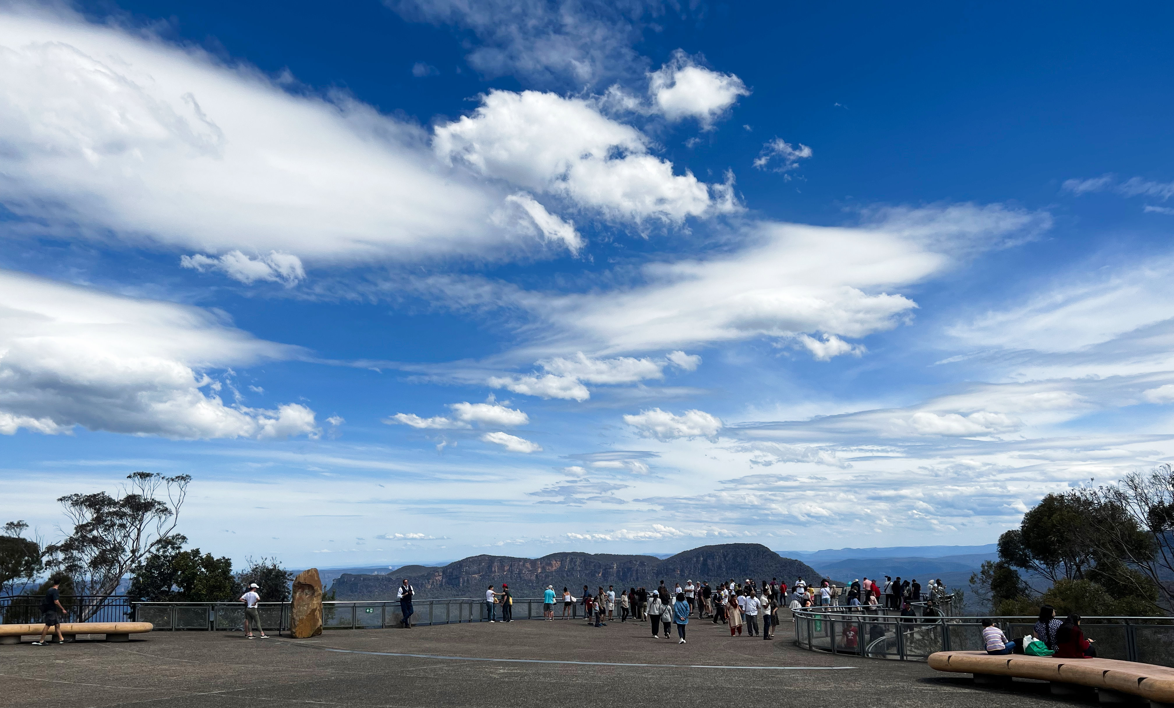 オーストラリアのグランドキャニオンと言われる。2000年に世界遺産に登録された。1億年以上前に海に堆積した厚さ1000mの砂の層が岩になり、大陸変動で隆起し、長年に渡る川の水で侵食されてジャミソン渓谷ができた。ここに生えるユーカリの葉が持つ油脂が気化して、日光に照らされて山と谷が青く光ることが名の由来。
