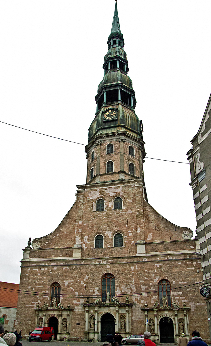 1209年時の記録によれば、教会は商人あるいはリーガの町全体の教会として建立された。教会は石造の教会として13世紀後半に建設され、その後14から15世紀に改築され、17世紀末には西側の外観が改築されてバロック様式の彫刻で装飾された現在の形になった。