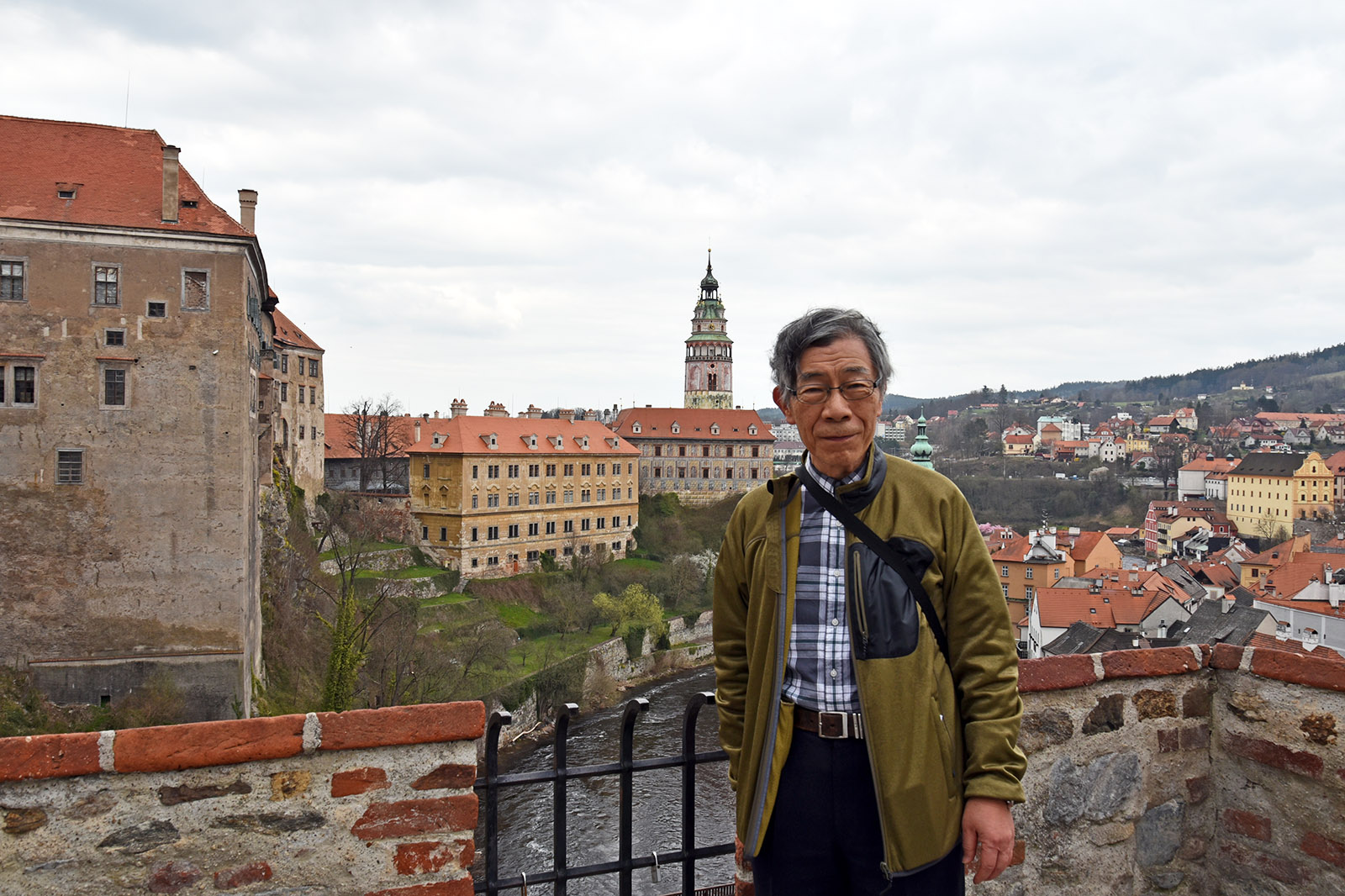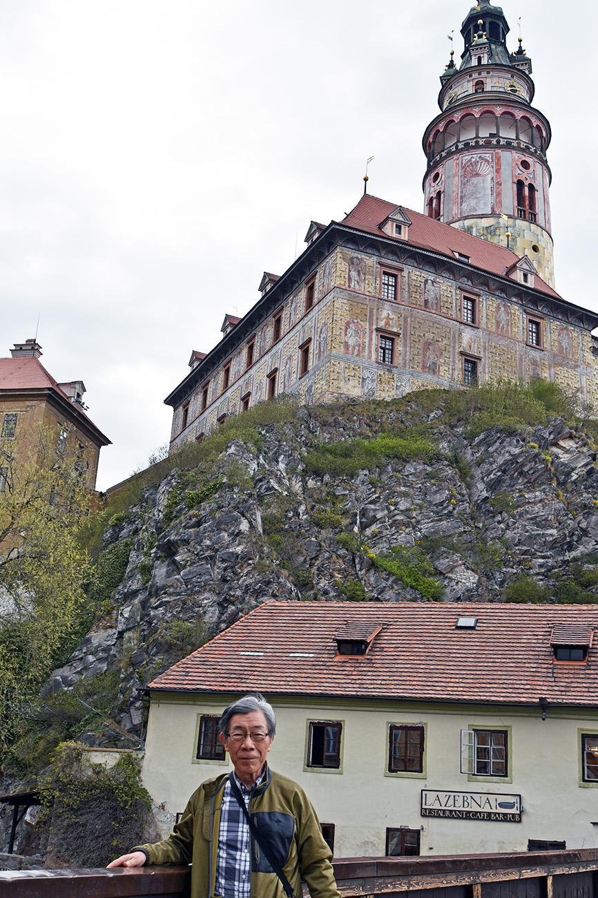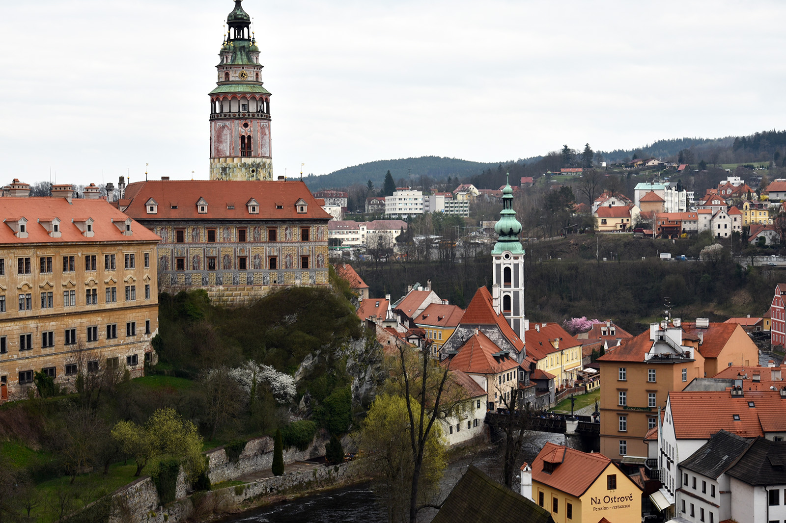 小高い展望台からチェスキークルムロフ城と旧聖ヨシュタ教会