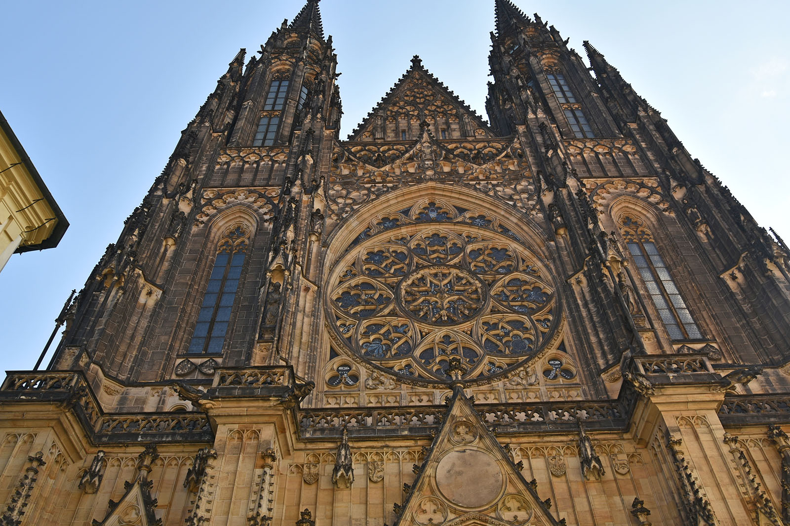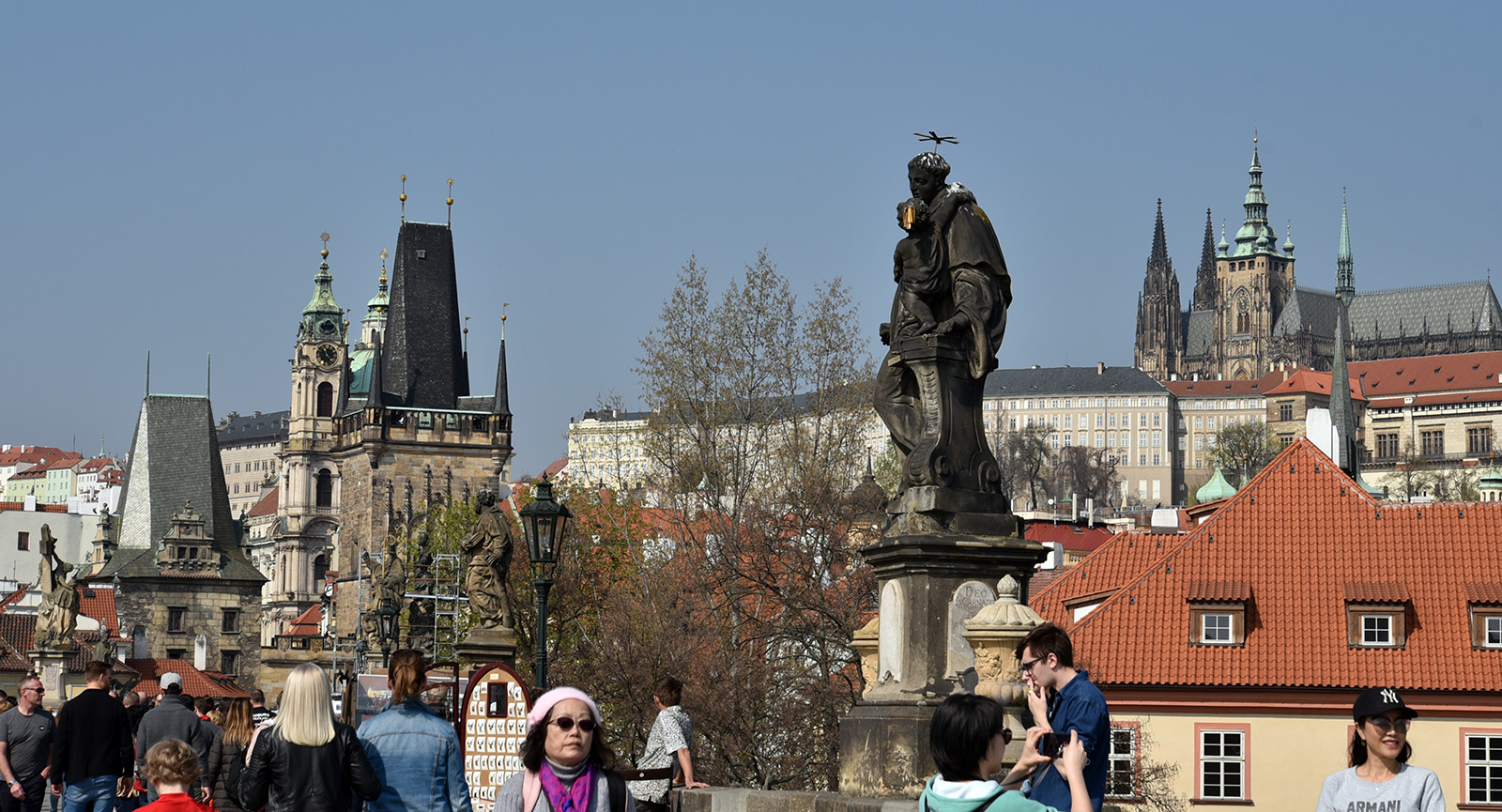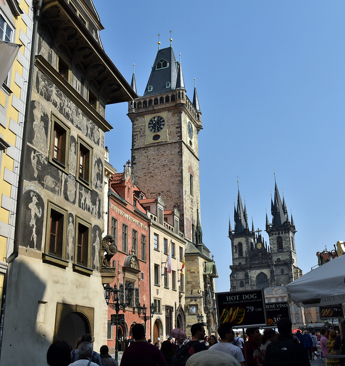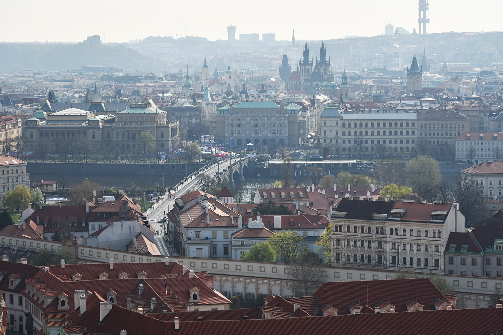 聖イジー教会のベランダから マーネス橋と旧市街の教会、旧市庁舎時計塔