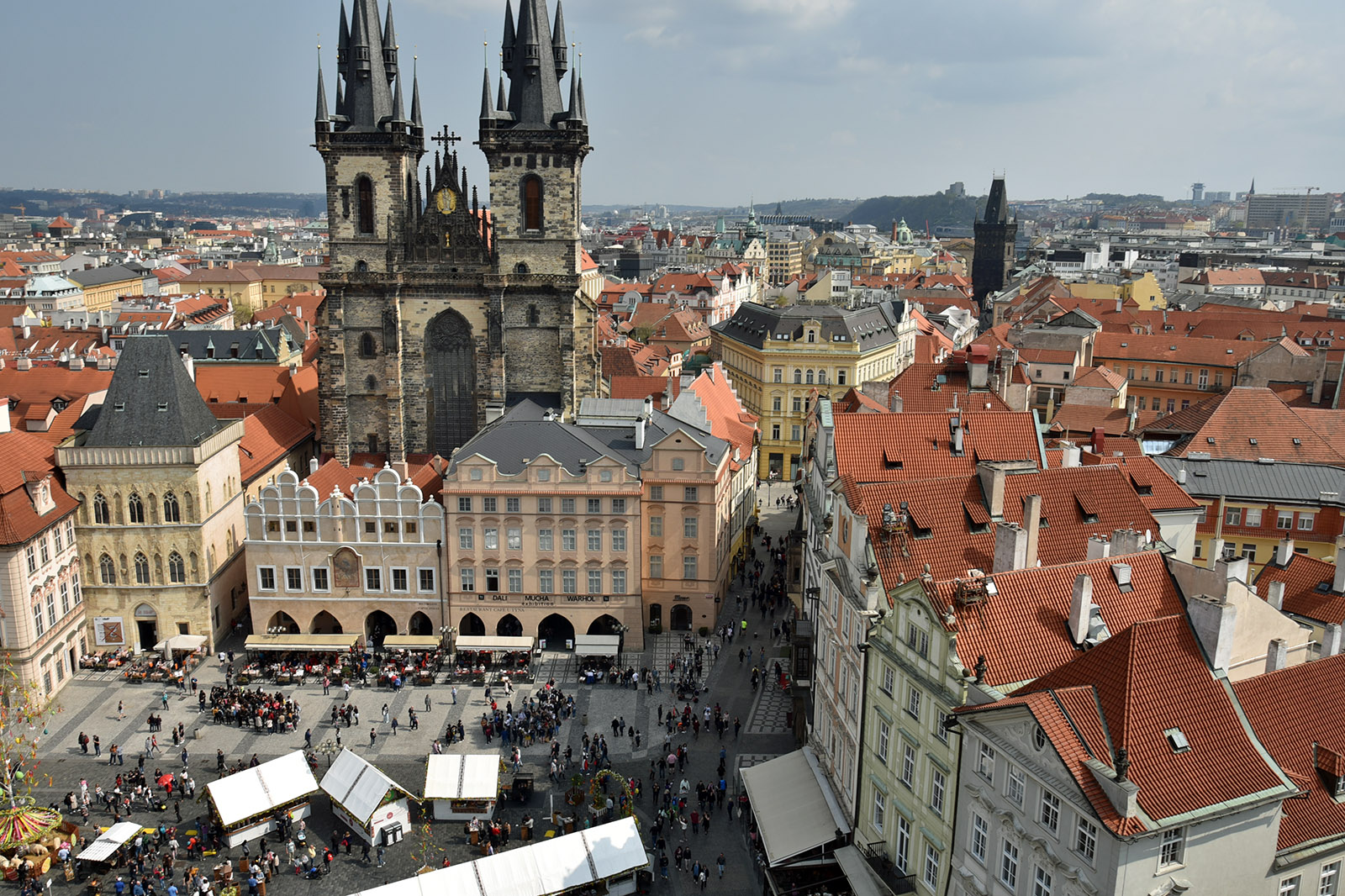 時計塔頂上の展望台から旧市庁舎広場 ヤンフス像、コルツ・キンスキー宮殿
